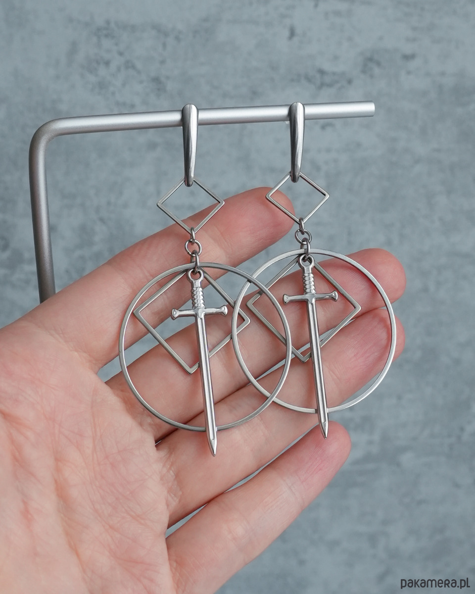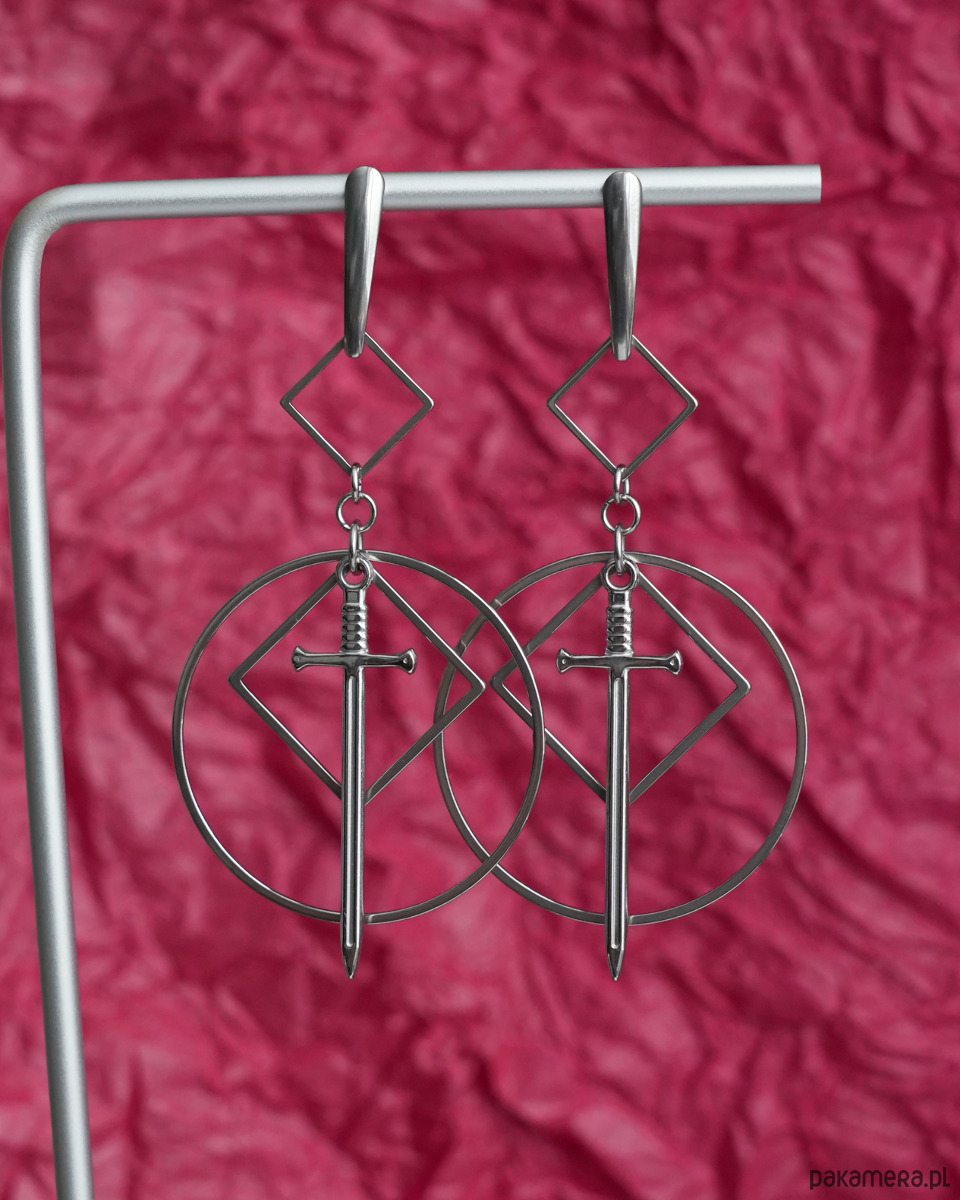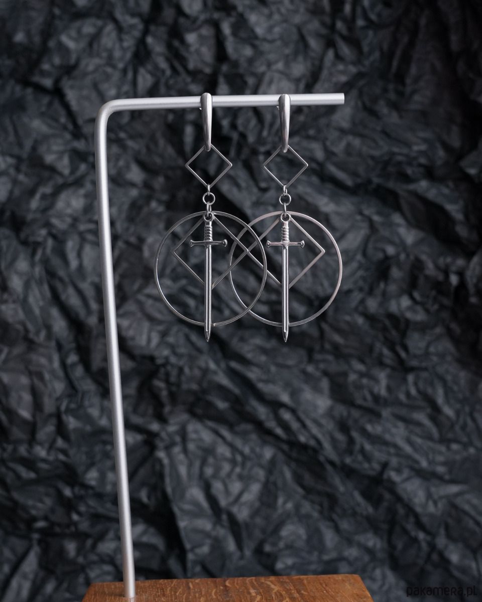 Bardzo efektowne, duże, wiszące kolczyki geometryczne z mieczami, zawieszone na ozdobnych, podłużnych sztyftach. Mega oryginalne, na pewno będą przykuwać wzrok. Świetne dla fanek i fanów alternatywy - stylu modern goth, rock, punk, fantasy, itd.