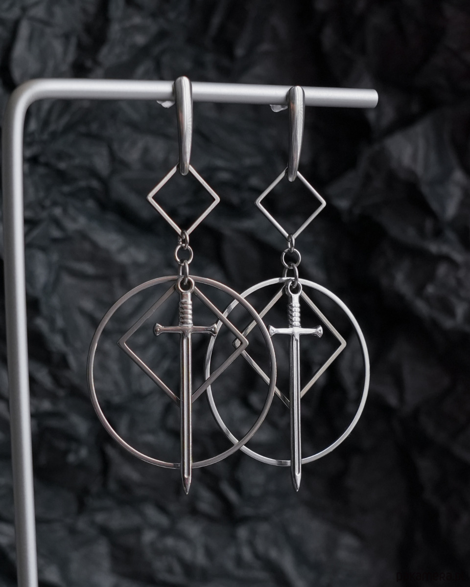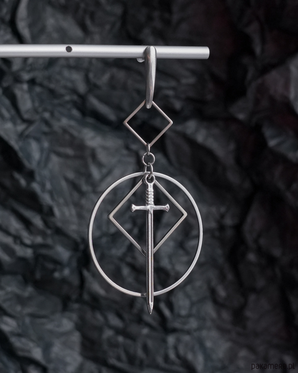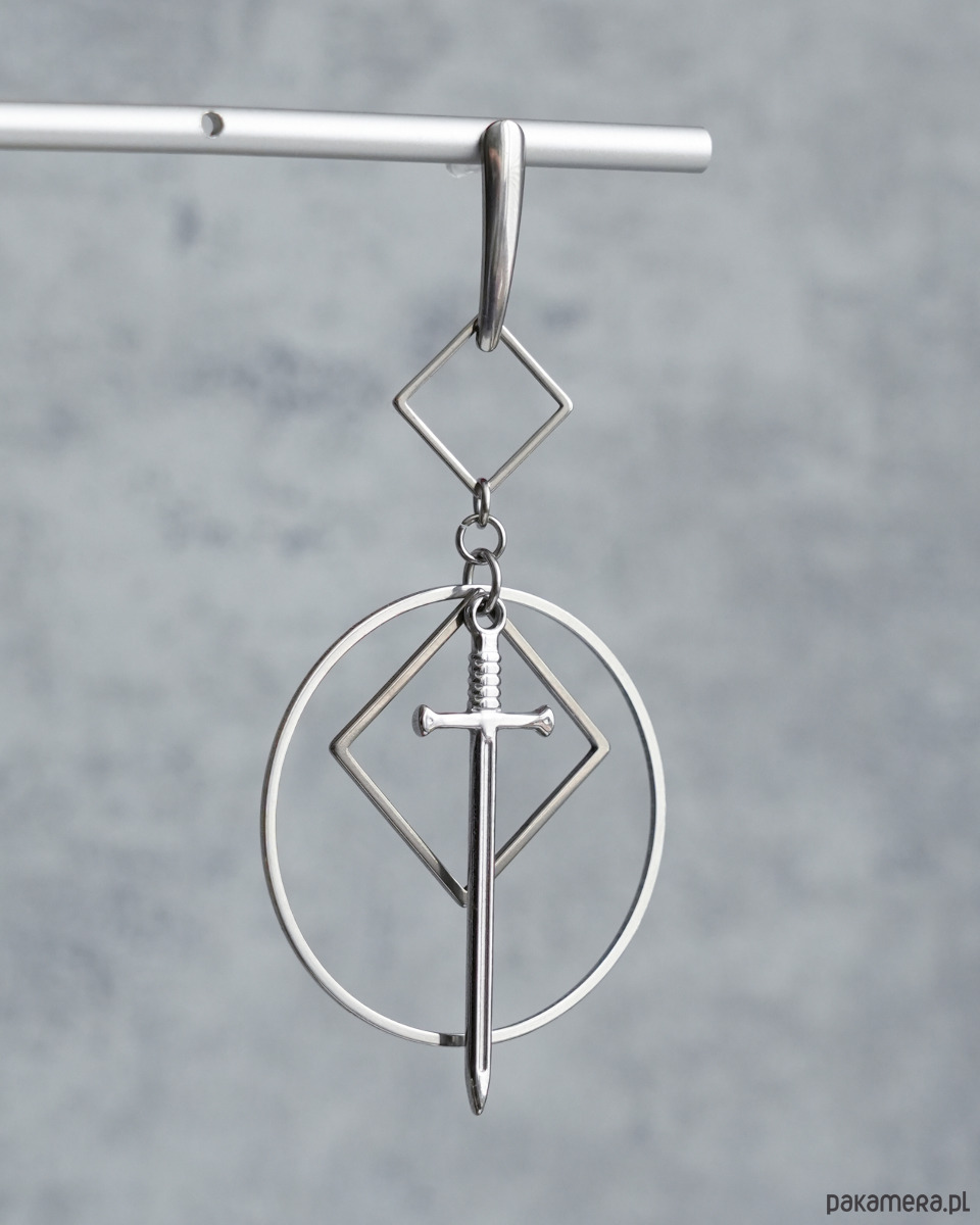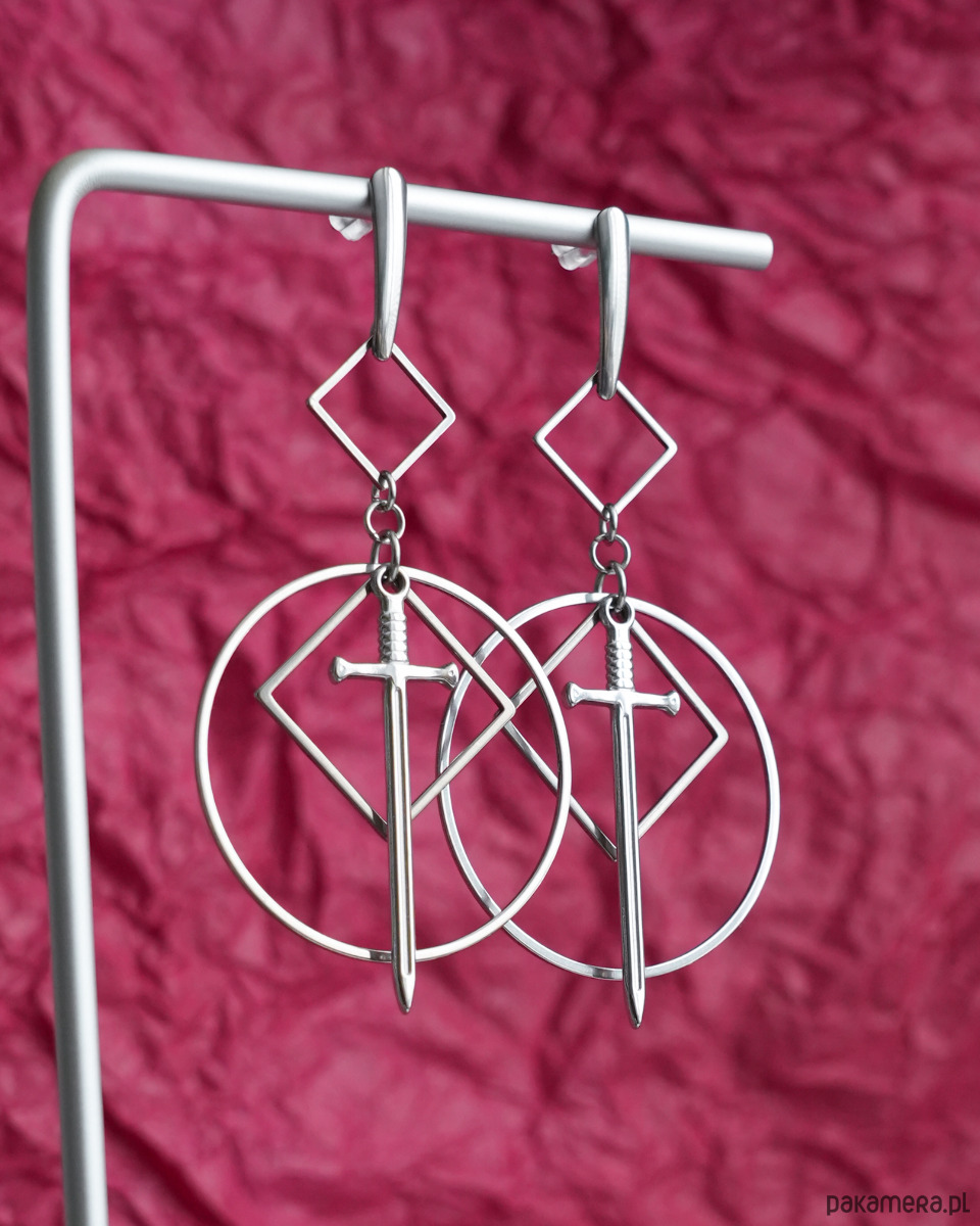 Bardzo efektowne, duże, wiszące kolczyki geometryczne z mieczami, zawieszone na ozdobnych, podłużnych sztyftach. Mega oryginalne, na pewno będą przykuwać wzrok. Świetne dla fanek i fanów alternatywy - stylu modern goth, rock, punk, fantasy, itd.