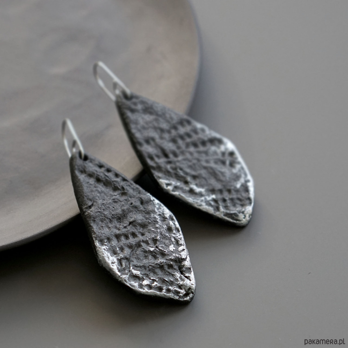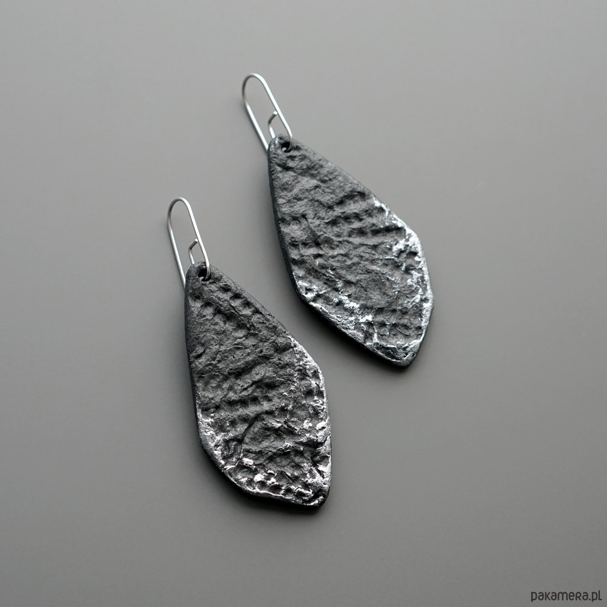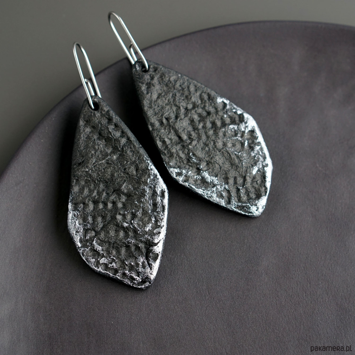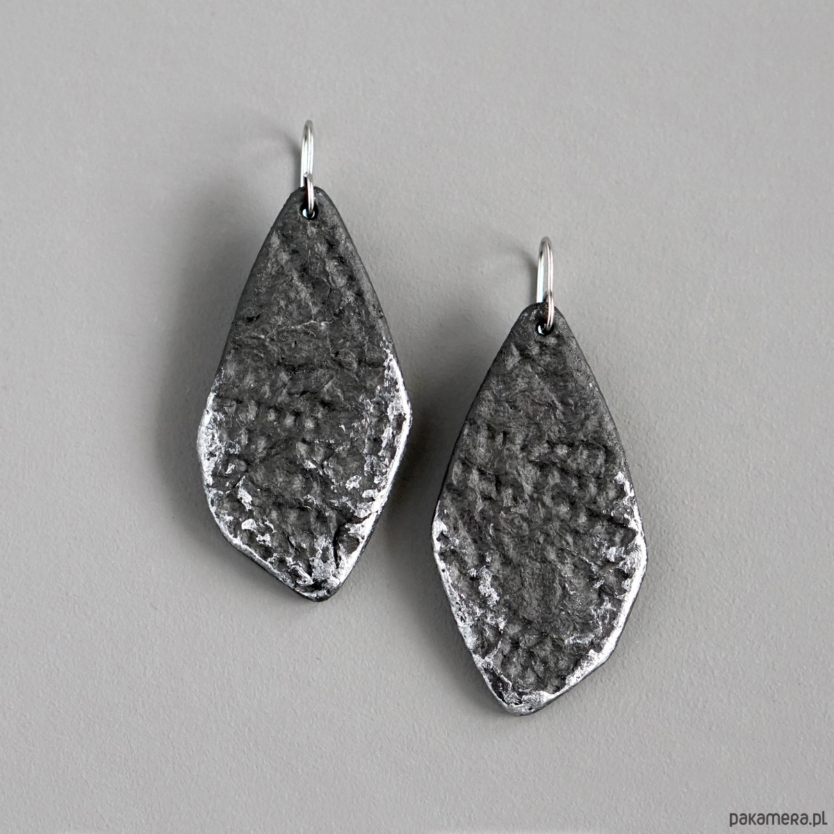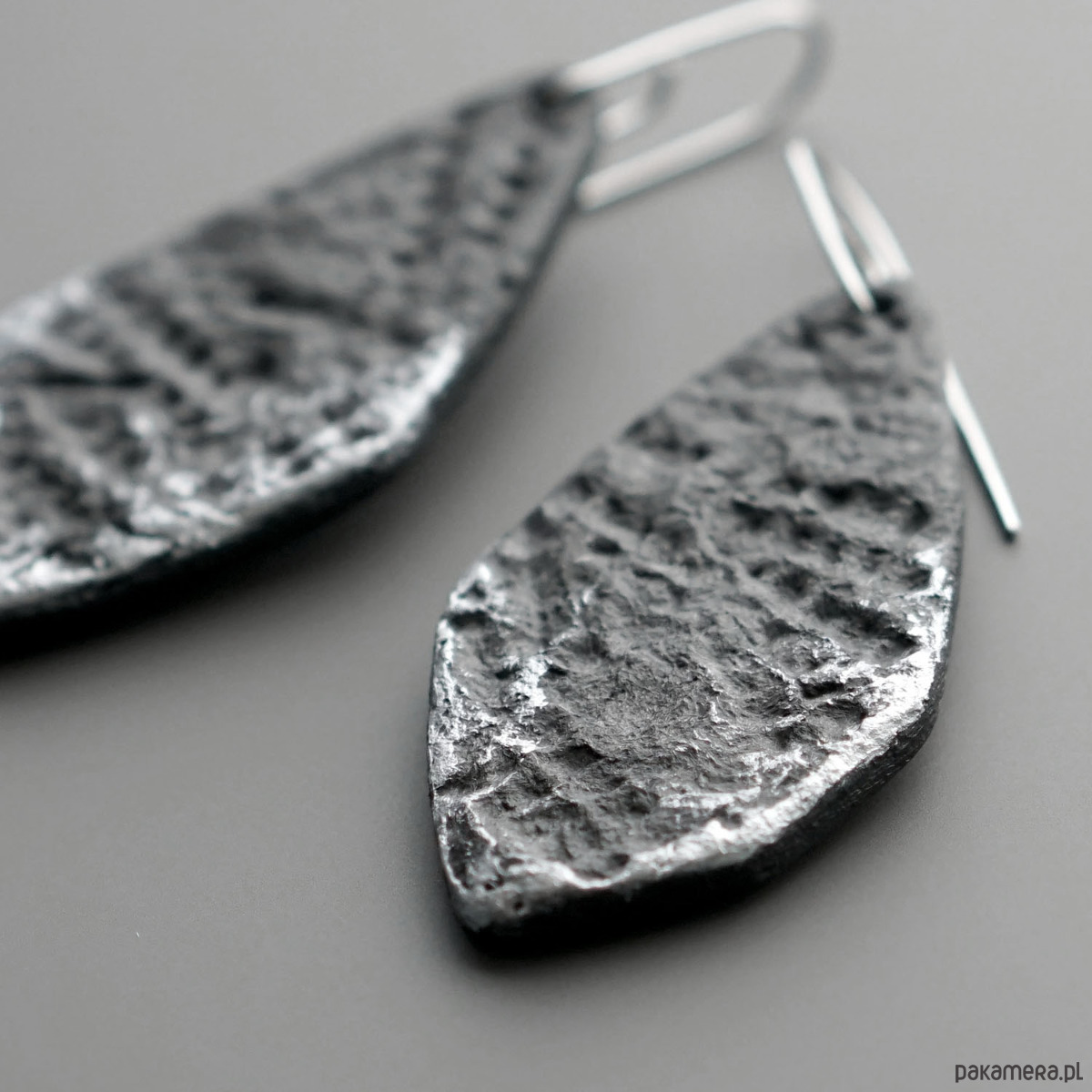 Oryginalne, wiszące kolczyki o nieregularnym kształcie i surowej teksturze.