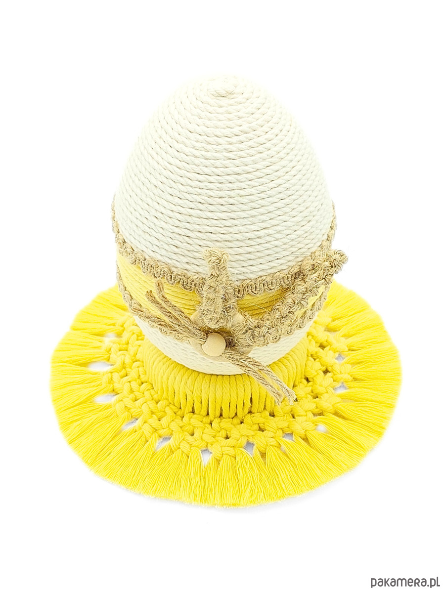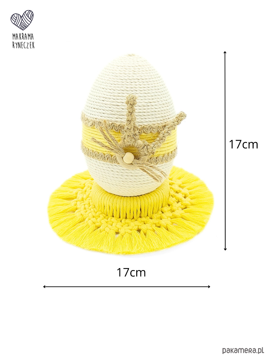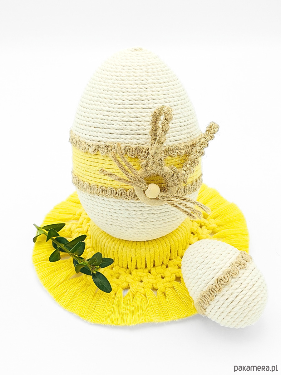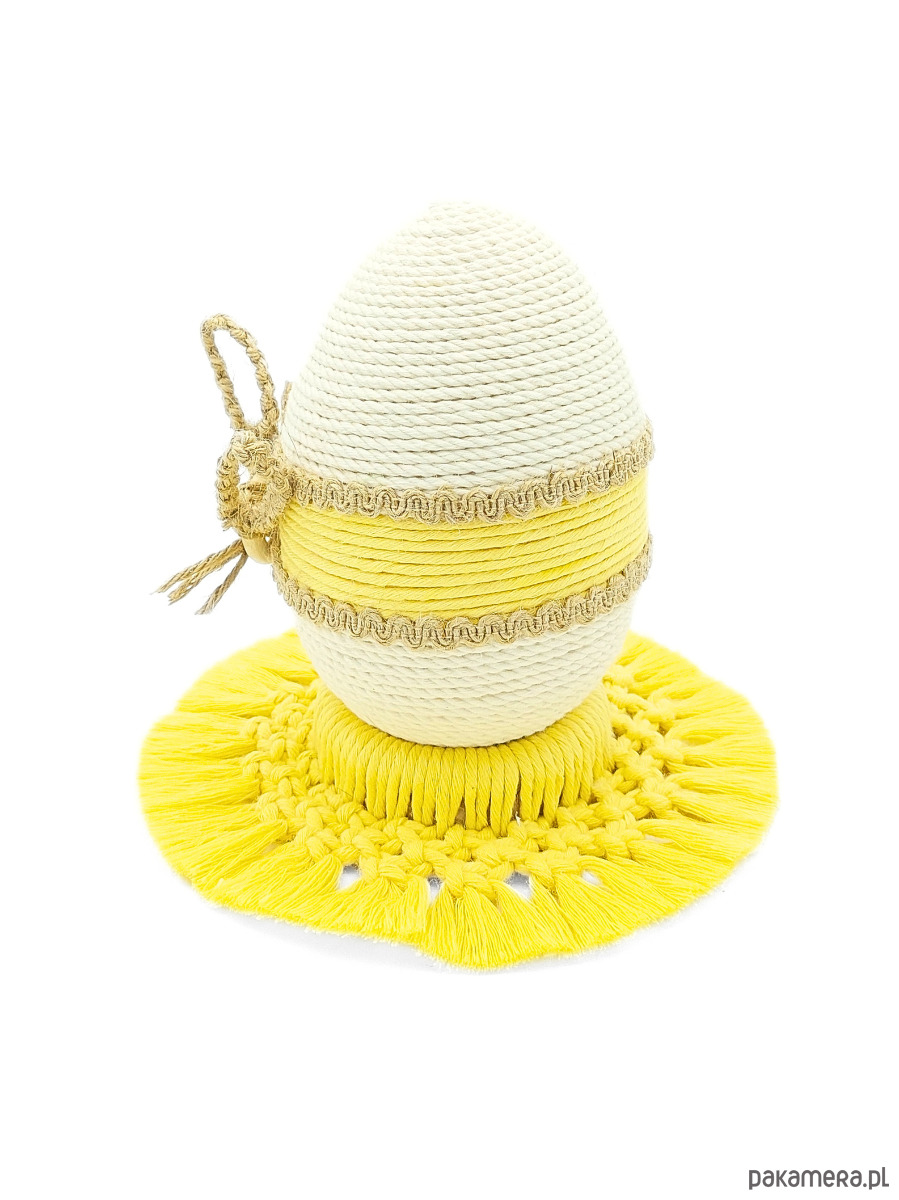 Rozświetl swój wielkanocny stół niepowtarzalną dekoracją- pisanką w stylu makrama. Ta urocza ozdoba wykonana jest z wysokiej jakości bawełnianych sznurków, które tworzą kształt dużego jajka, osadzonego na plecionej podstawce. Zestawienie naturalnego koloru sznurka z żółtym nadaje sielskiego charakteru, a jutowa wstążka doskonale oddziela te dwa odcienie. Dodatkowym elementem ozdobnym jest mały zając zrobiony z jutowego sznurka. Umieszczony na środku jajka, nadaje całości uroku i świątecznego klimatu.