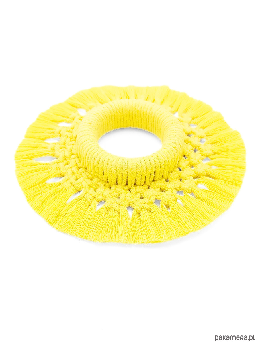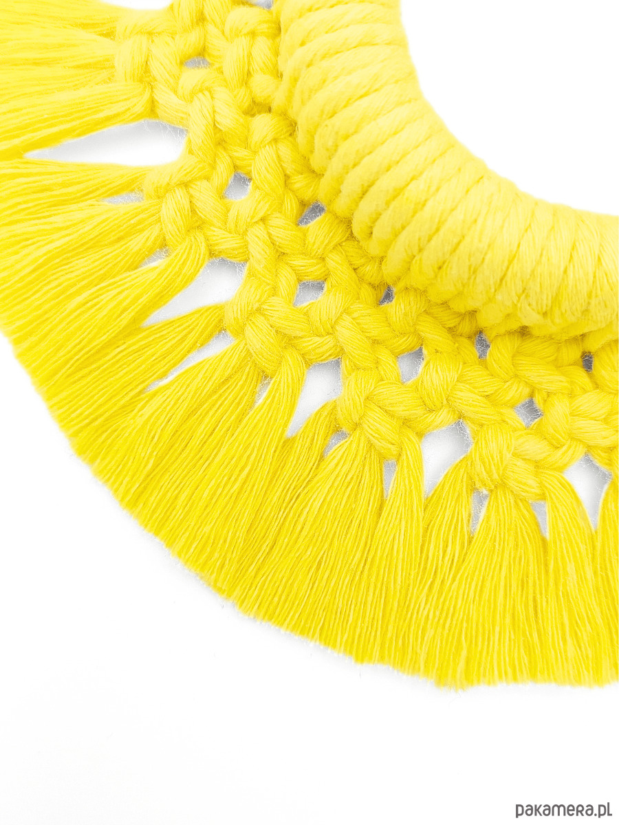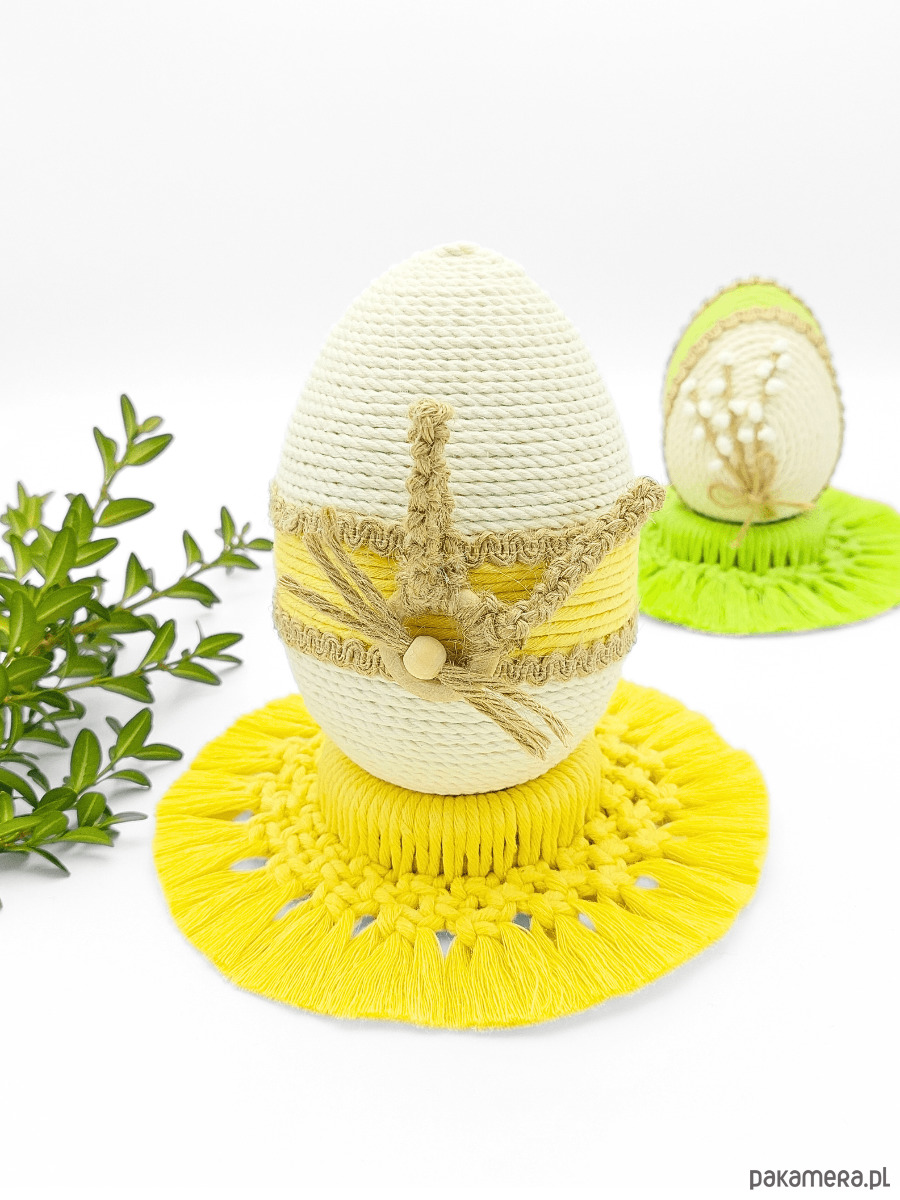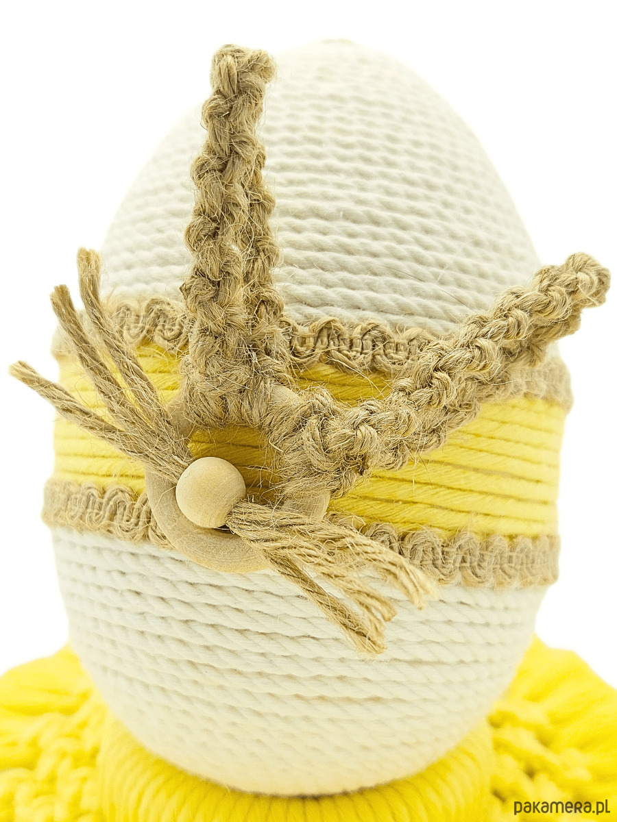 Rozświetl swój wielkanocny stół niepowtarzalną dekoracją- pisanką w stylu makrama. Ta urocza ozdoba wykonana jest z wysokiej jakości bawełnianych sznurków, które tworzą kształt dużego jajka, osadzonego na plecionej podstawce. Zestawienie naturalnego koloru sznurka z żółtym nadaje sielskiego charakteru, a jutowa wstążka doskonale oddziela te dwa odcienie. Dodatkowym elementem ozdobnym jest mały zając zrobiony z jutowego sznurka. Umieszczony na środku jajka, nadaje całości uroku i świątecznego klimatu.