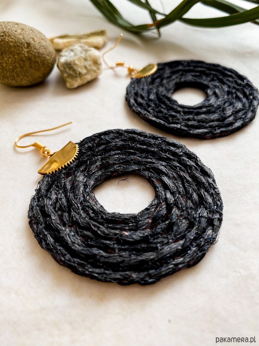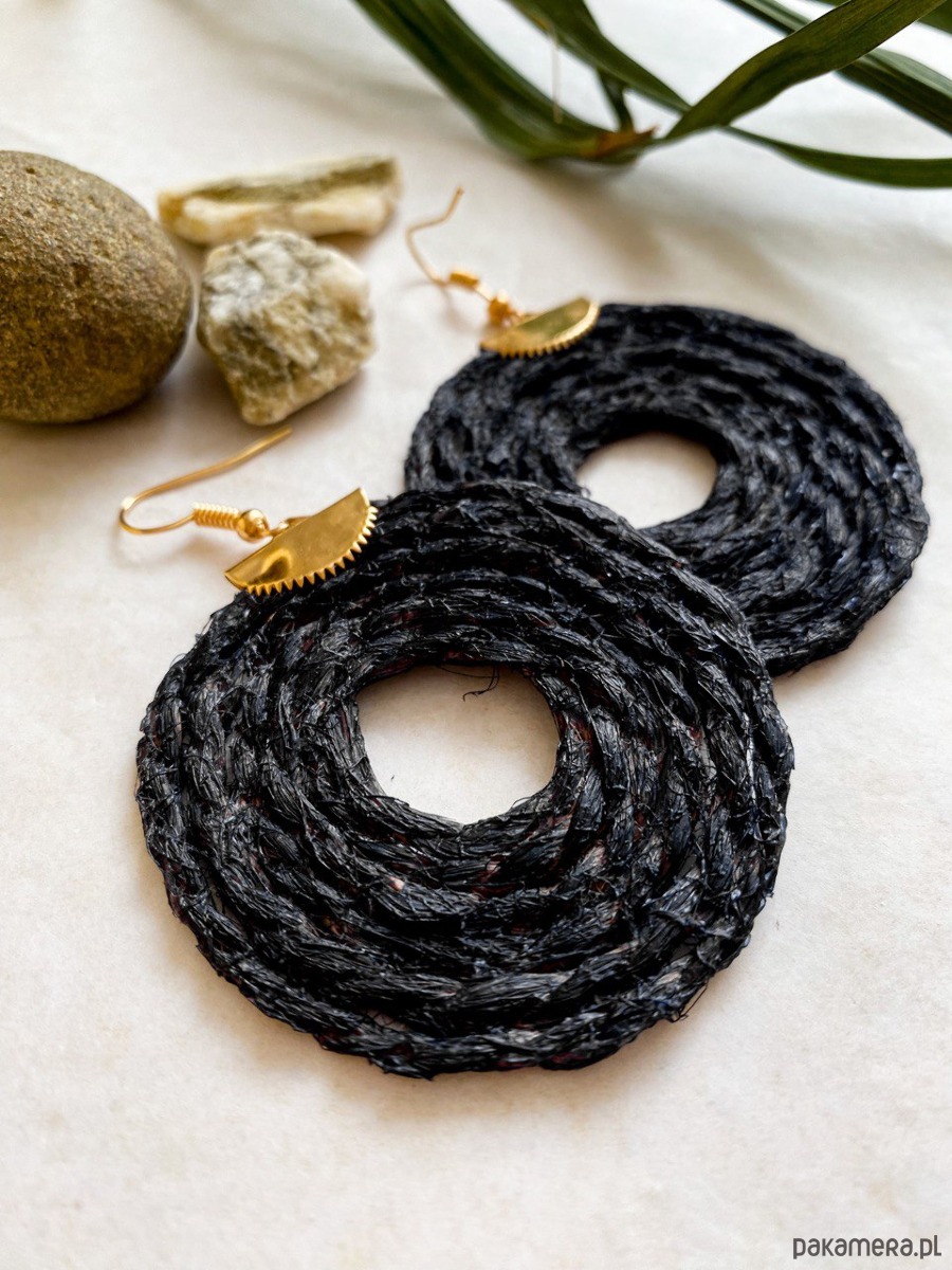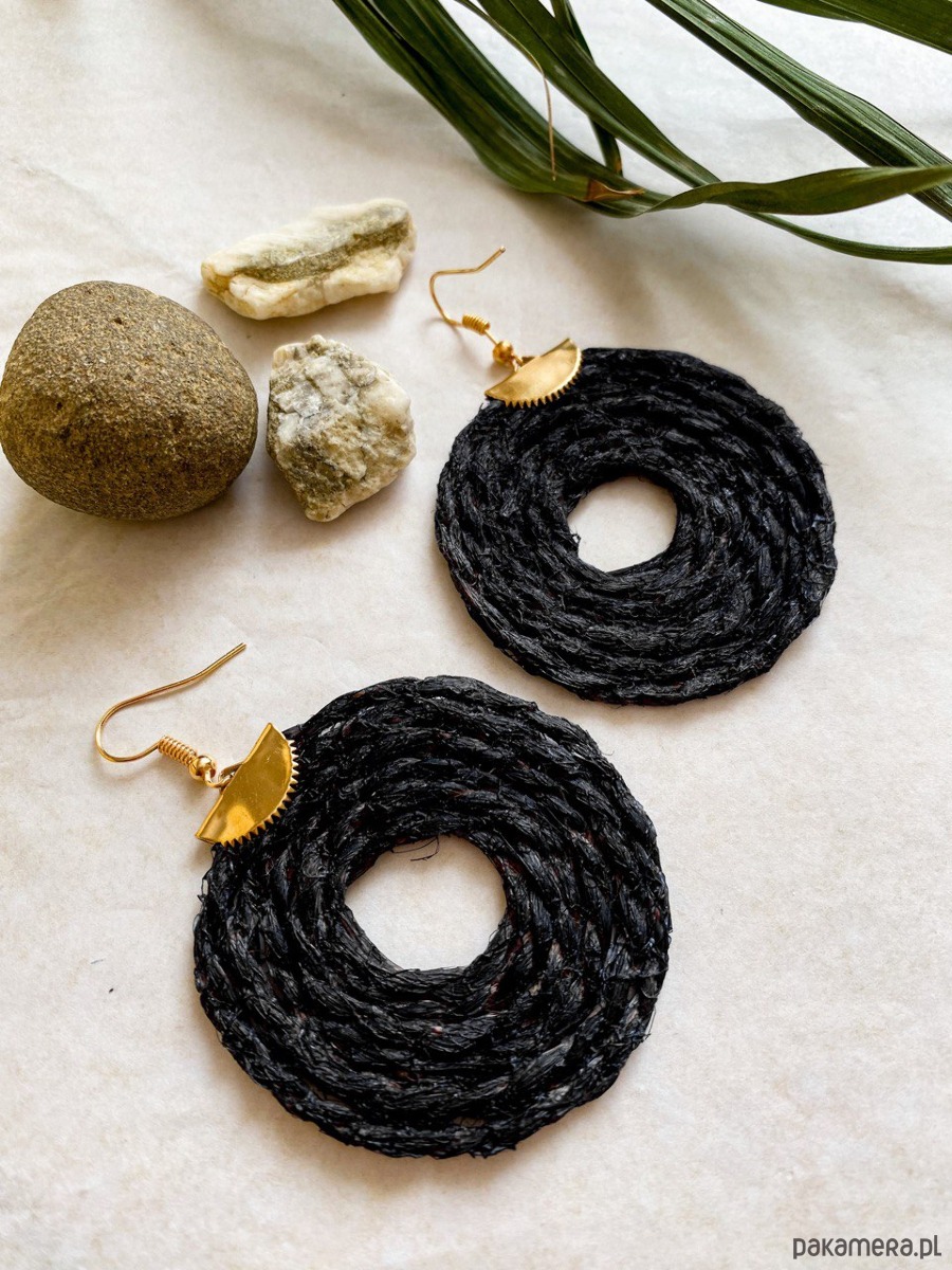Duże, okrągłe kolczyki z juty w stylu boho.