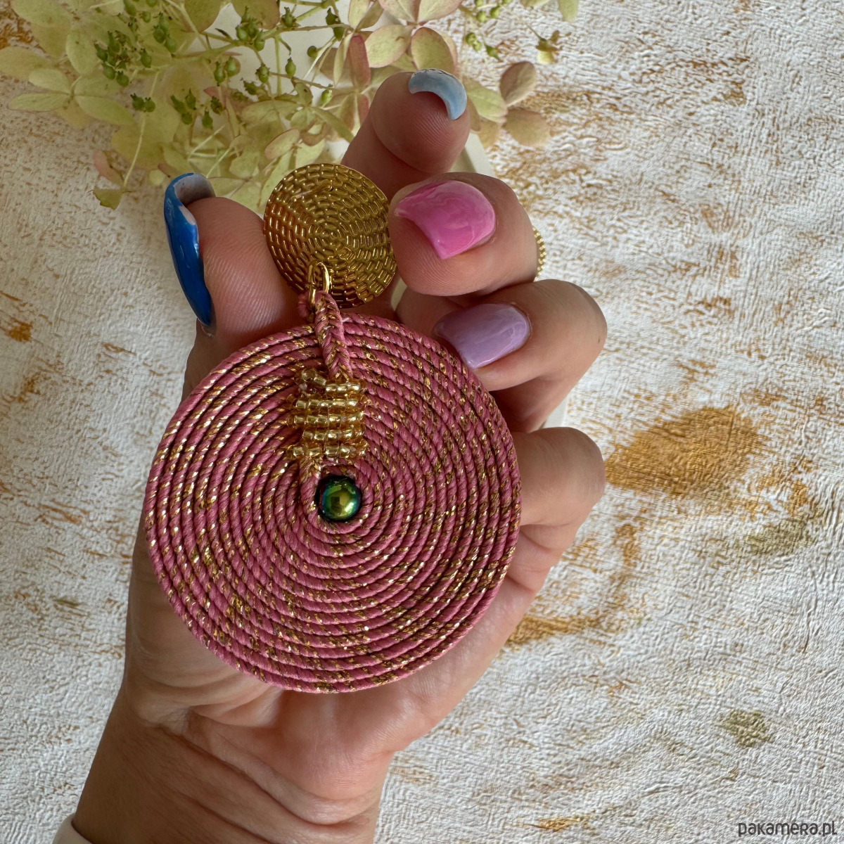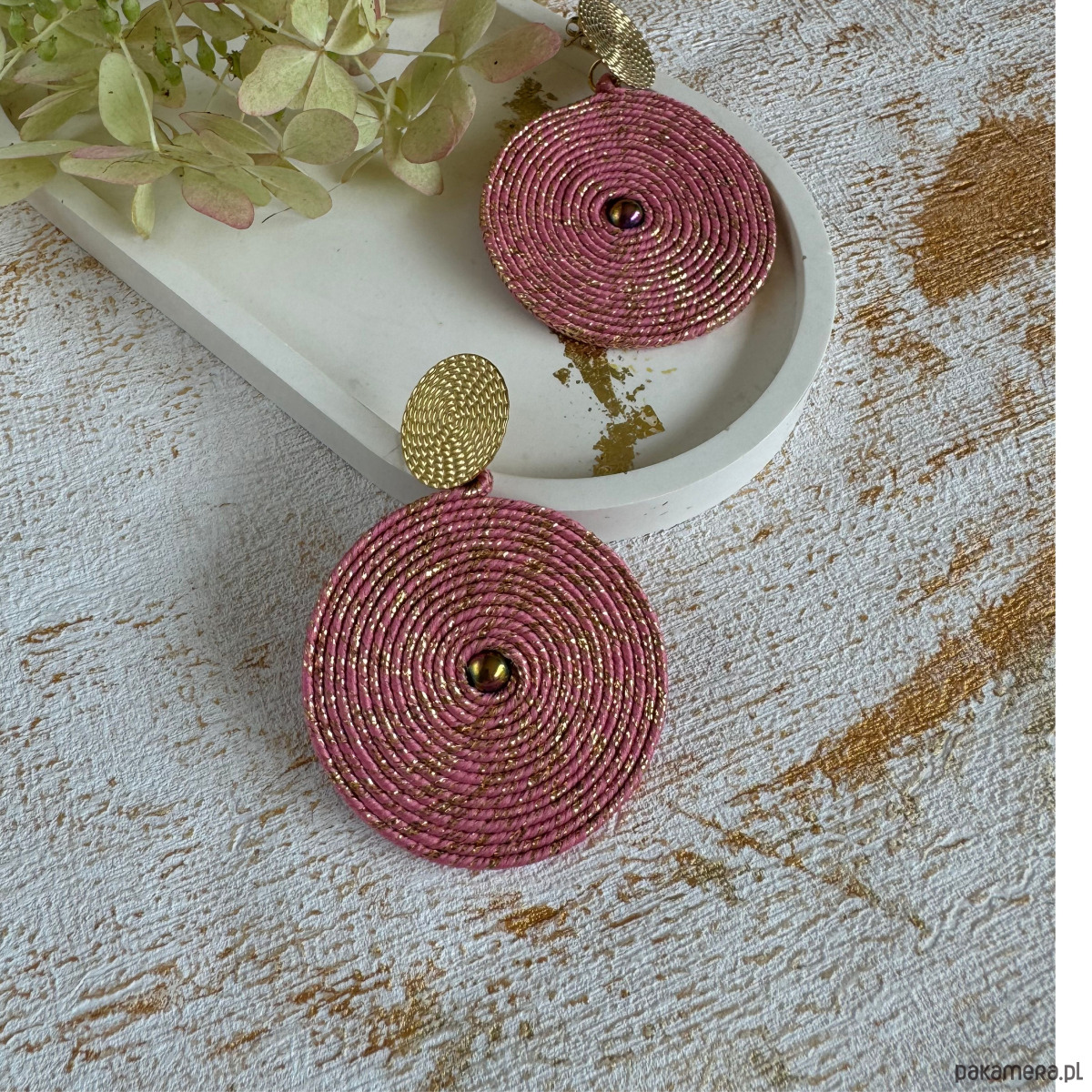 *Kolczyki w kolorze delikatnego różu ze złotą nitką.