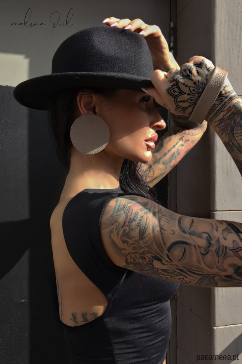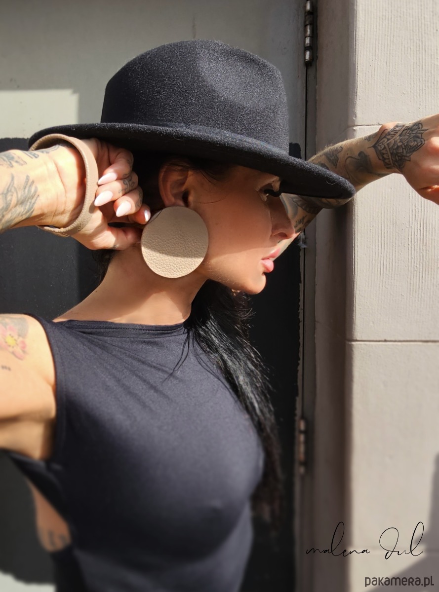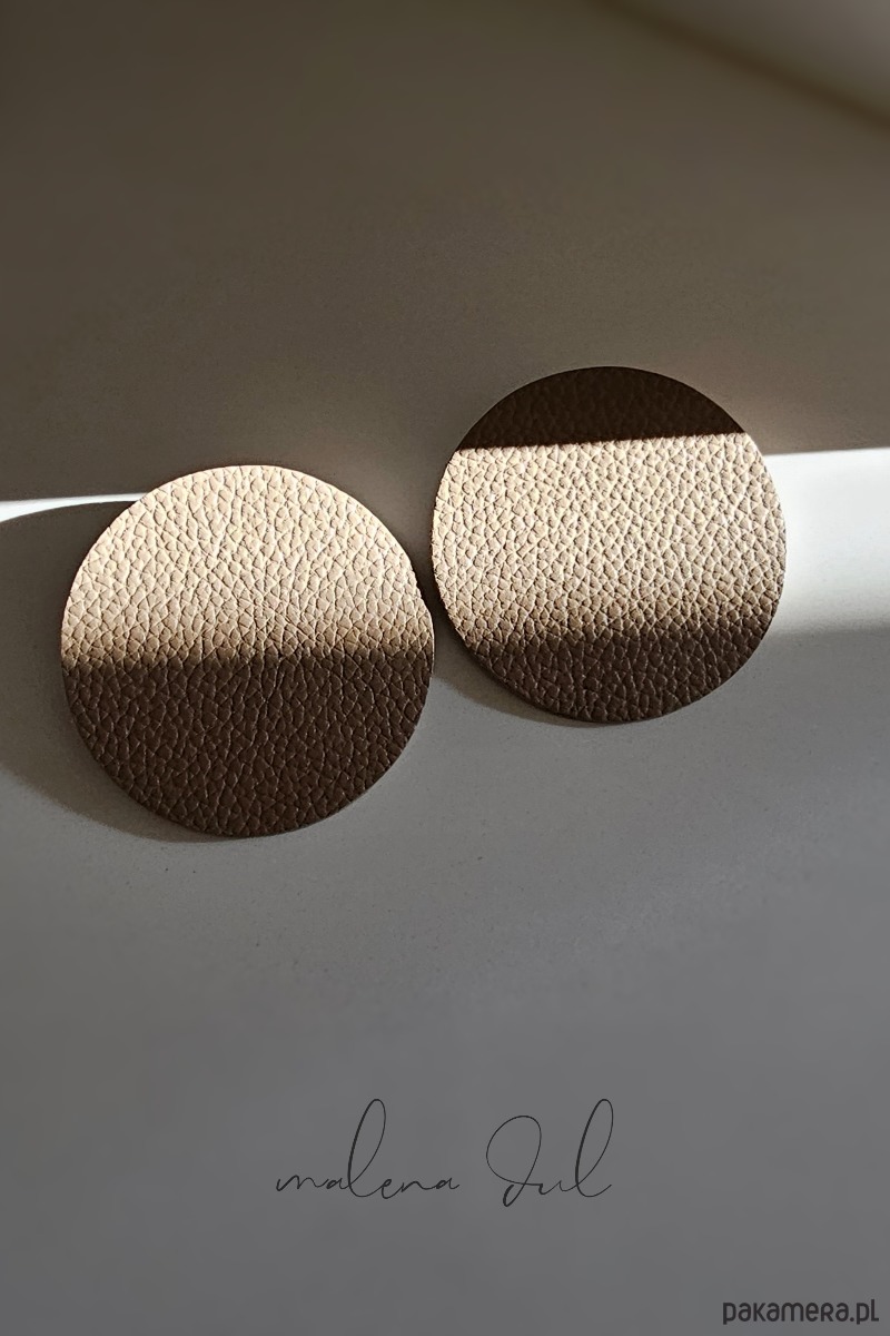 Wersja XXL kolekcja SUN. Duże, ogeometryczne kolczyki, wykonane ze skóry naturalnej w ksztalcie kola. Klasyczne i bardzo eleganckie. Swoją formą przywodzą w pamięci odważne lata 80te. Pięknie komponują się z prostymi w formie stylizacjami. Sprawdzą się jako niebanalny dodatek to prostego t-shirtu i jeansow, golfu, koszuli czy garnituru.