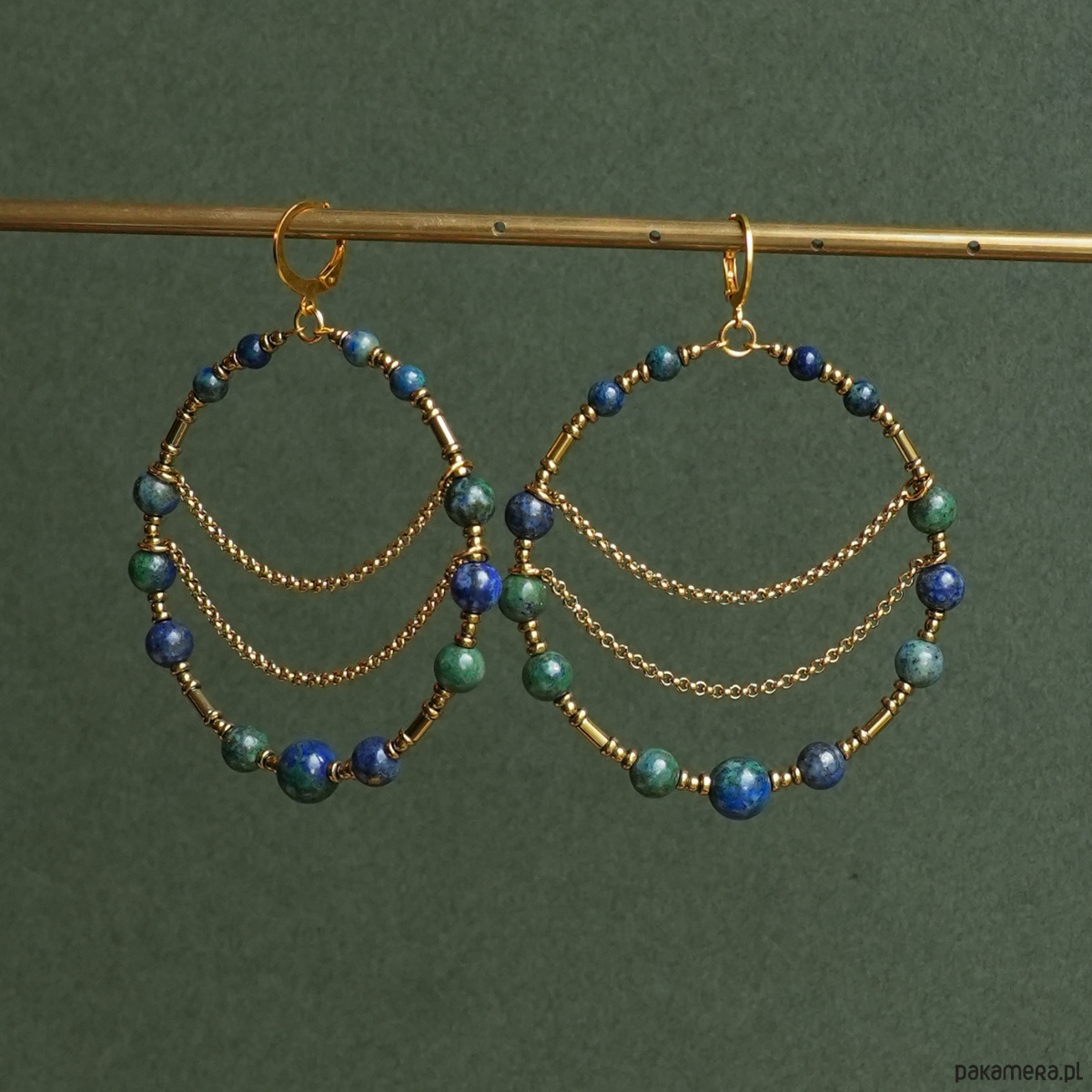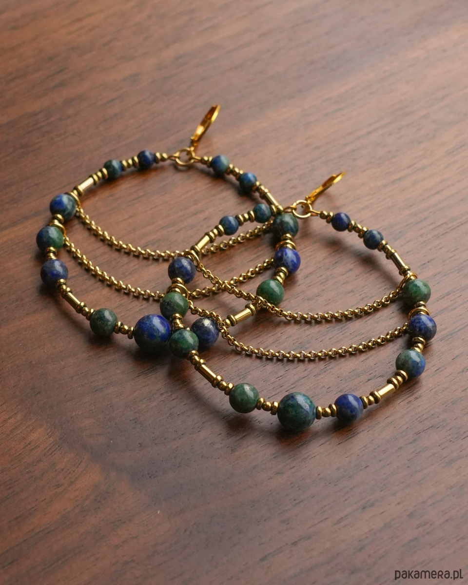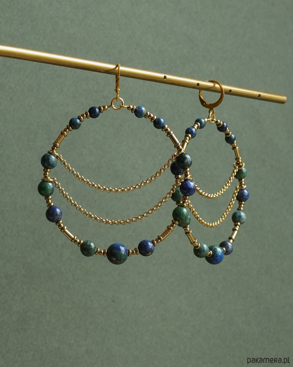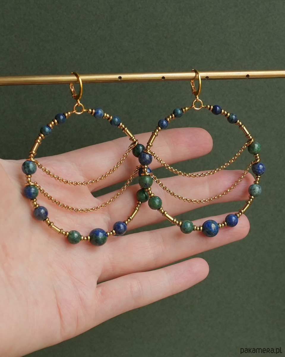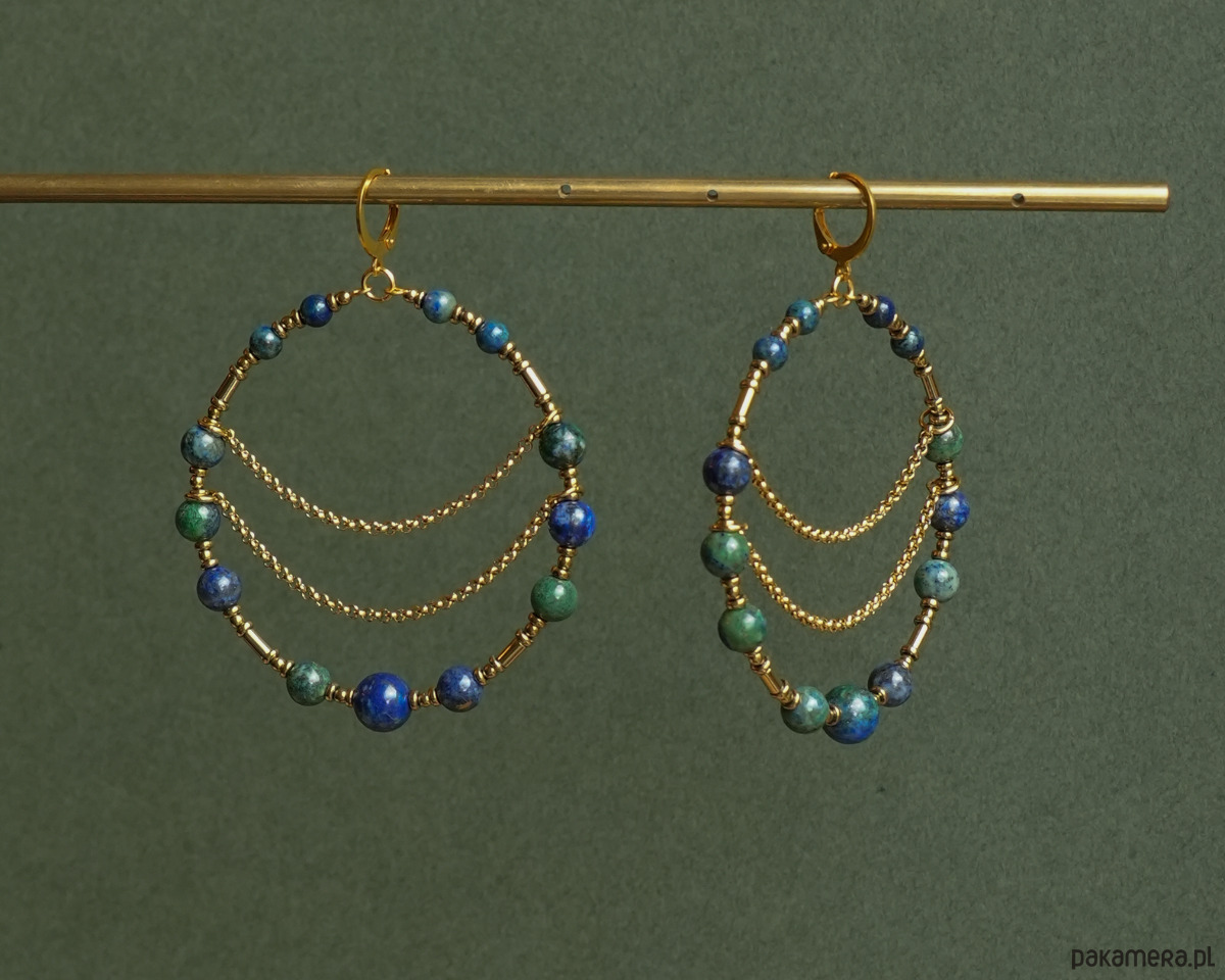 Piękne, unikatowe i bardzo efektowne, duże kolczyki koła z łańcuszkami, wykonane z zielono-niebieskich kamieni CHRYZOKOLA i AZURYT oraz złotego HEMATYTU. Do noszenia na co dzień i na specjalne okazje. Na pewno będą przykuwać wzrok :)
