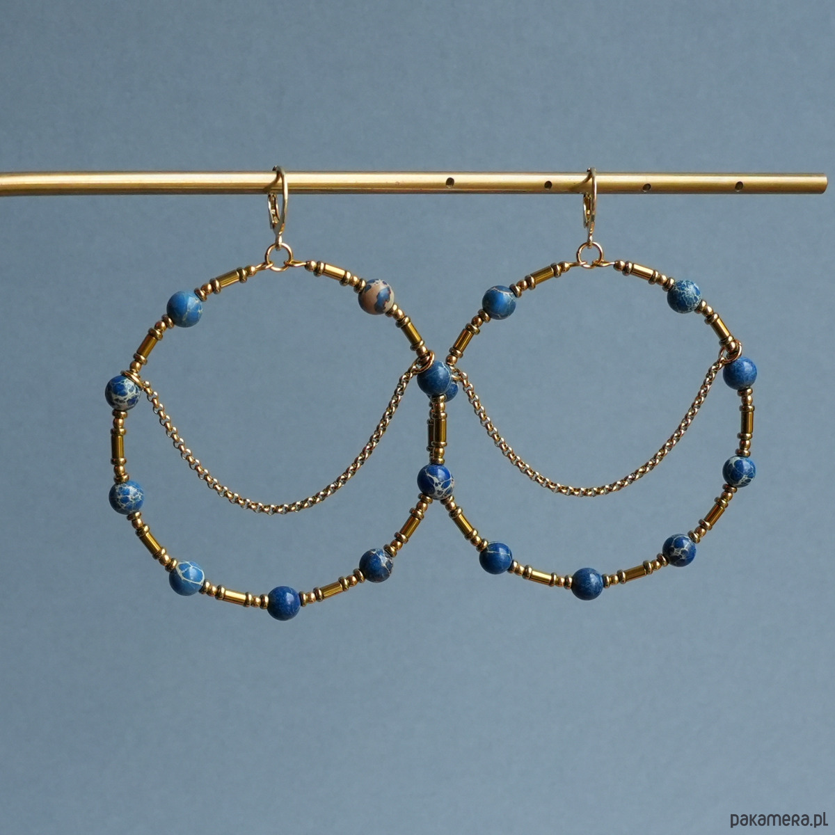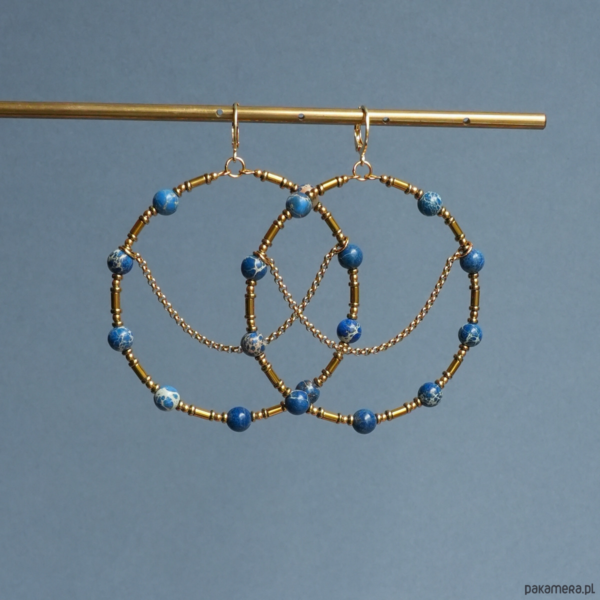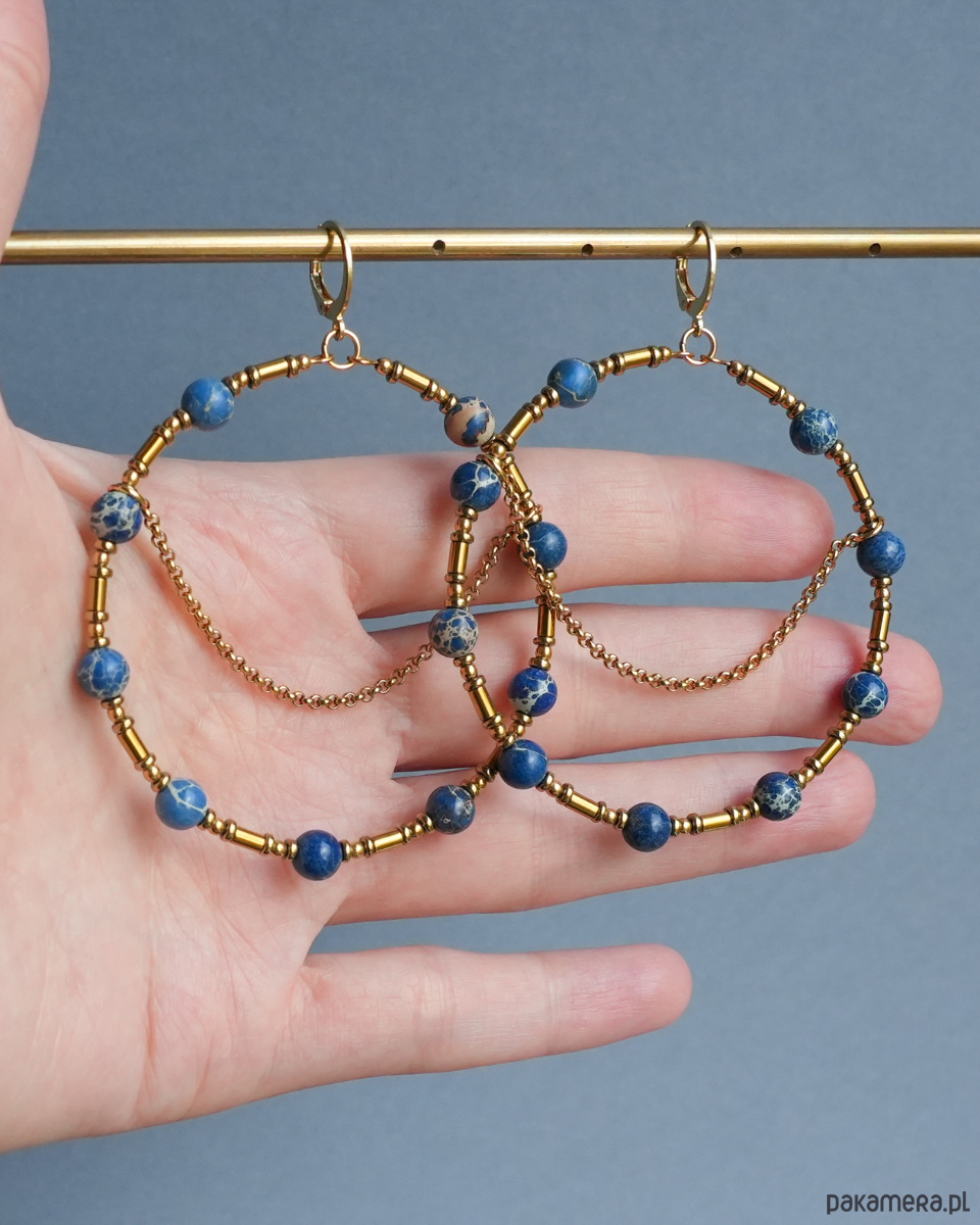 Duże i efektowne kolczyki koła z łańcuszkami, wykonane z niebiesko-kremowych kamieni JASPIS CESARSKI oraz złotego HEMATYTU. Do noszenia na co dzień i na specjalne okazje. Na pewno będą przykuwać wzrok :)