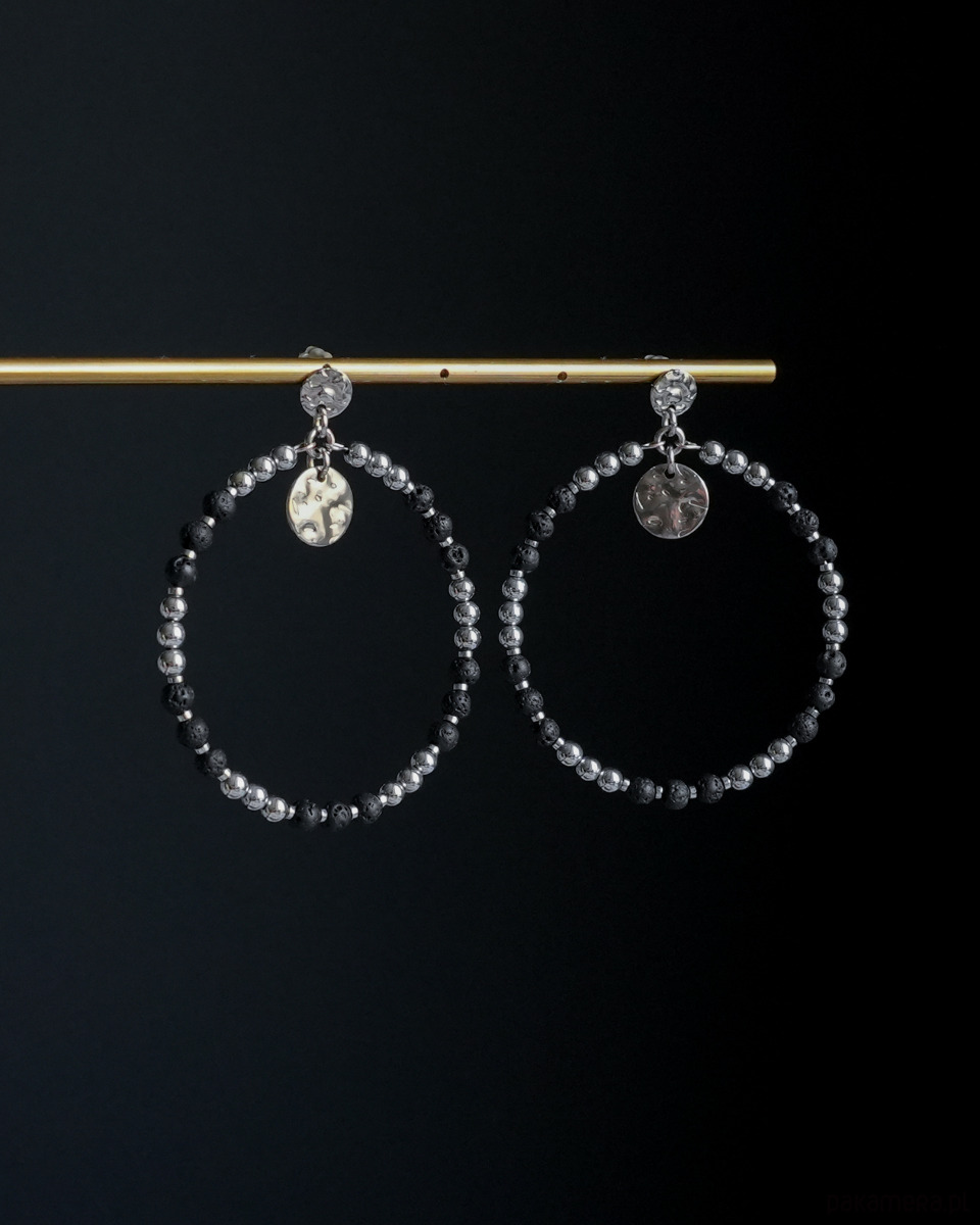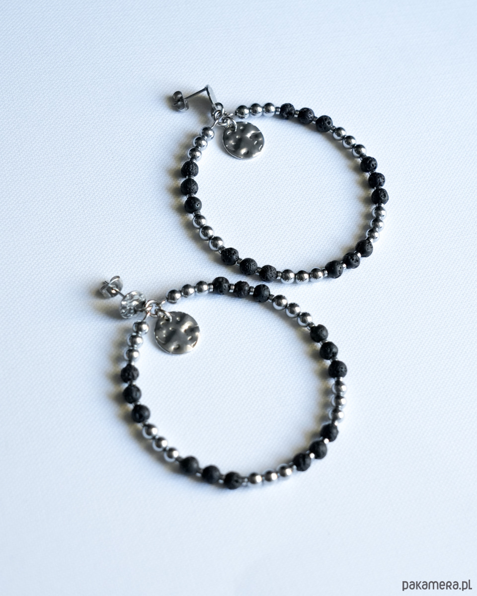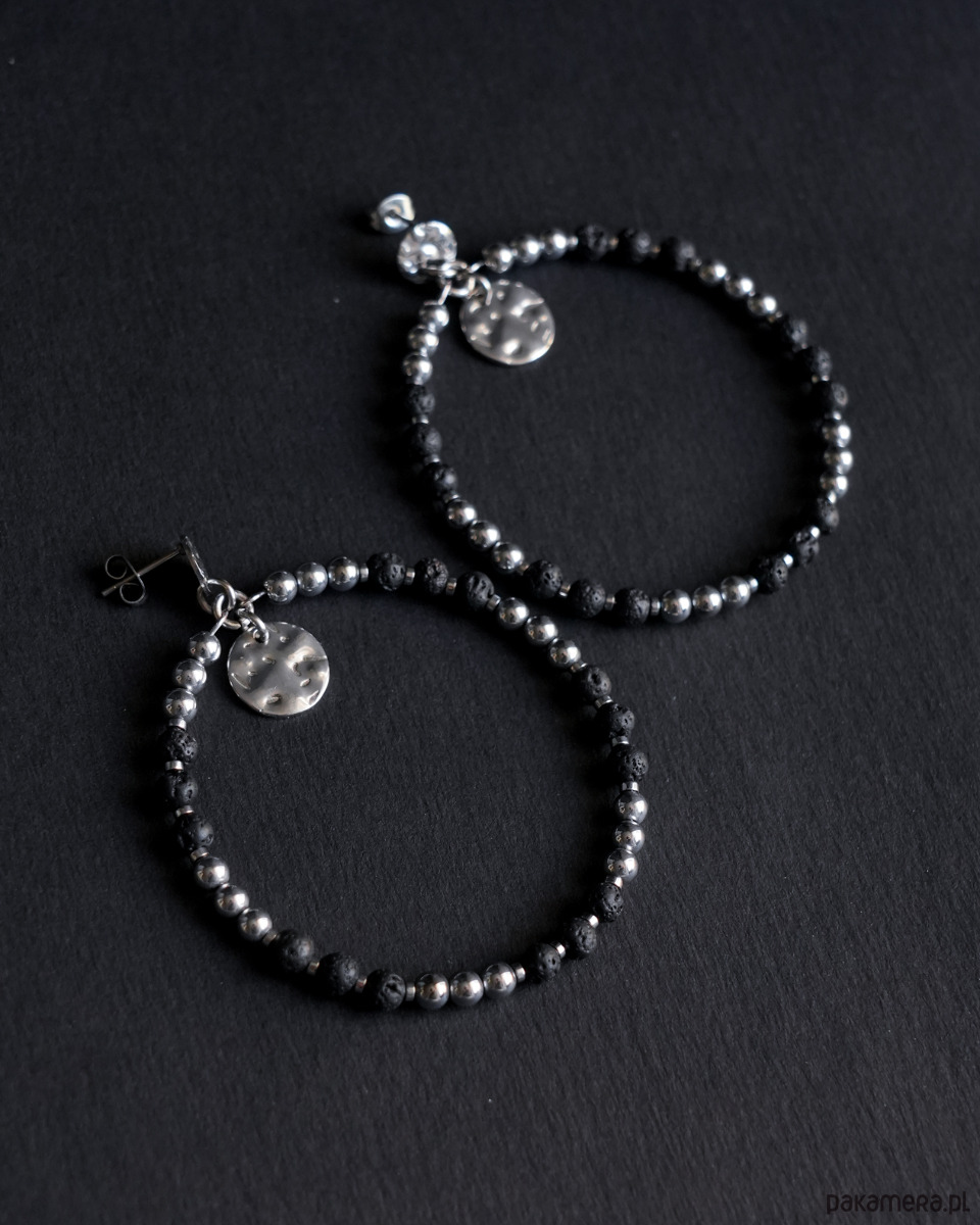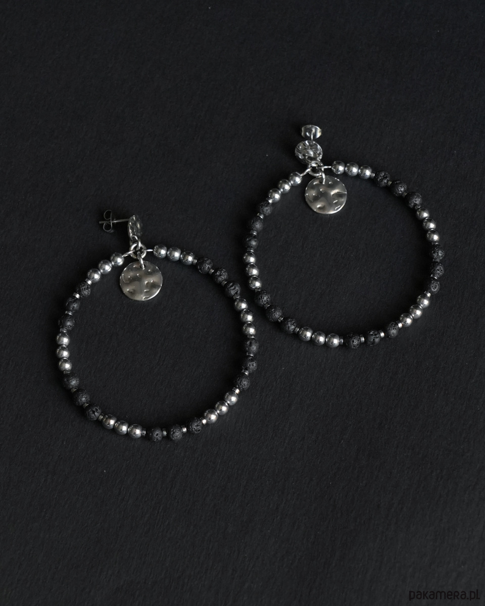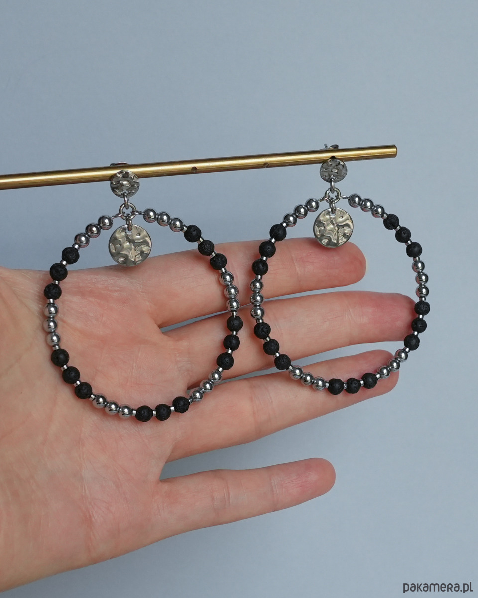 Duże, efektowne, czarno-srebrne kolczyki koła wykonane z surowej LAWY WULKANICZNEJ i HEMATYTU. Kolczyki są zawieszone na ozdobnych sztyftach z blaszkami o nieregularnej powierzchni, wykonanymi ze STALI SZLACHETNEJ w kolorze srebrnym. Dodatkowe, wiszące okrągłe blaszki to również stal szlachetna.