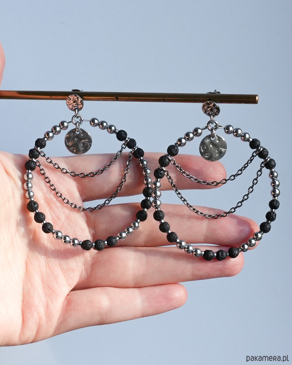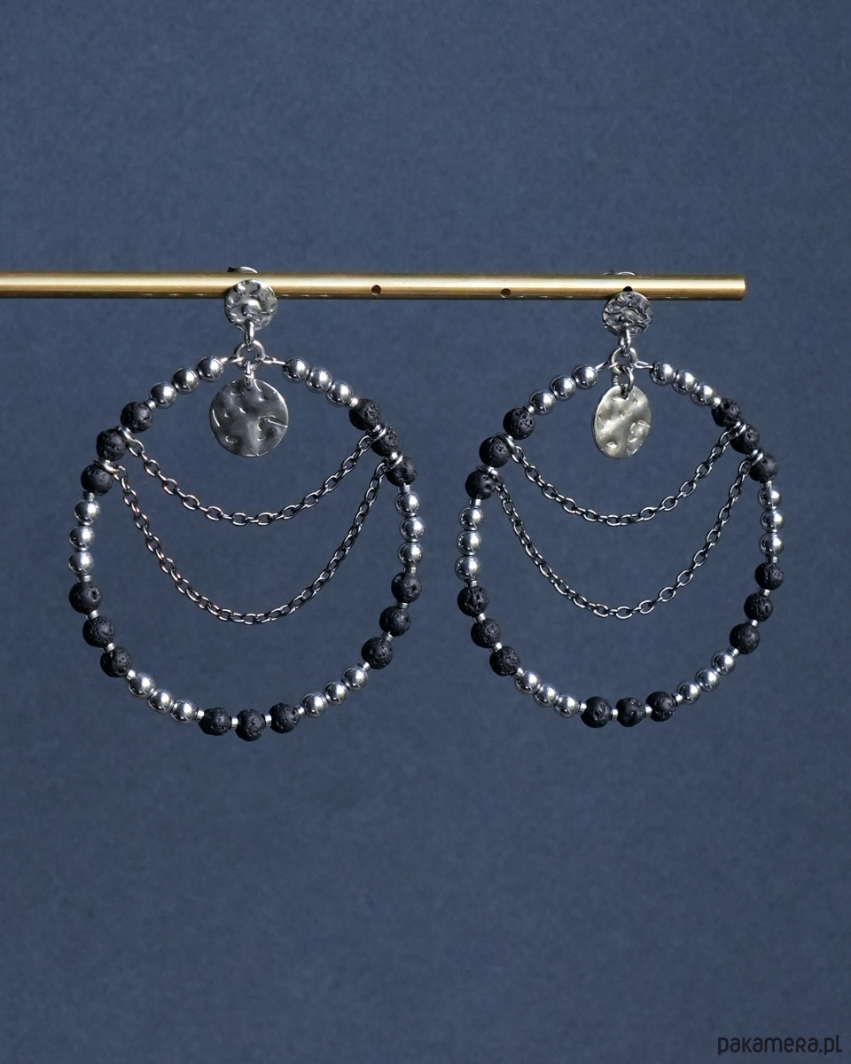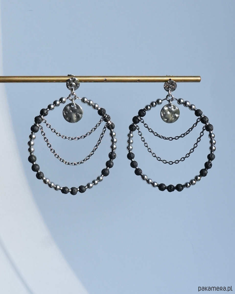 Duże, efektowne, czarno-srebrne kolczyki koła wykonane z surowej LAWY WULKANICZNEJ i HEMATYTU. Kolczyki są zawieszone na ozdobnych sztyftach z blaszkami o nieregularnej powierzchni, wykonanymi ze STALI SZLACHETNEJ w kolorze srebrnym. Dodatkowe, wiszące okrągłe blaszki to również stal szlachetna. Łańcuszki są w kolorze antracytowym.