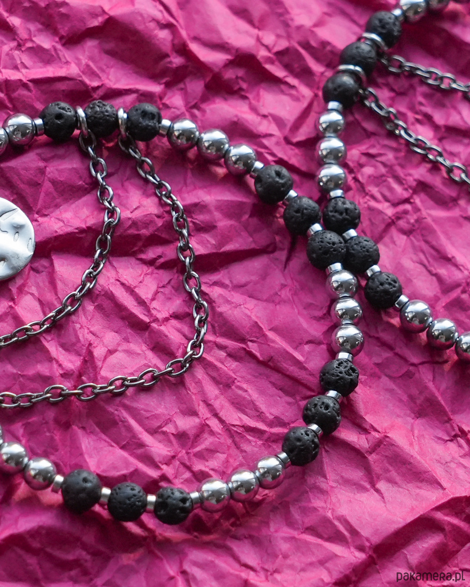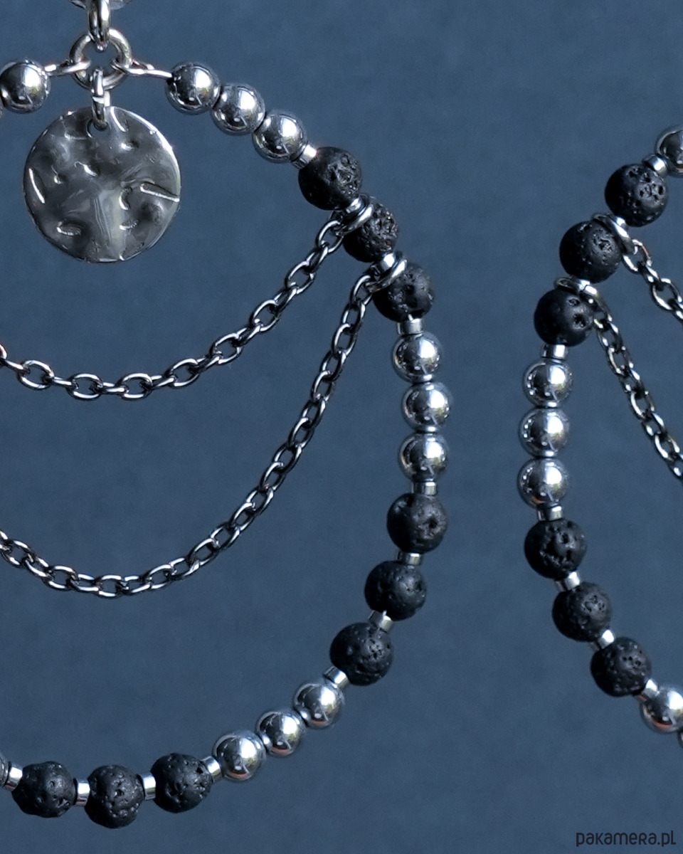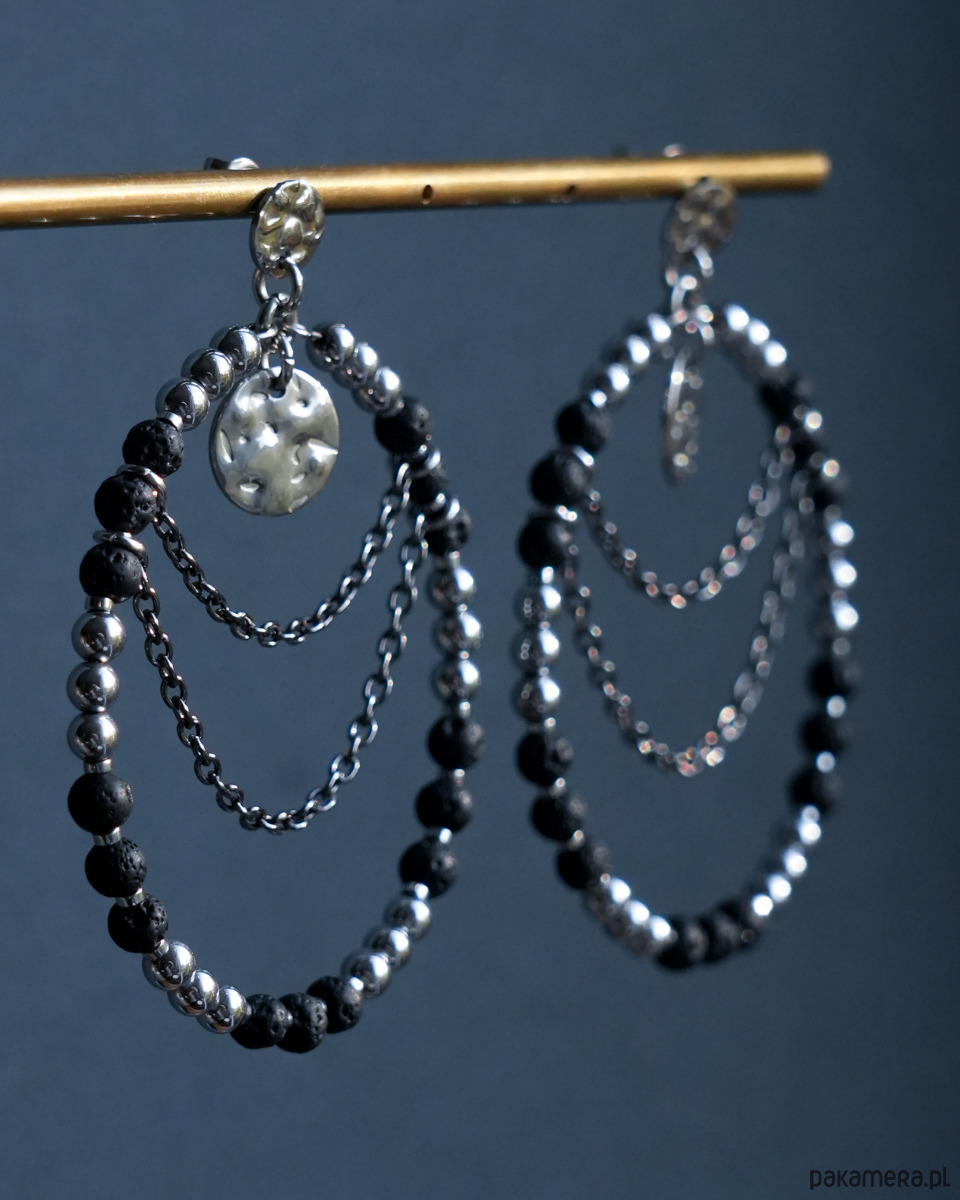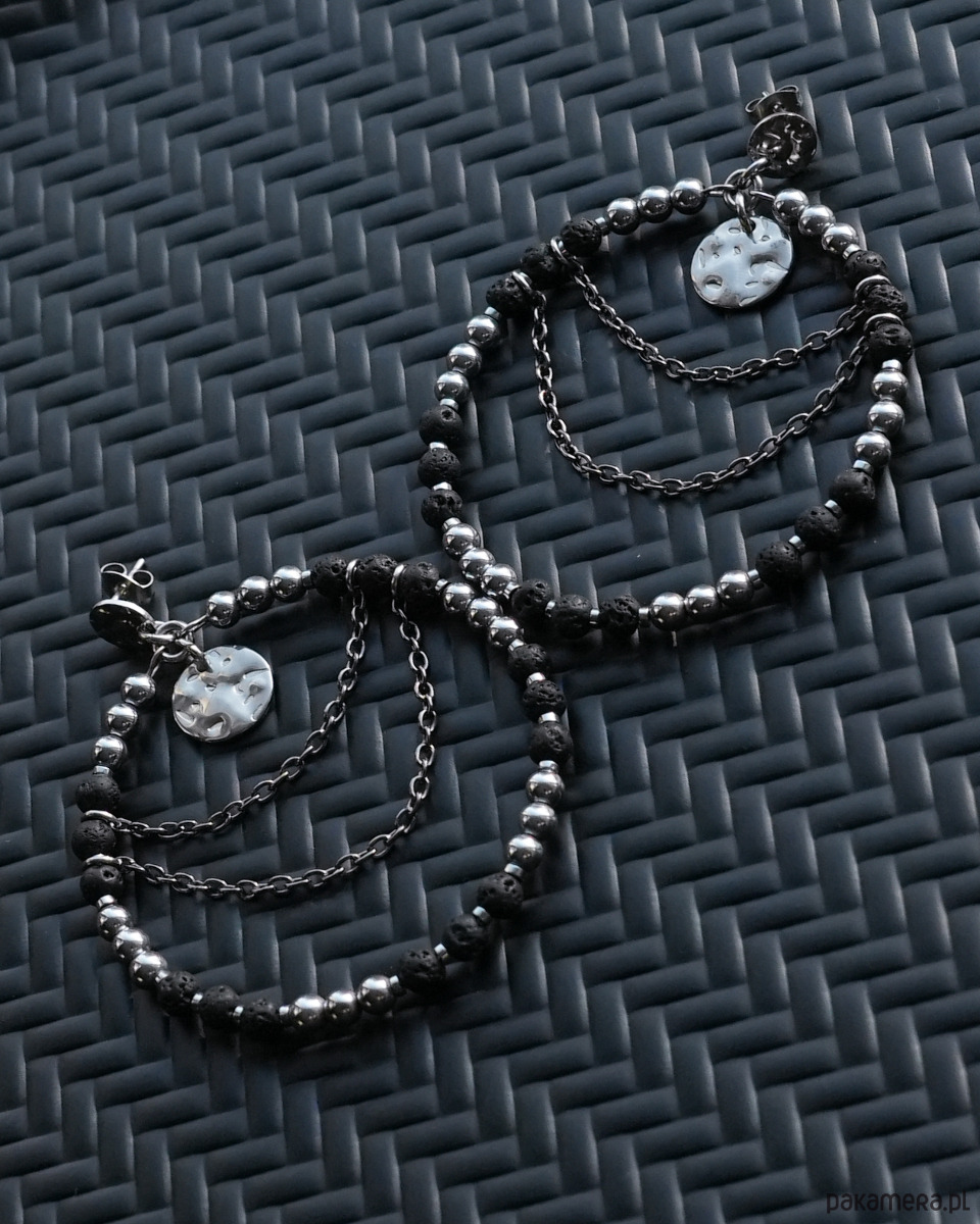 Duże, efektowne, czarno-srebrne kolczyki koła wykonane z surowej LAWY WULKANICZNEJ i HEMATYTU. Kolczyki są zawieszone na ozdobnych sztyftach z blaszkami o nieregularnej powierzchni, wykonanymi ze STALI SZLACHETNEJ w kolorze srebrnym. Dodatkowe, wiszące okrągłe blaszki to również stal szlachetna. Łańcuszki są w kolorze antracytowym.