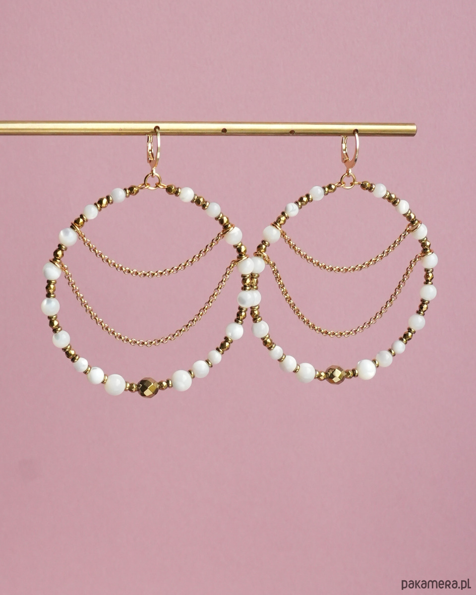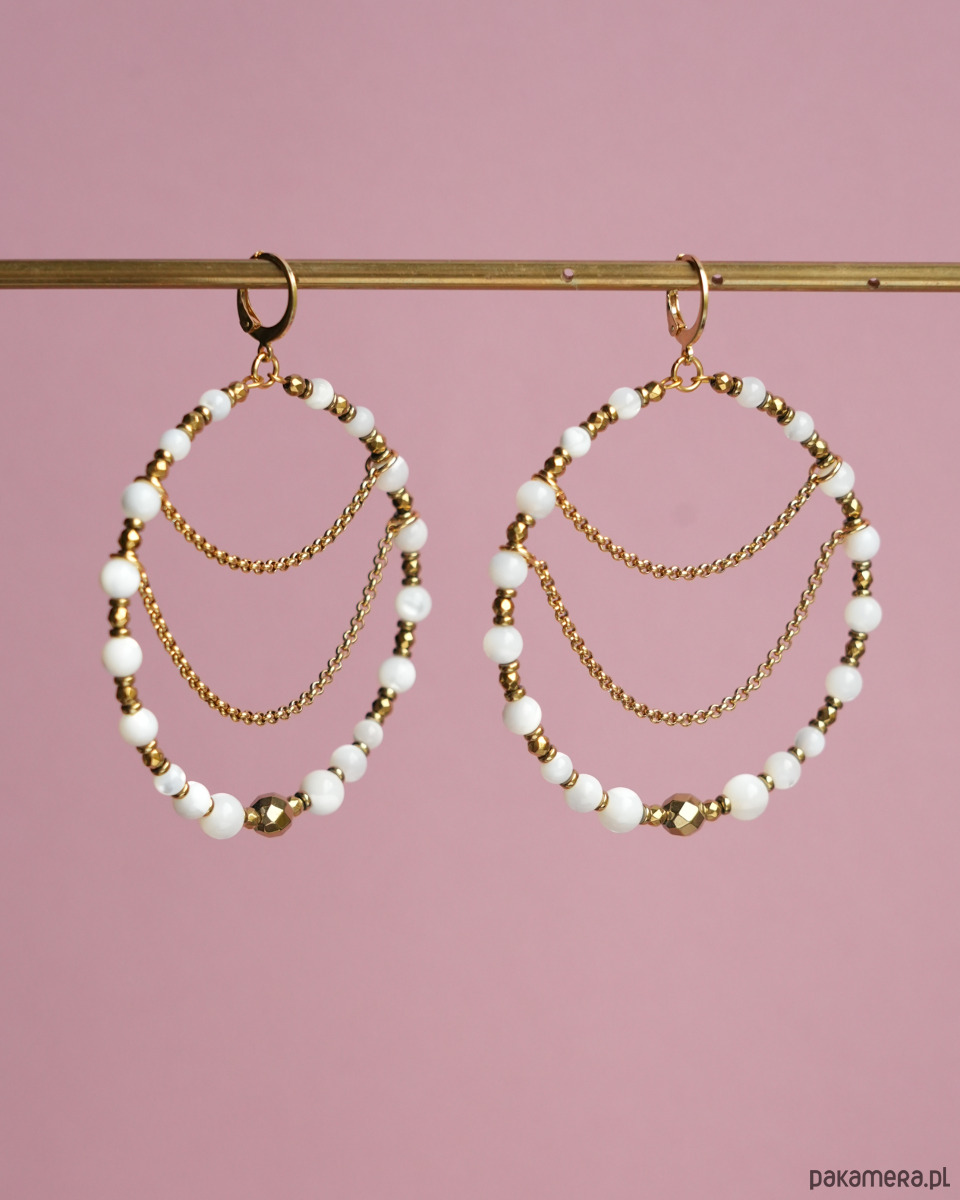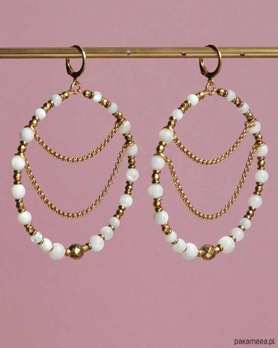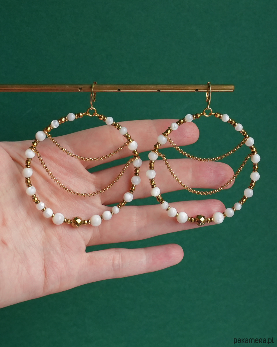 Piękne, unikatowe i bardzo efektowne, duże kolczyki koła z łańcuszkami, wykonane z białej, połyskującej MASY PERŁOWEJ i złotego HEMATYTU. Do noszenia na co dzień i na specjalne okazje. Na pewno będą przykuwać wzrok :)