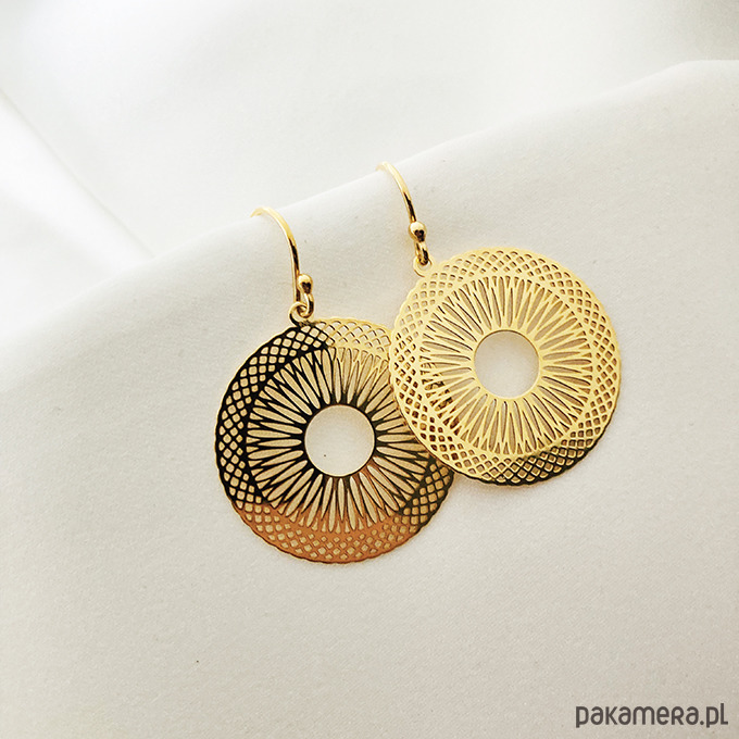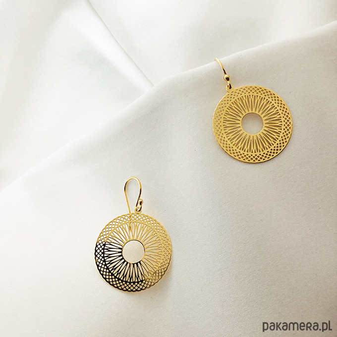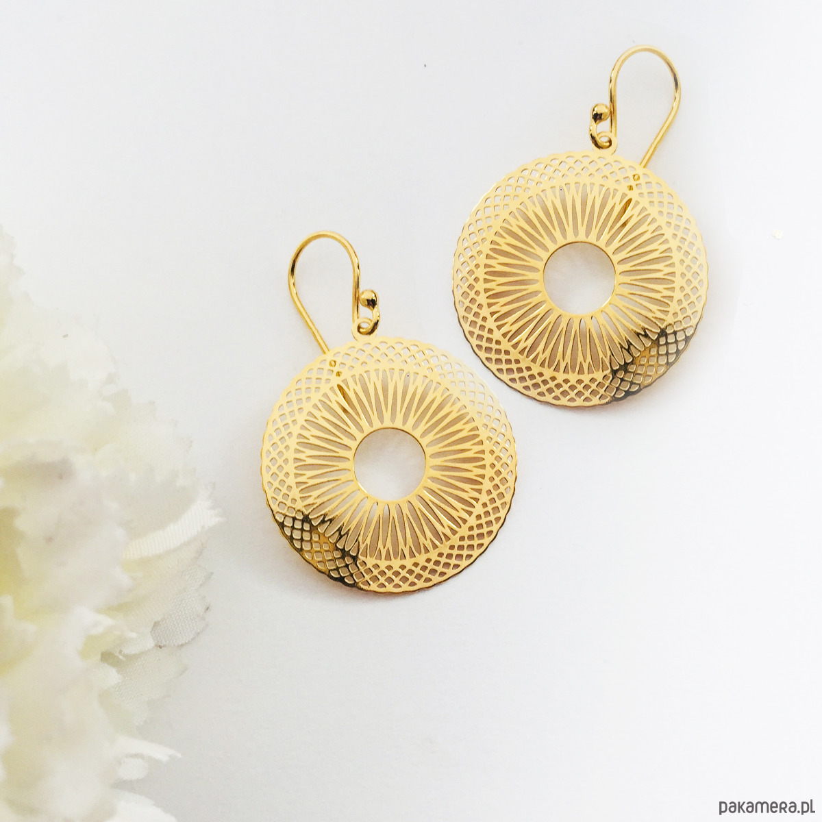 Przepiękne unikatowe, efektowne kolczyki z dużymi filigranowymi kołami. Wycinane koła są bardzo pięknie wykonanie. Kolczyki są lekkie i wygodne w noszeniu. Wykonane z elementów ze srebra próby 925 złoconego 24 k złotem . Dostępny naszyjnik do kompletu w innej ofercie.