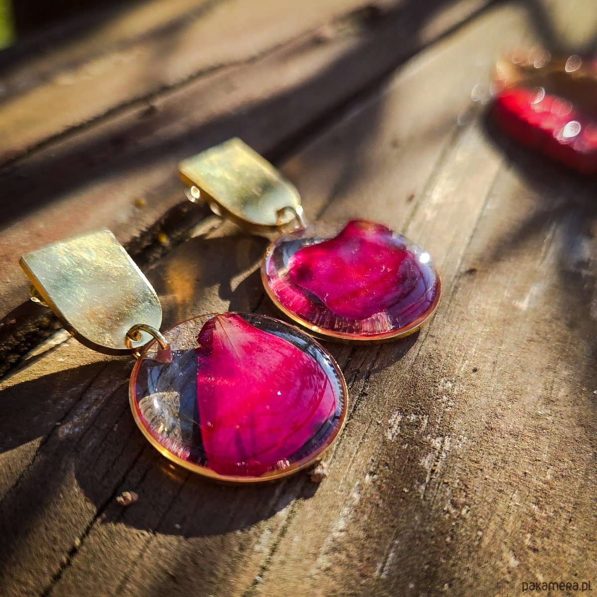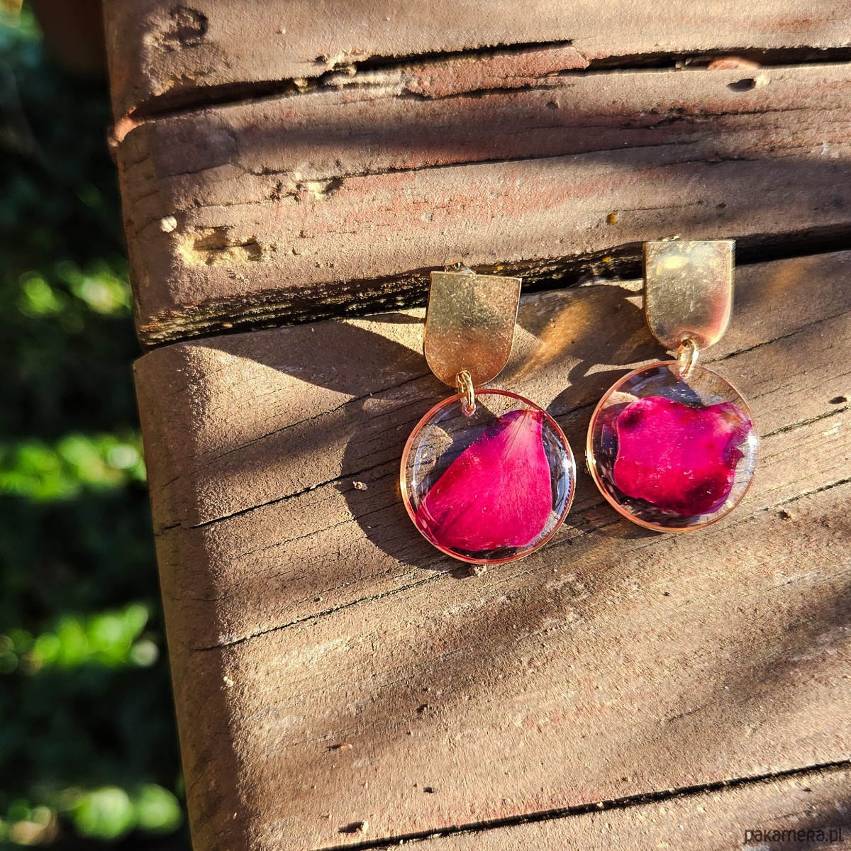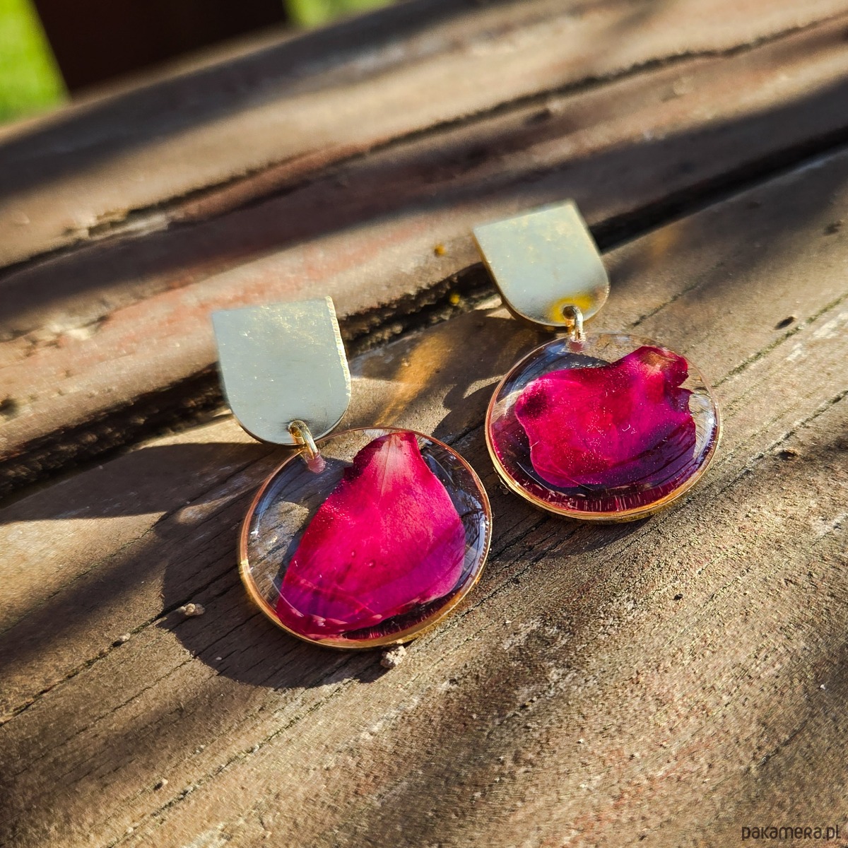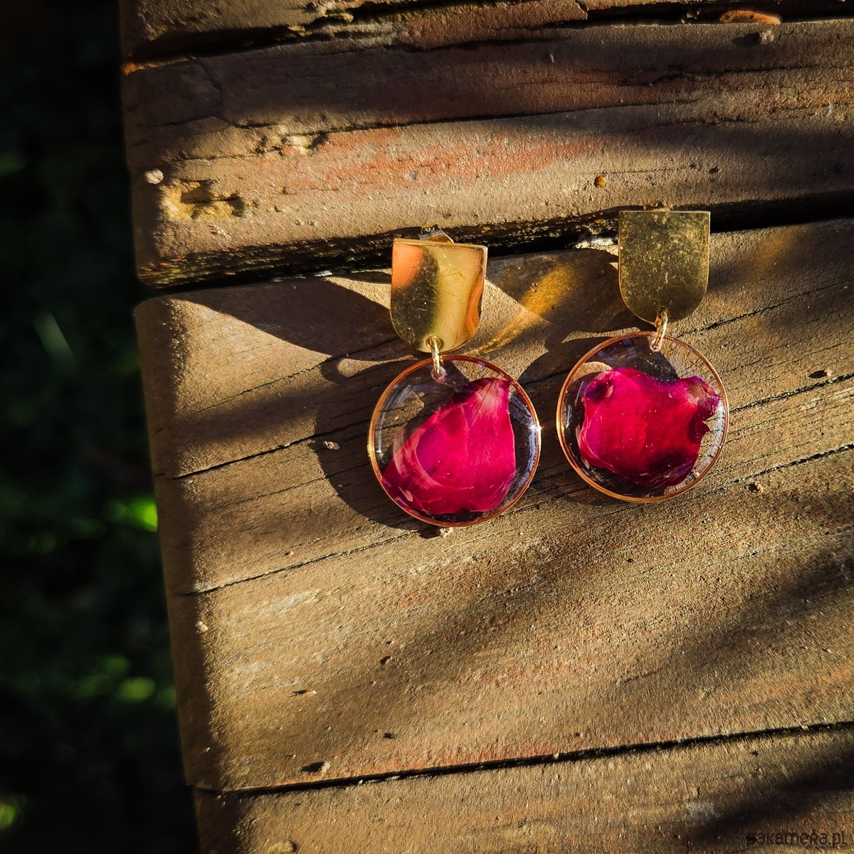 Kolczyki ze stali chirurgicznej z zatopionymi płatkami czerwonej róży.