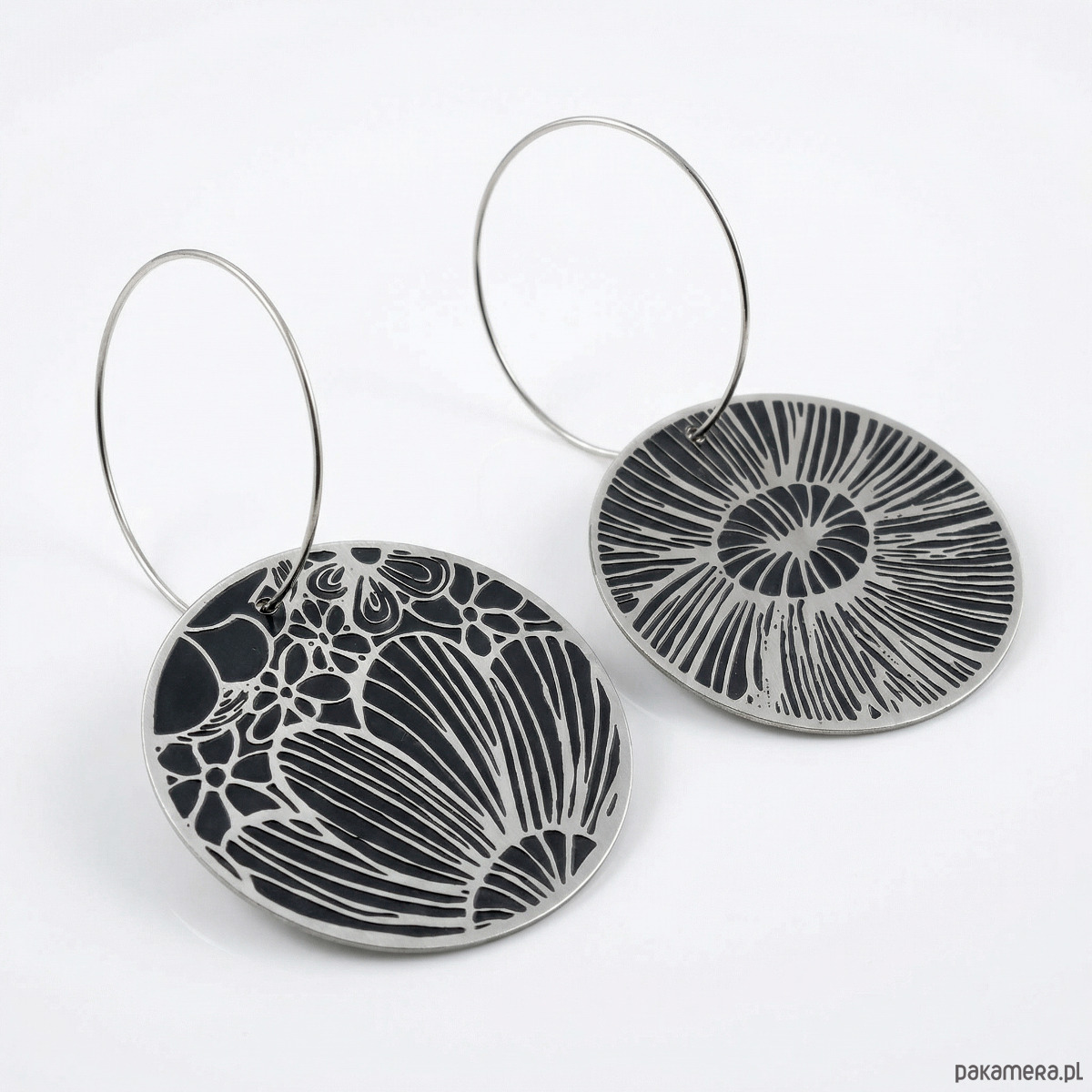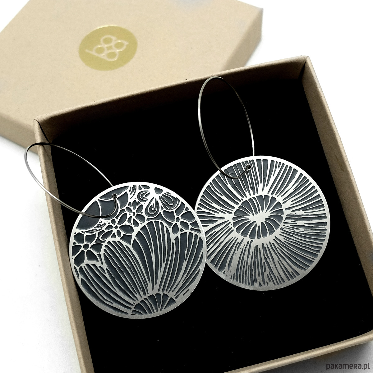 Duże wiszące kolczyki koła z motywem roślinnym wykonanym według autorskiej grafiki. Wykonane z emaliowanej stali nierdzewnej oraz srebra próby 0,925 (bigiel). Lekkie i połyskujące na słońcu, kolczyki koła są cały czas w ruchu. Długie na 5 cm. Koło z motywem roślinnym ma średnicę 3 cm.