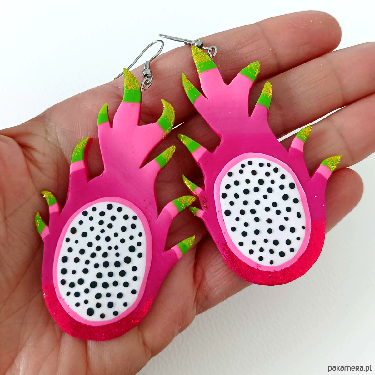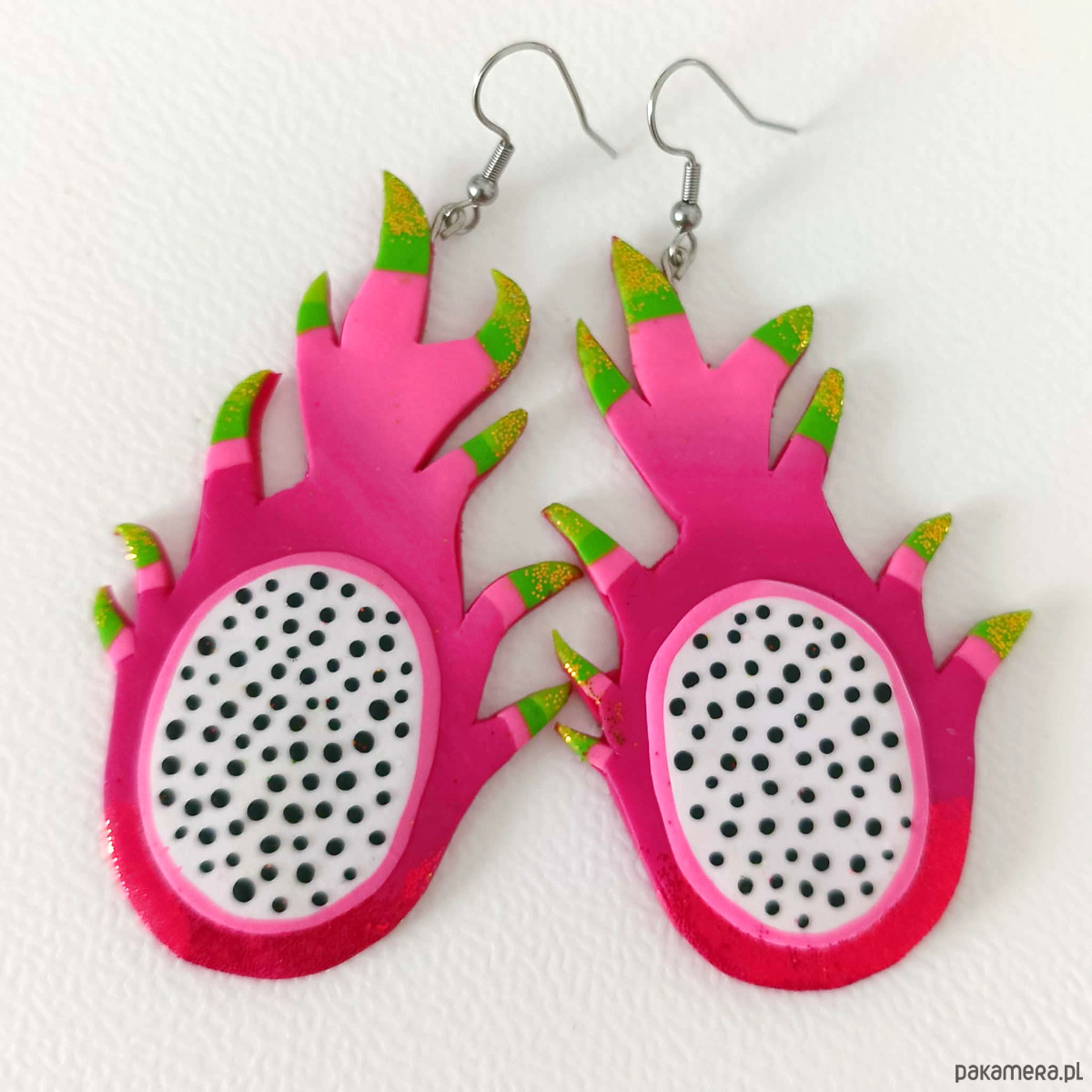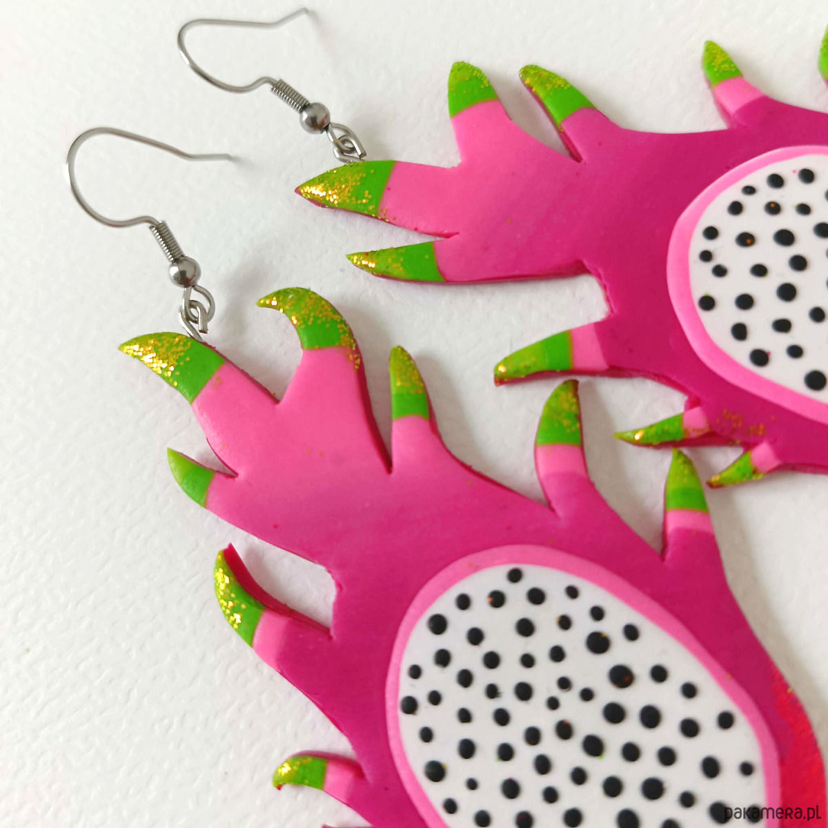 Wyraziste, duże kolczyki typu statement inspirowane egzotycznym smoczym owocem. Intensywny neonowy róż w połączeniu z soczystą zielenią tworzy odważny, modowy akcent dla kobiet, które kochają kolor, sztukę i niebanalny styl.