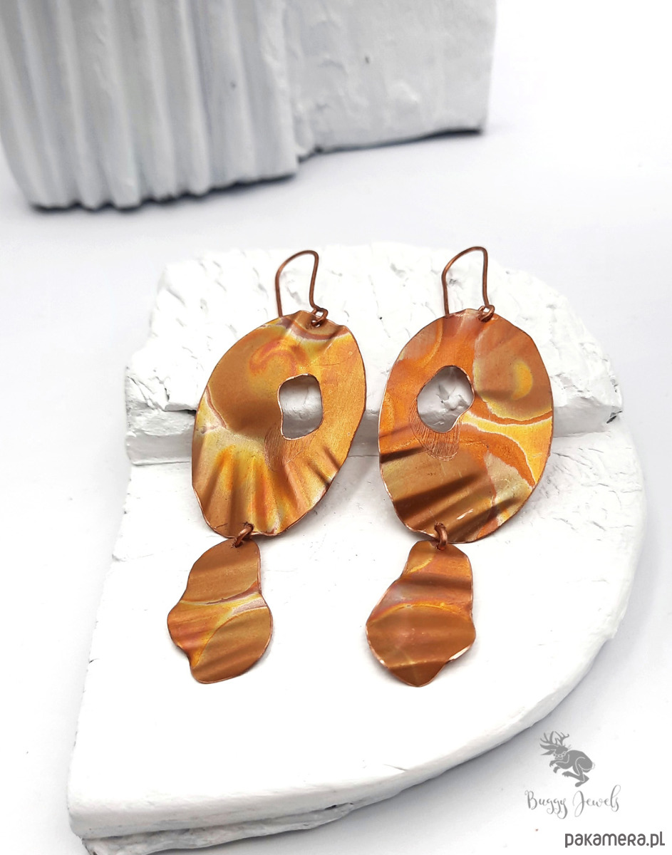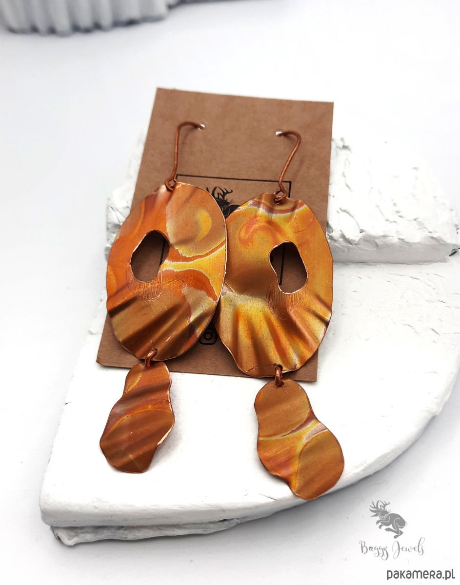 Kolczyki handmade wykonane w całości z miedzi, która została poddana barwieniu za pomocą ognia.
