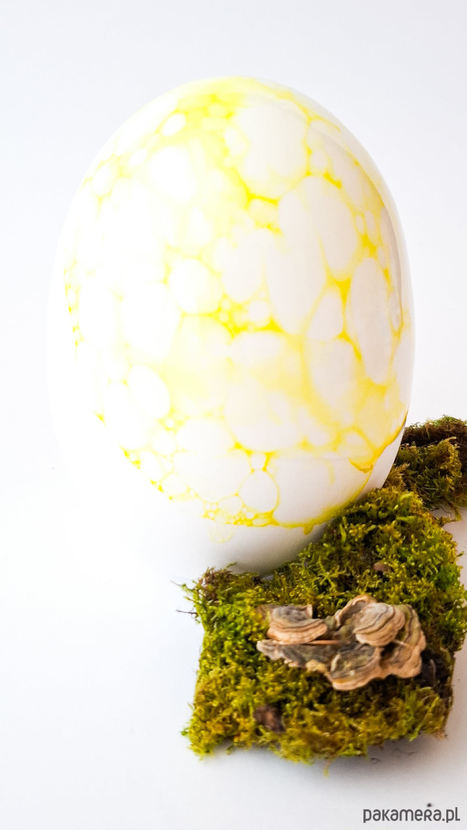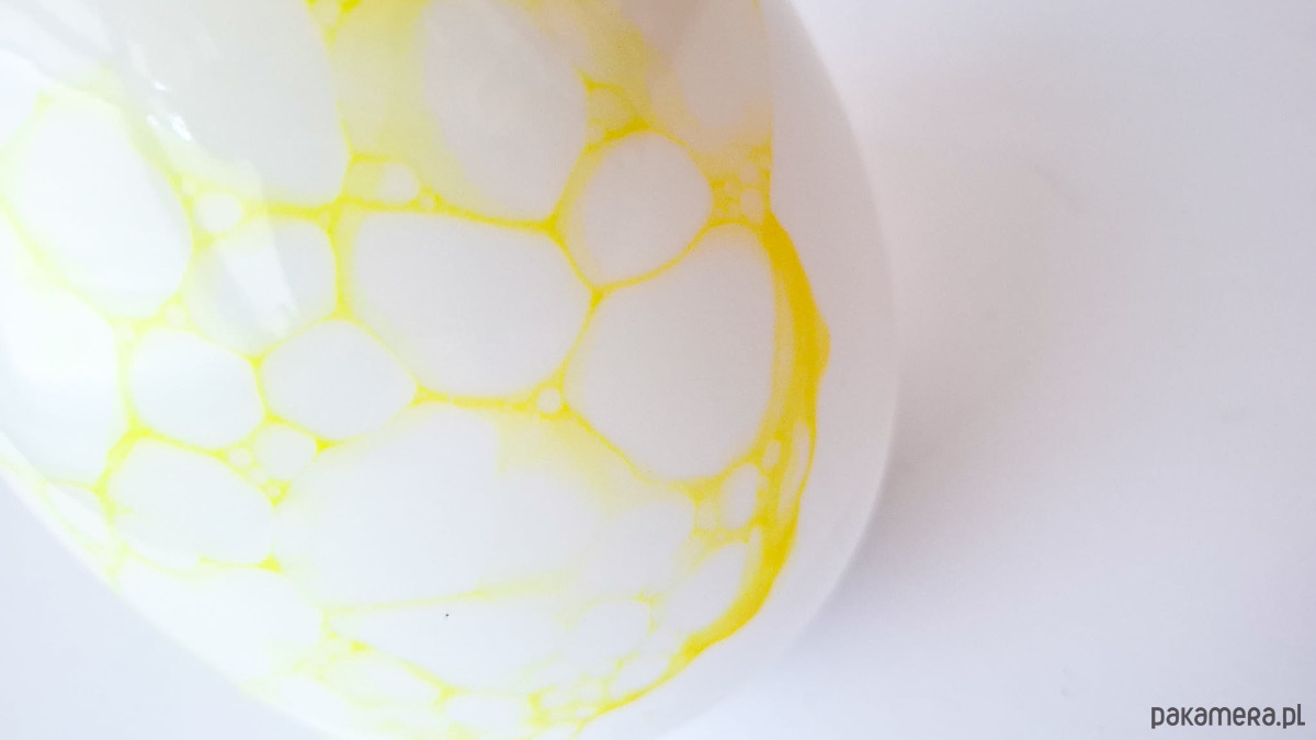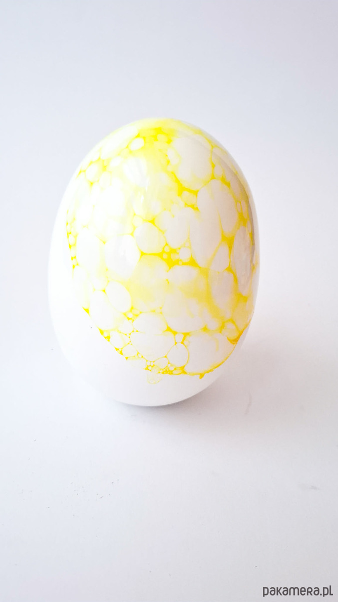 Na całej powierzchni jajka, w sposób nieregularny i fragmentaryczny, pojawia się dekoracja wykonana metodą „bąbelków”. Tworzą ją drobne, okrągłe ślady o różnej wielkości, które układają się w lekką, organiczną strukturę. Dekoracja utrzymana jest w żółtym kolorze – od subtelnych, półtransparentnych tonów po bardziej nasycone punkty. Żółte bąbelki delikatnie ożywiają biel porcelany, nadając obiektowi lekkość i wrażenie spontaniczności.