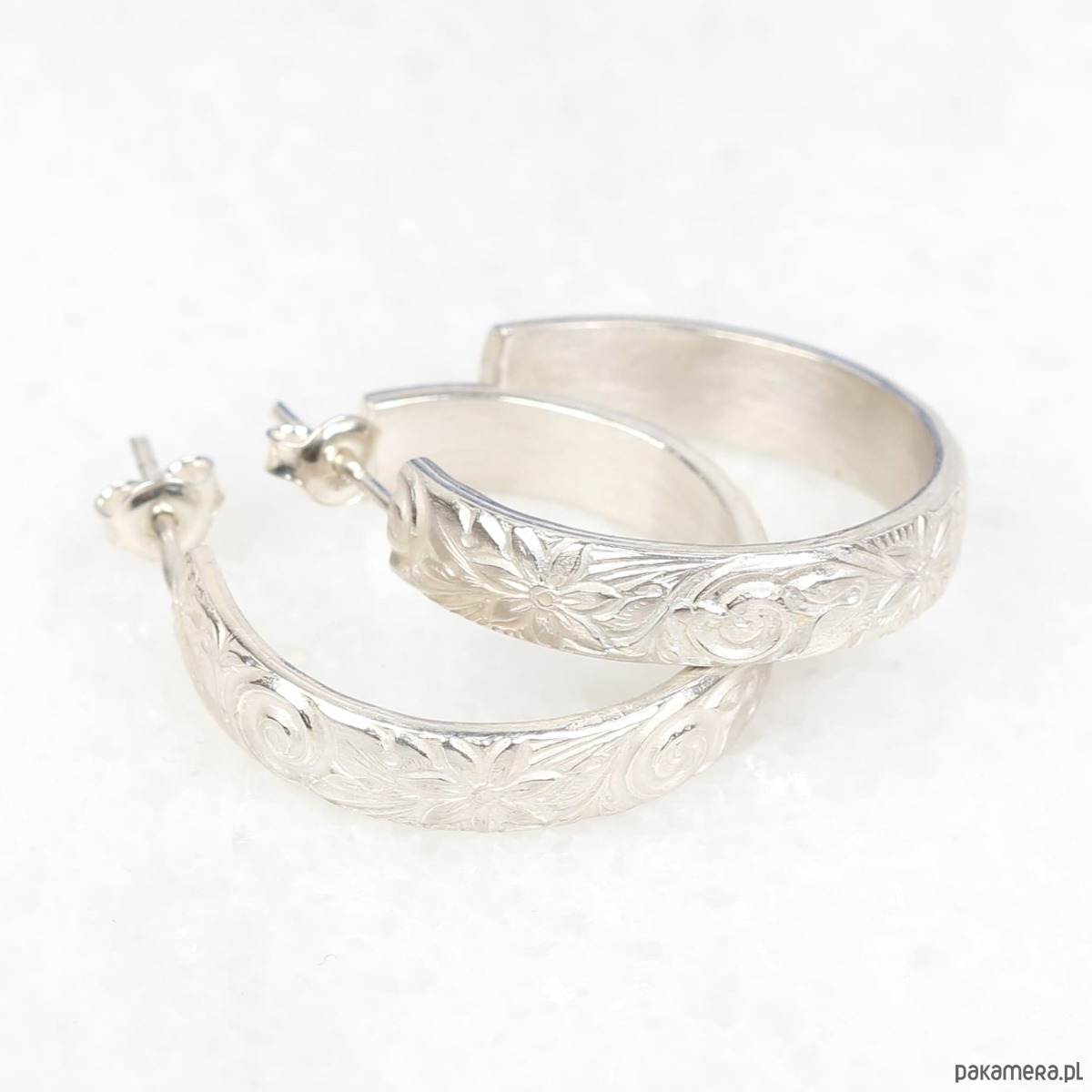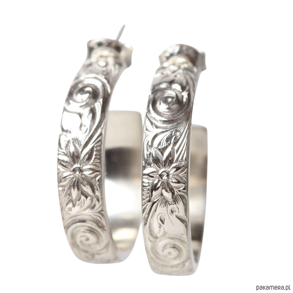 Ręcznie wykonane kolczyki koła ze srebra z kwiatową fakturą