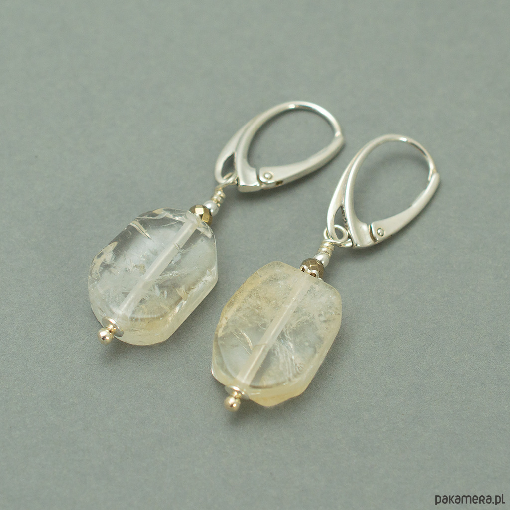 Duże, klasyczne kolczyki z bryłkami cytrynu. Wygodne, zamykane bigle angielskie, dobrze trzymają się na uszach.