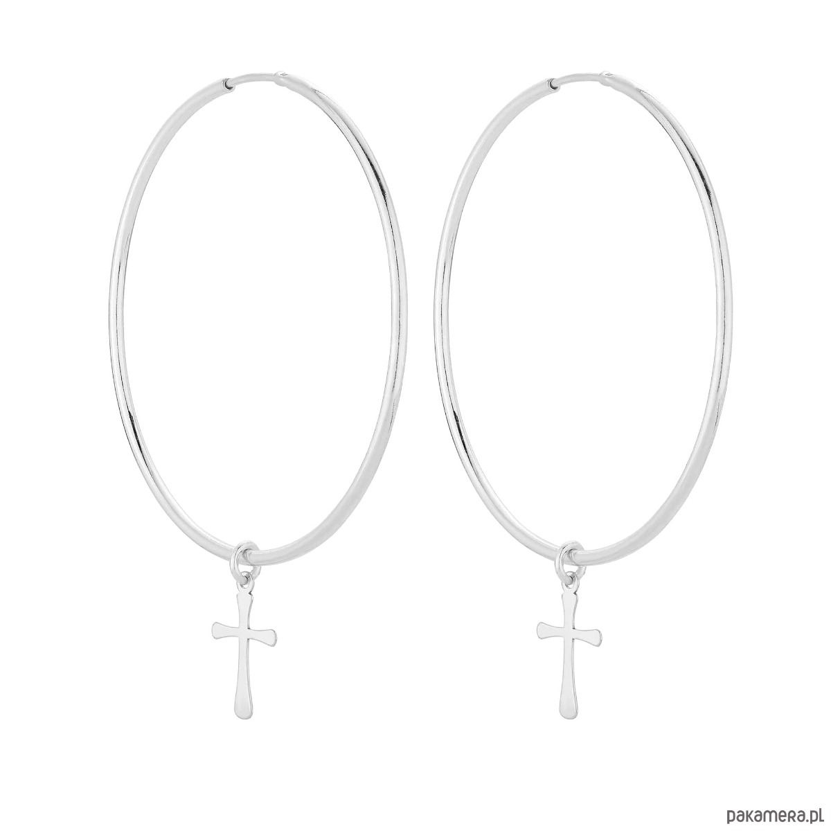 Duże, okrągłe, srebrne kolczyki zdobione krzyżem. Całość wykonana ze srebra 925.