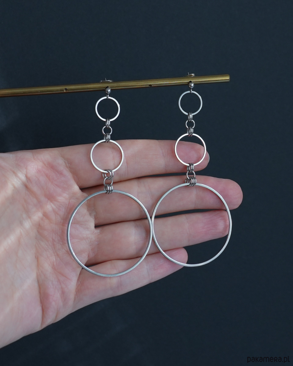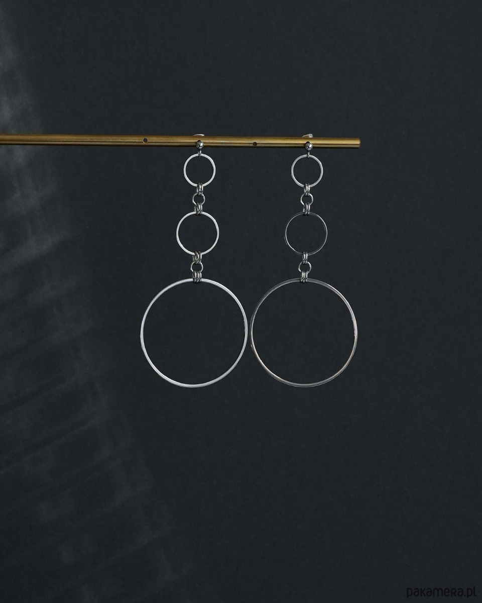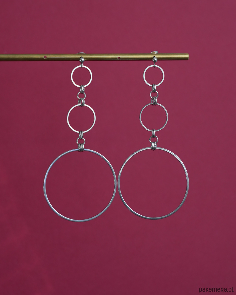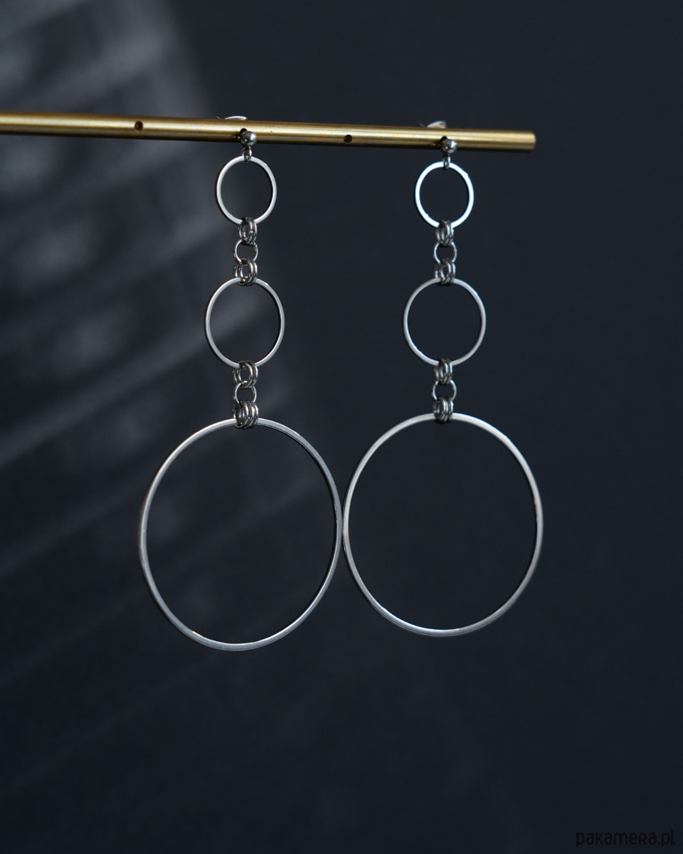 Duże, nowoczesne i bardzo efektowne kolczyki z 3 kołami, w całości wykonane ze stali szlachetnej.