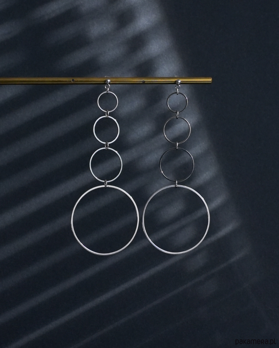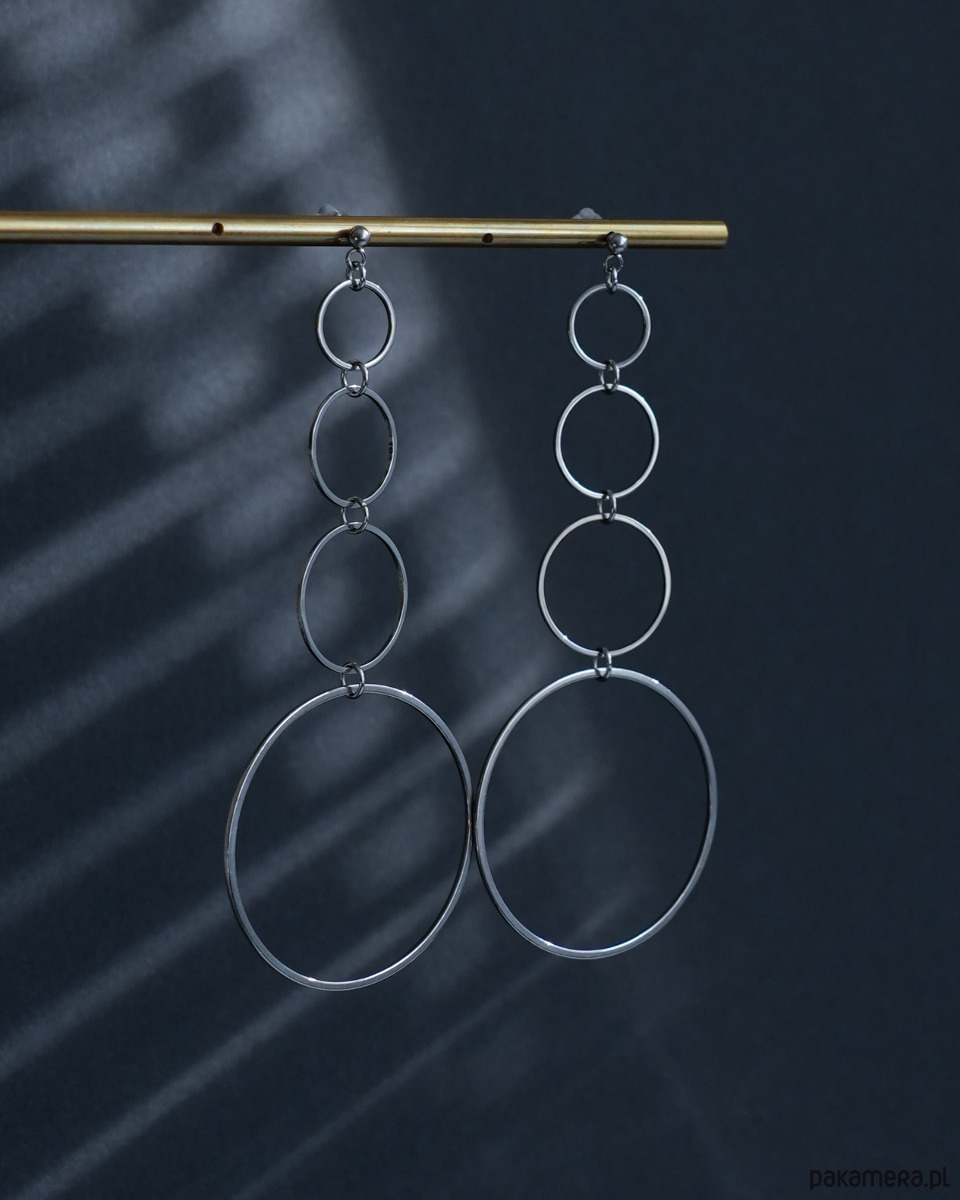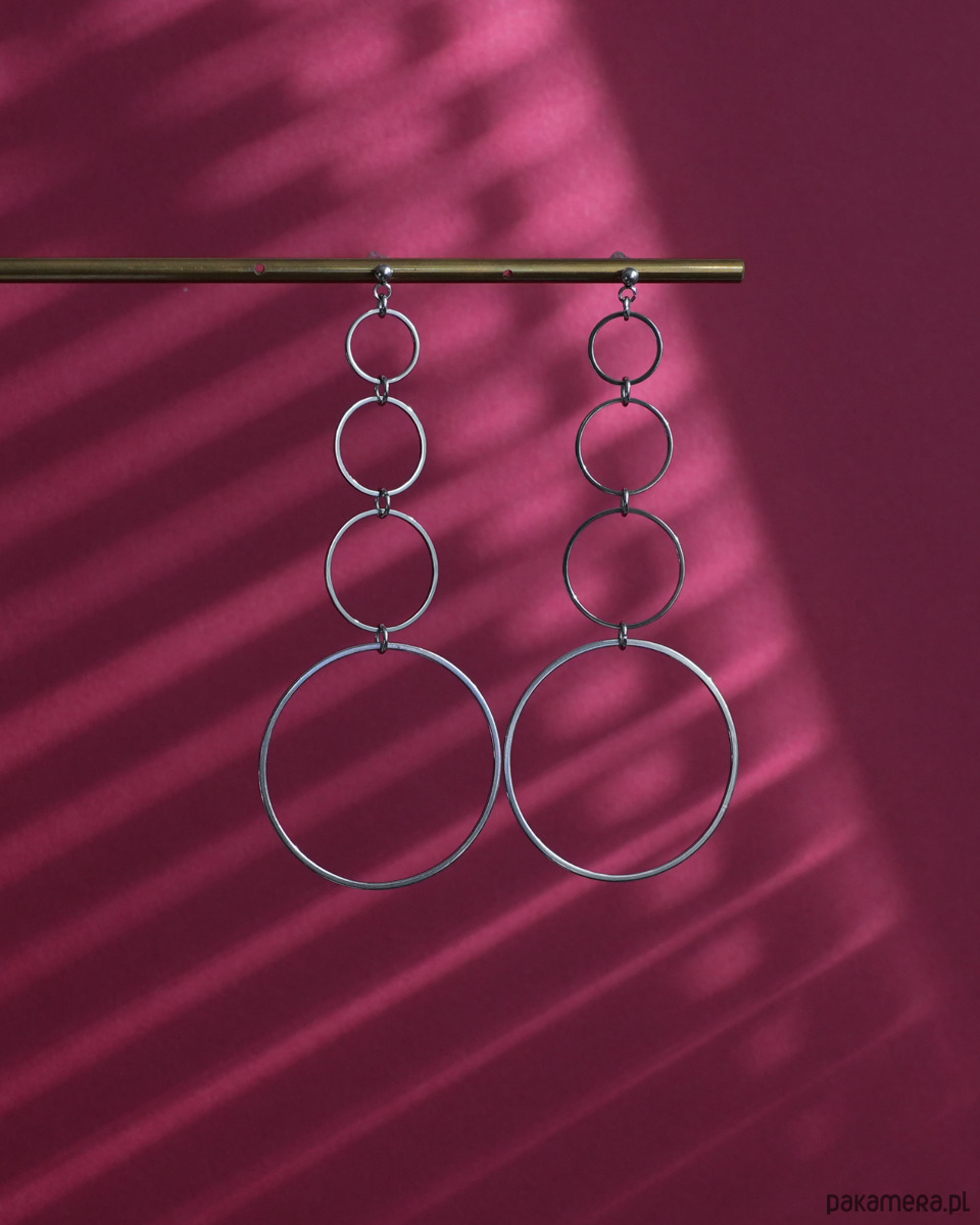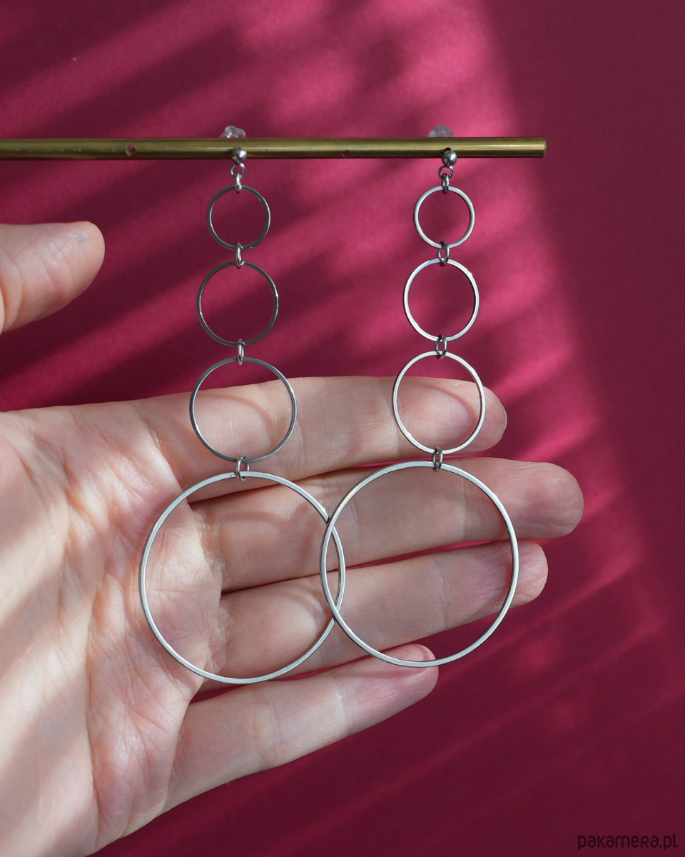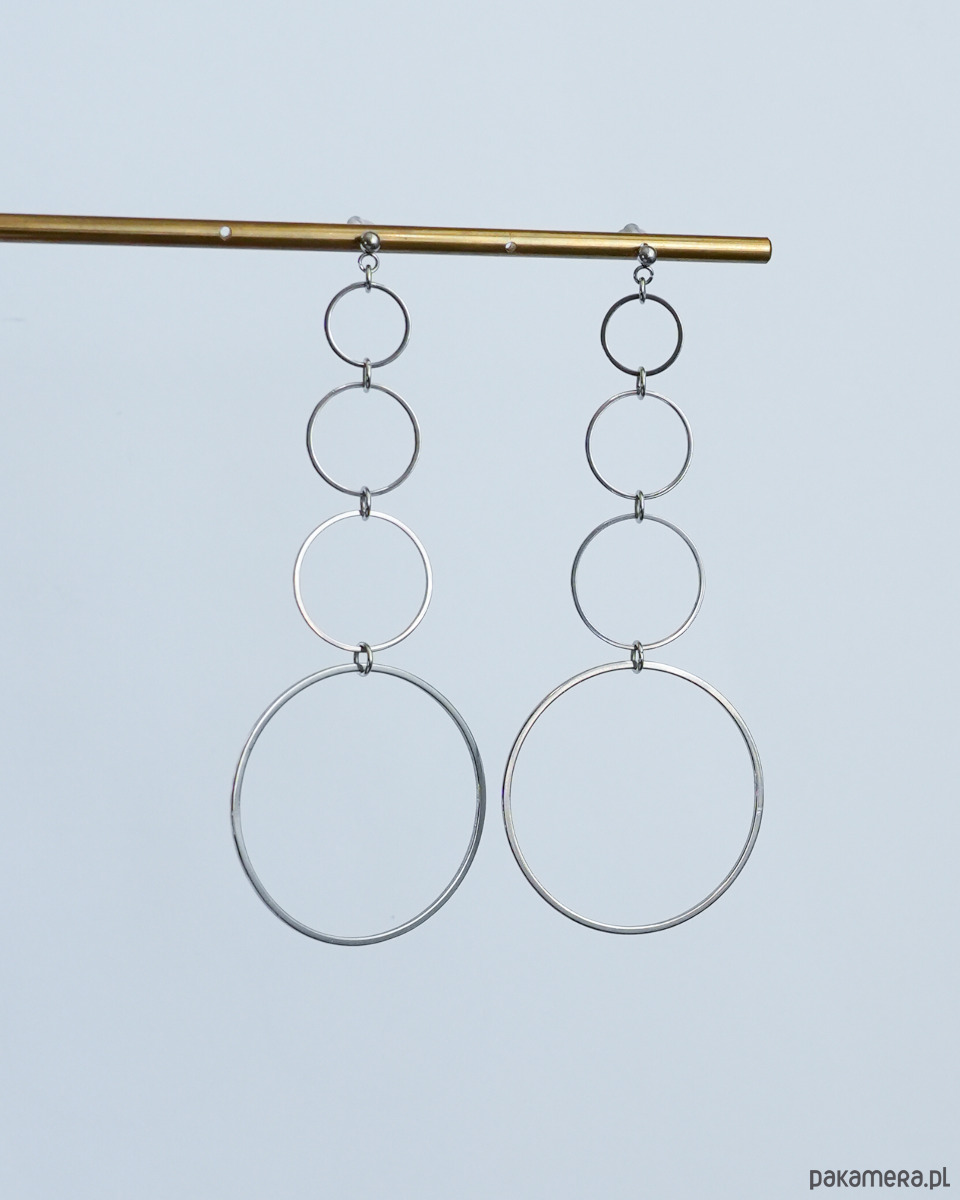 Duże, nowoczesne i bardzo efektowne kolczyki geometryczne z 4 kołami, w całości wykonane ze STALI SZLACHETNEJ.