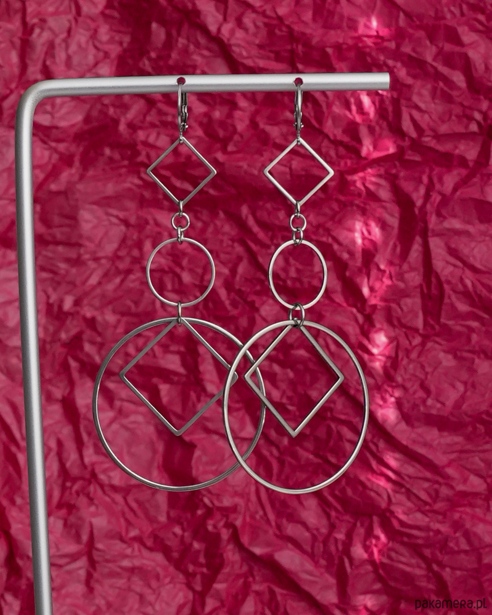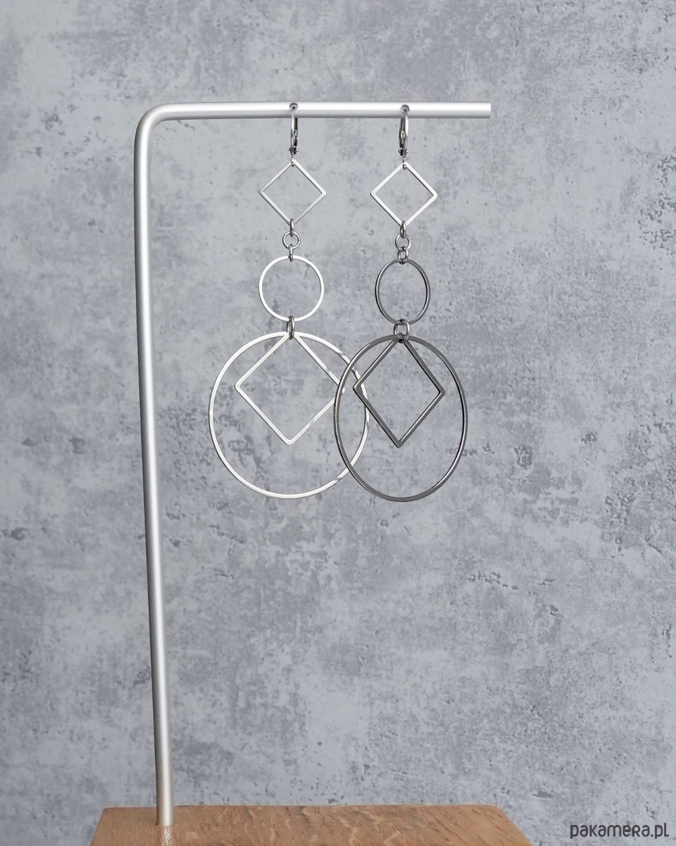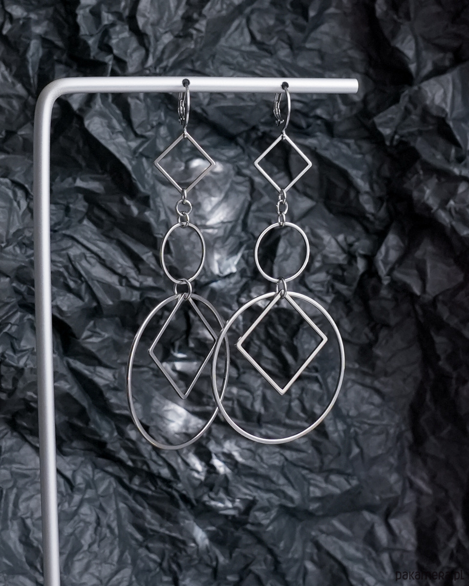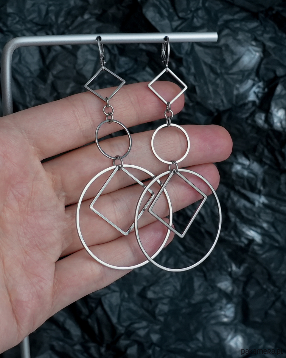 Duże i nowoczesne, wiszące kolczyki geometryczne, zawieszone na zamykanych biglach typu "kajdanki". Mega oryginalne, na pewno będą przykuwać wzrok. Do noszenia na co dzień i na imprezę. Będą świetnie się prezentować np. do czarnego swetra lub bluzki z golfem.