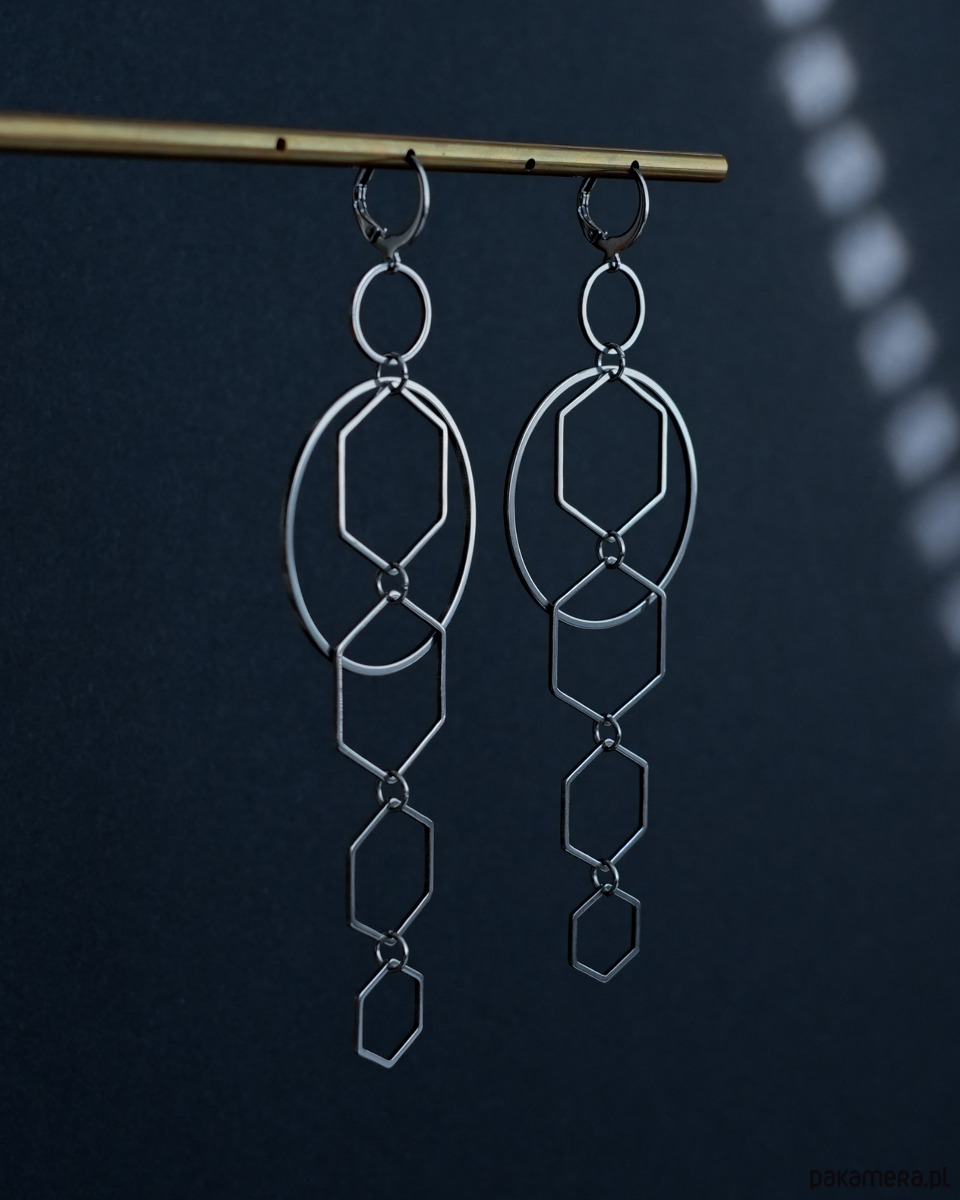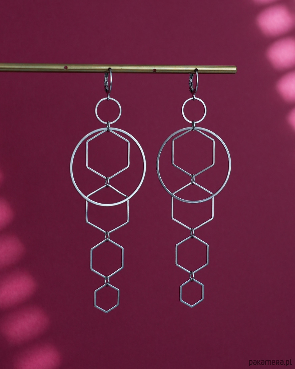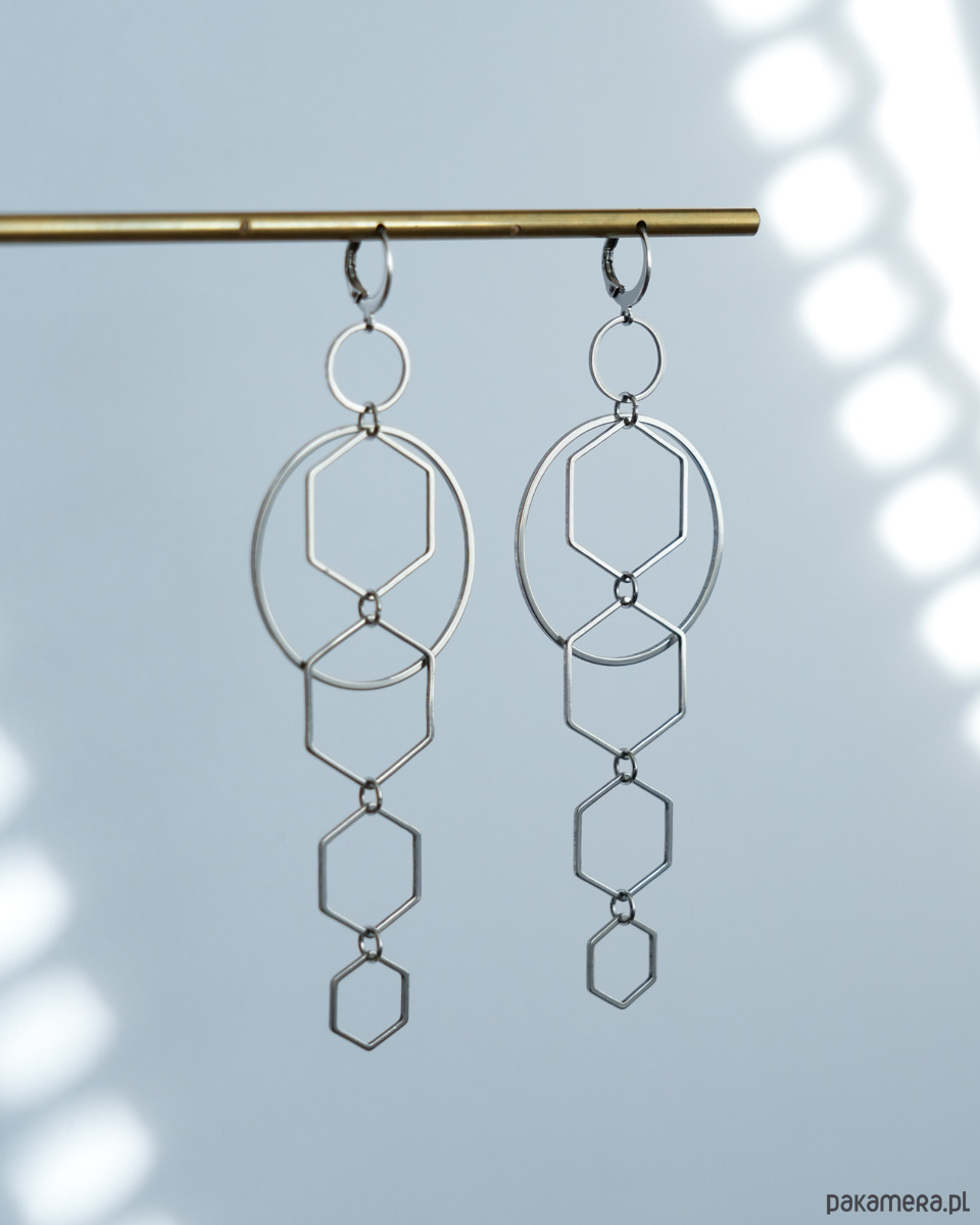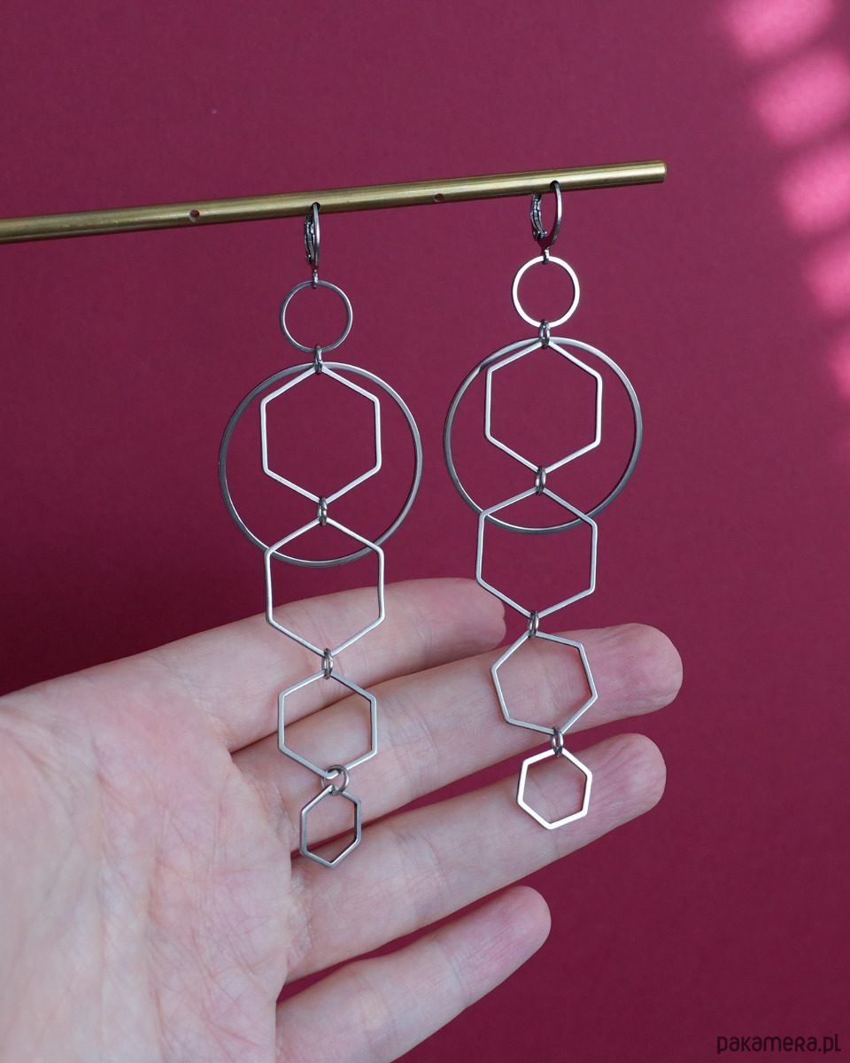 Duże, oryginalne i nowoczesne kolczyki z kołem i heksagonami, w całości wykonane ze stali szlachetnej. Koło i heksagony stanowią dwa ruchome elementy (nie tworzą jednej, sztywnej całości).