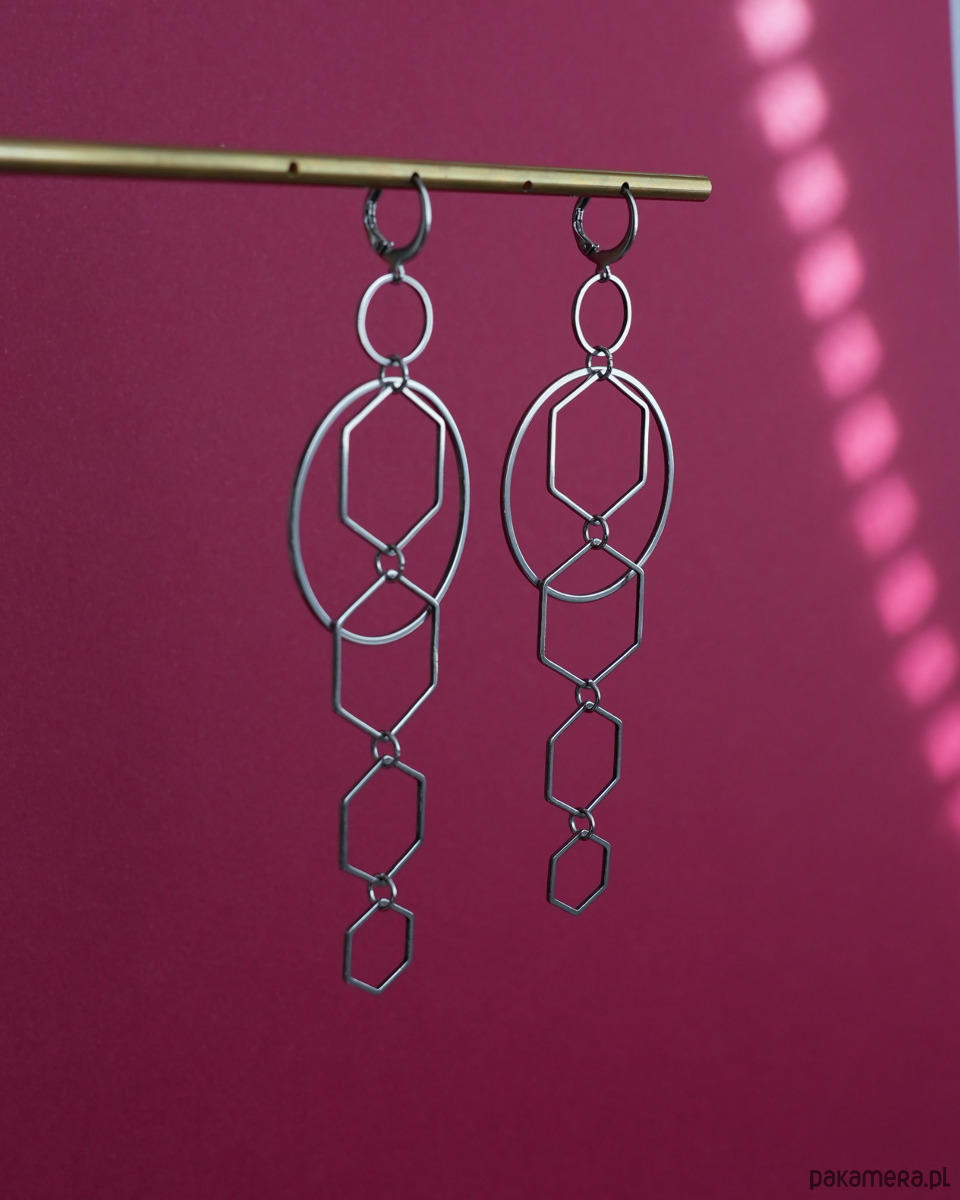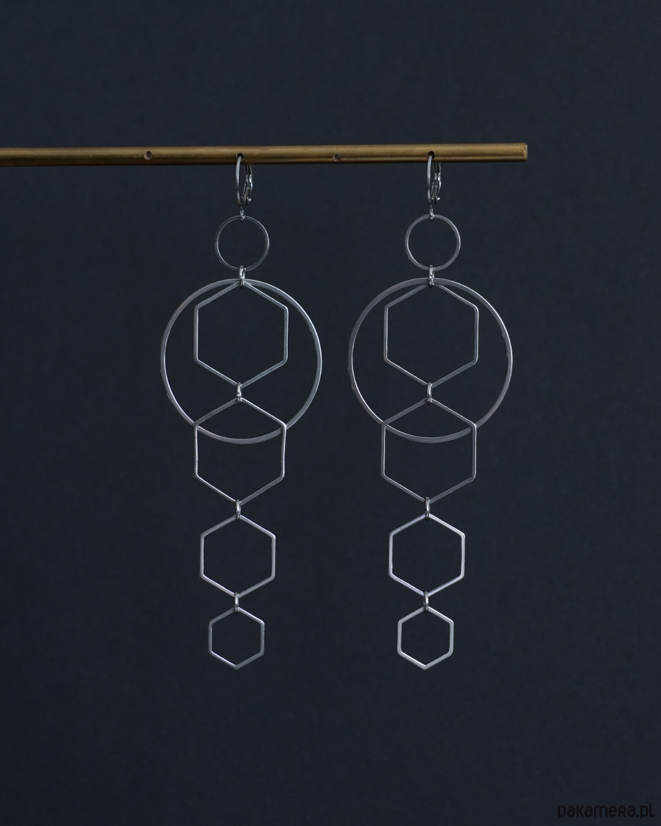 Duże, oryginalne i nowoczesne kolczyki z kołem i heksagonami, w całości wykonane ze stali szlachetnej. Koło i heksagony stanowią dwa ruchome elementy (nie tworzą jednej, sztywnej całości).