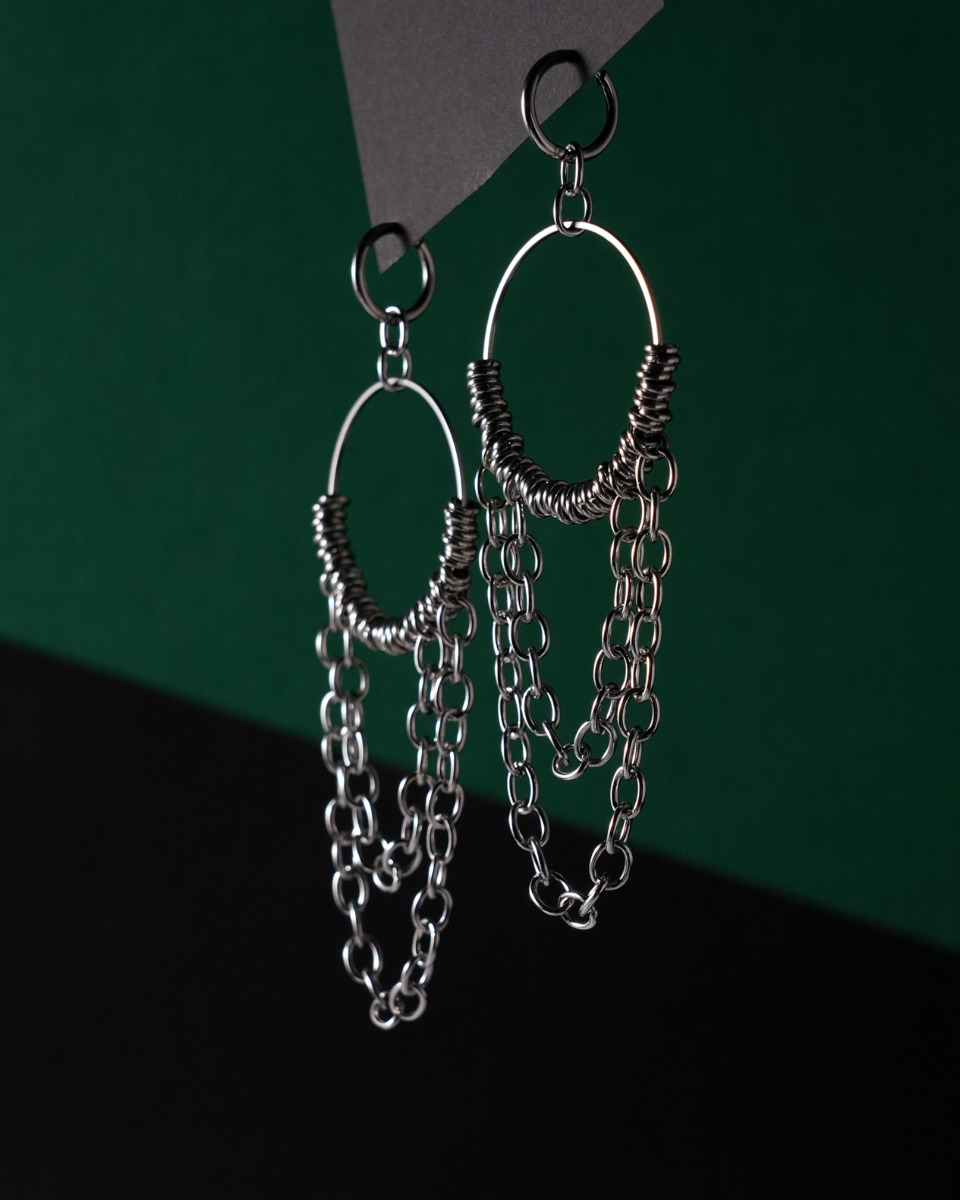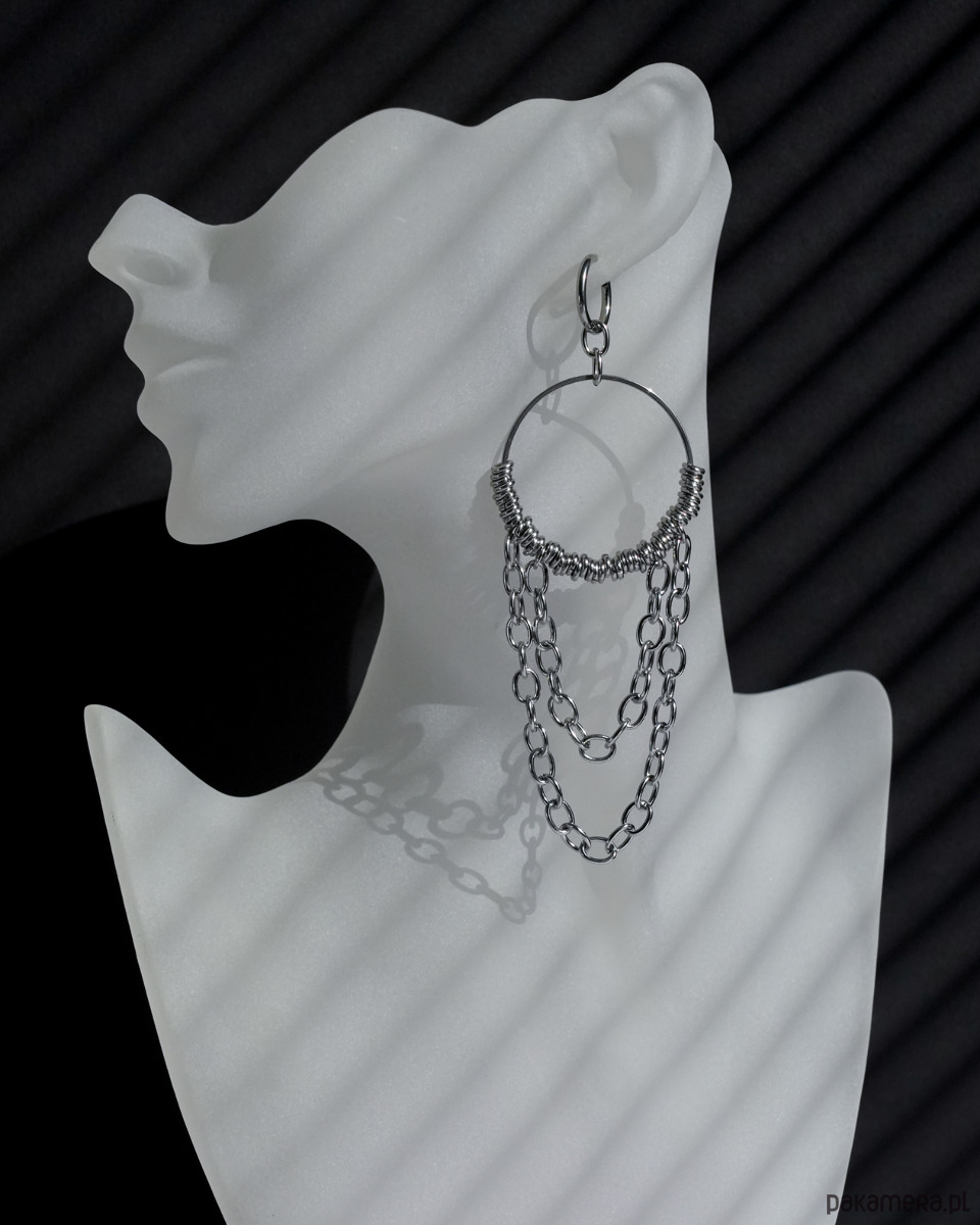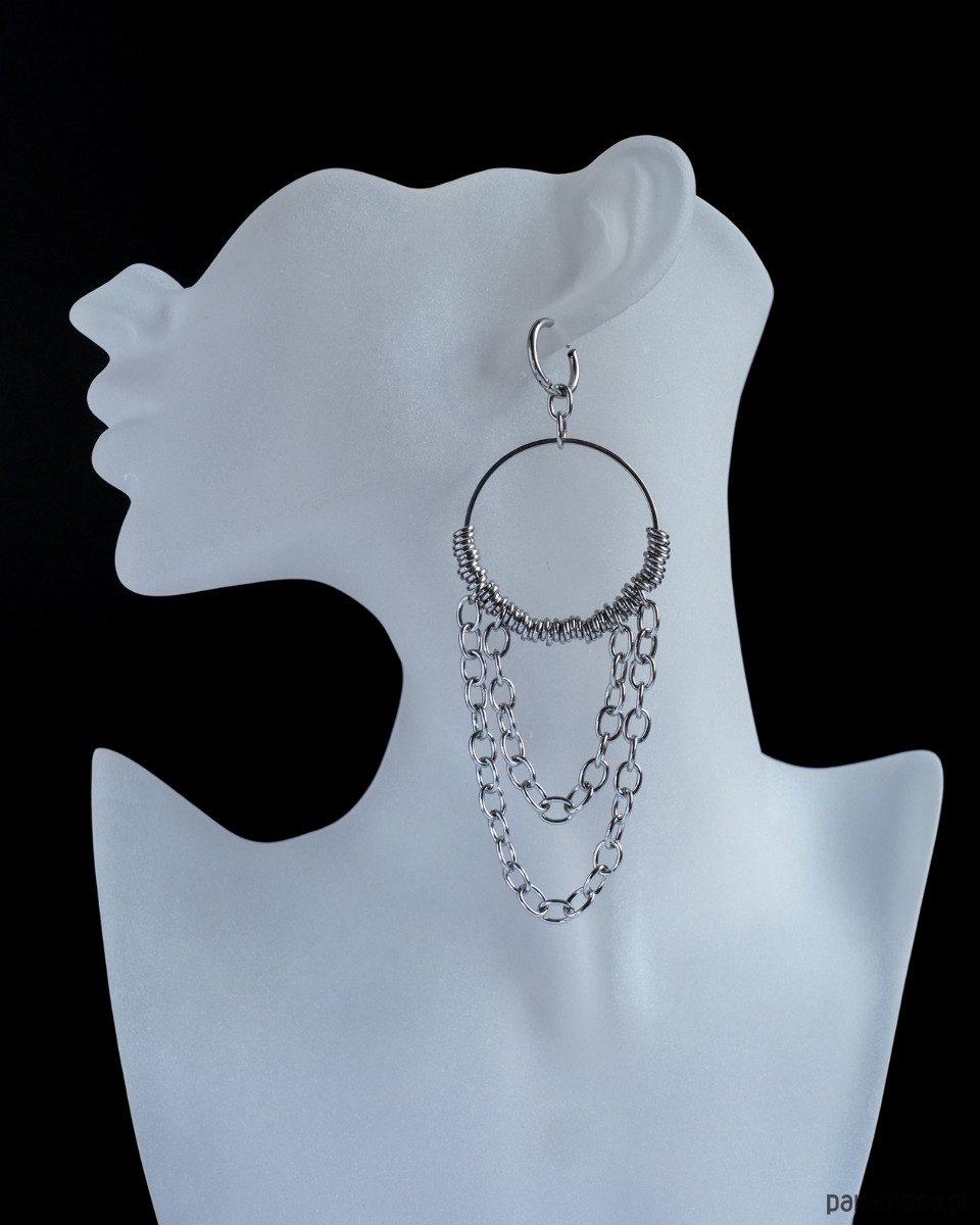 Duże, efektowne i unikatowe kolczyki z grubymi łańcuchami zawieszone na zamykanych, okrągłych biglach. W całości wykonane ze srebrnej STALI SZLACHETNEJ. Są masywne i dość ciężkie.
