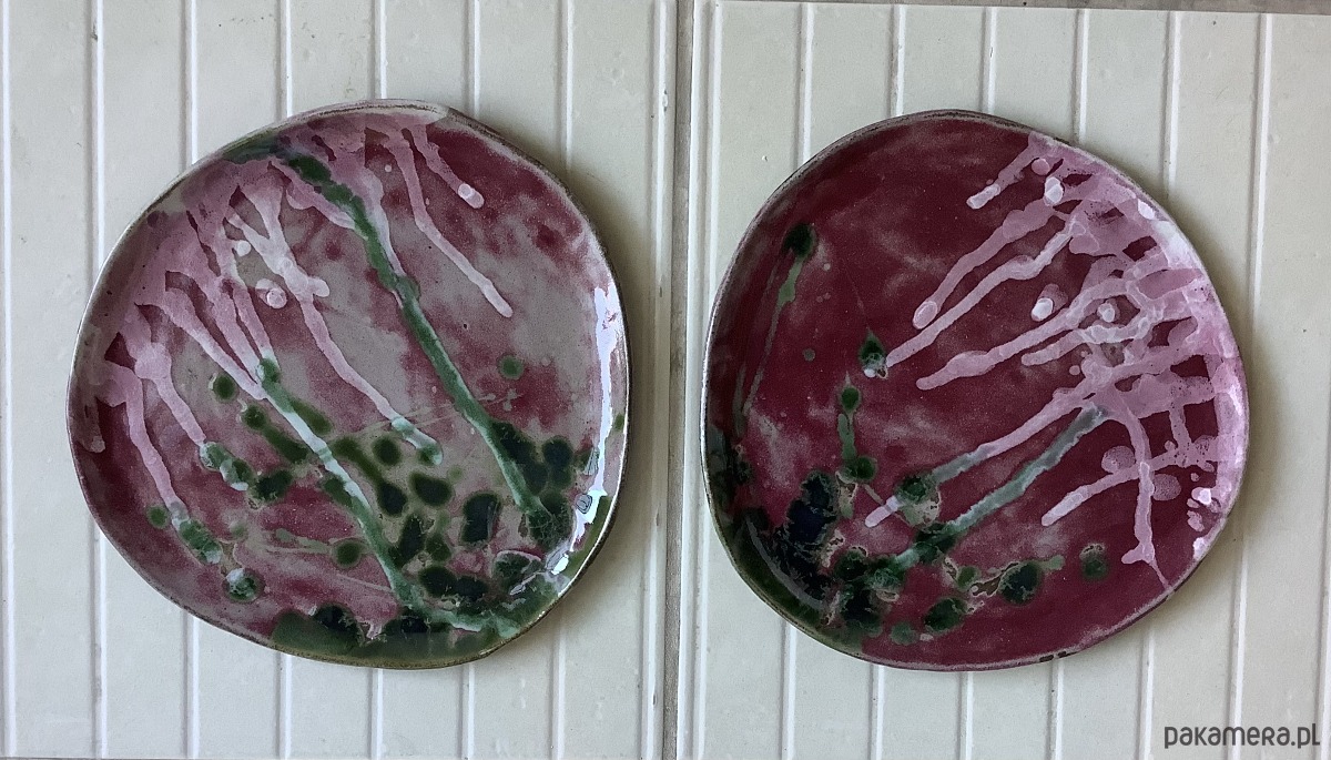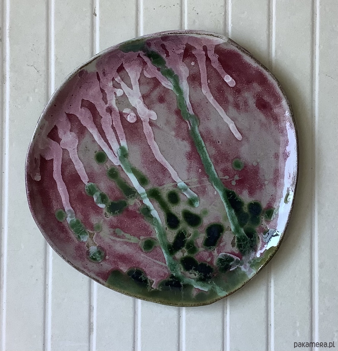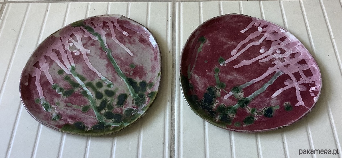 Zapraszam do kupna talerzy ręcznie robionych z szarej gliny. Każdy wyjątkowy i jedyny w swoim rodzaju, chociaż szkliwione tym samym szkliwem - wiśniowym,a zdobienia bielą i zielenią. Niby obiadowe, ale świetnie sprawdzą się także, jako śniadaniowe - dla tych, którzy lubią mieć dużo miejsca na duże śniadanie:)