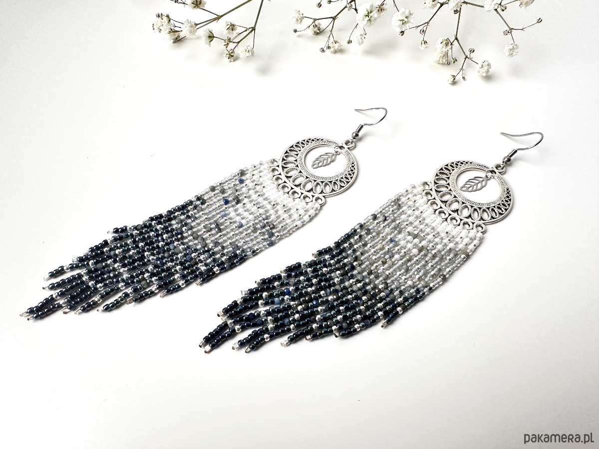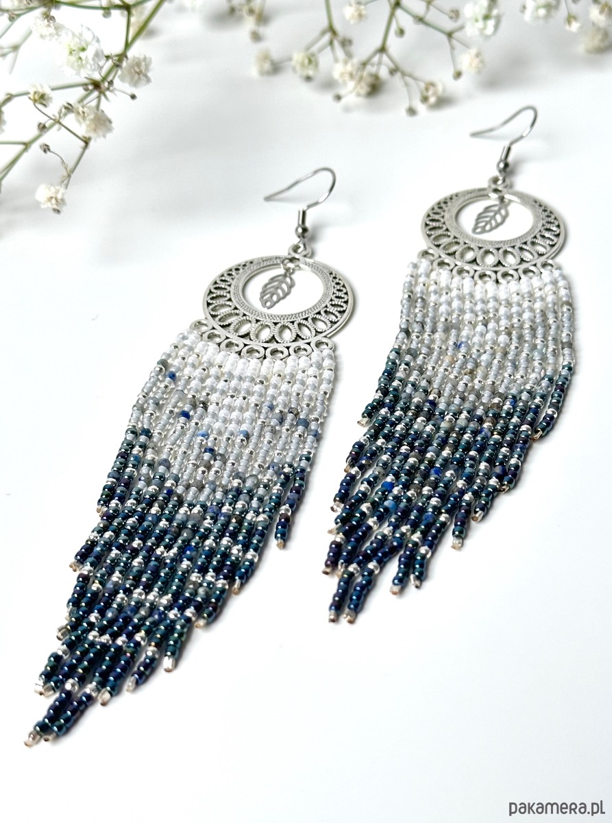 Starlight dust - kolczyki szyte ze szklanych koralików toho, kuleczek w kolorze srebra i kamieni lapis lazuli, w oprawie ze stali szlachetnej antyalergicznej.