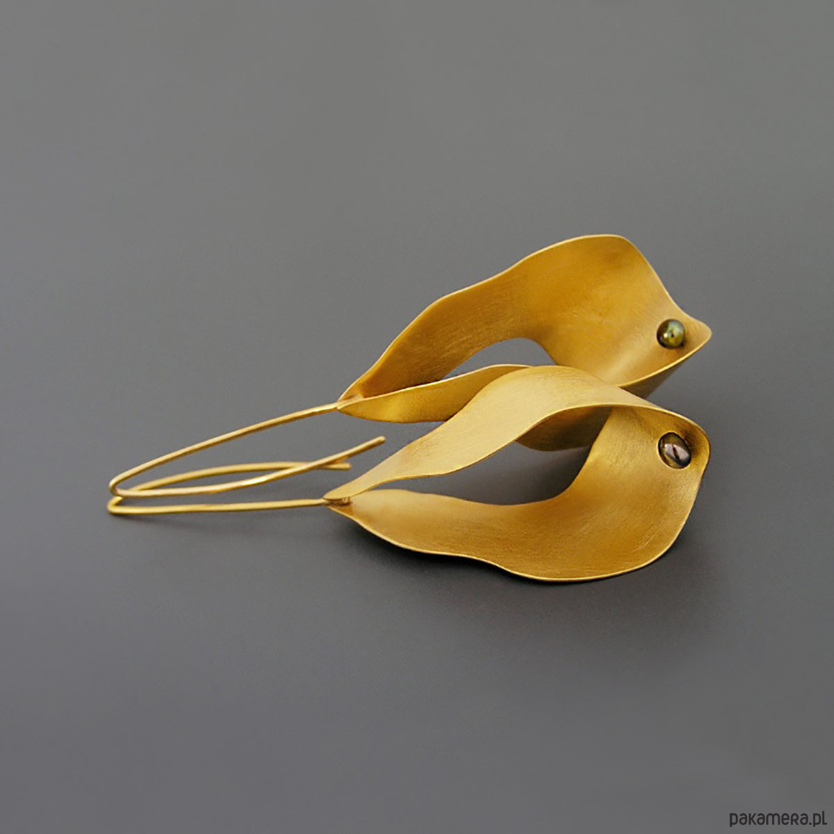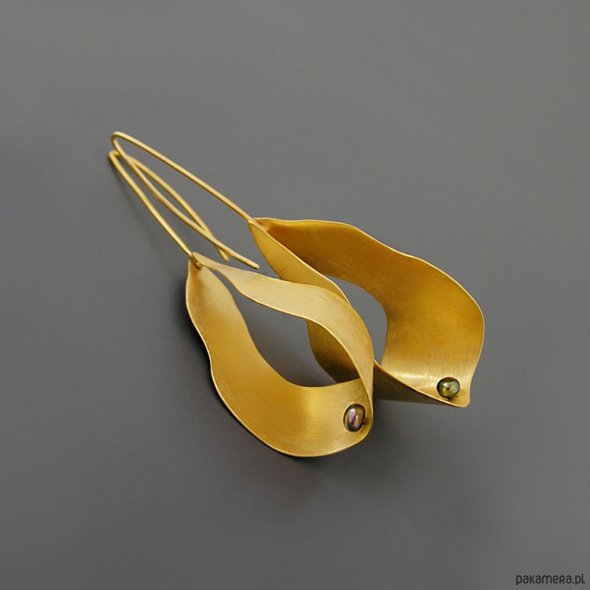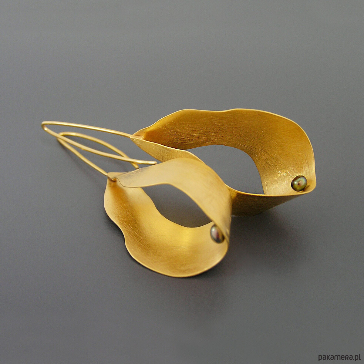 Duże unikatowe kolczyki wykonane z satynowanego srebra, pozłacane warstwą 2 mikronów 24 karatowego złota.