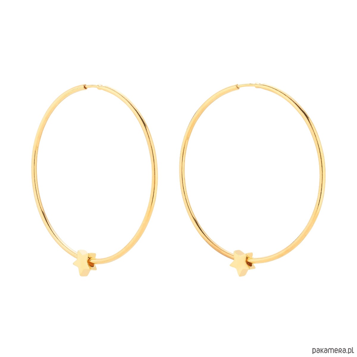 Duże, okrągłe, złote kolczyki zdobione gwiazdką. Całość wykonana ze srebra 925 powlekanego 24 karatowym żółtym złotem.