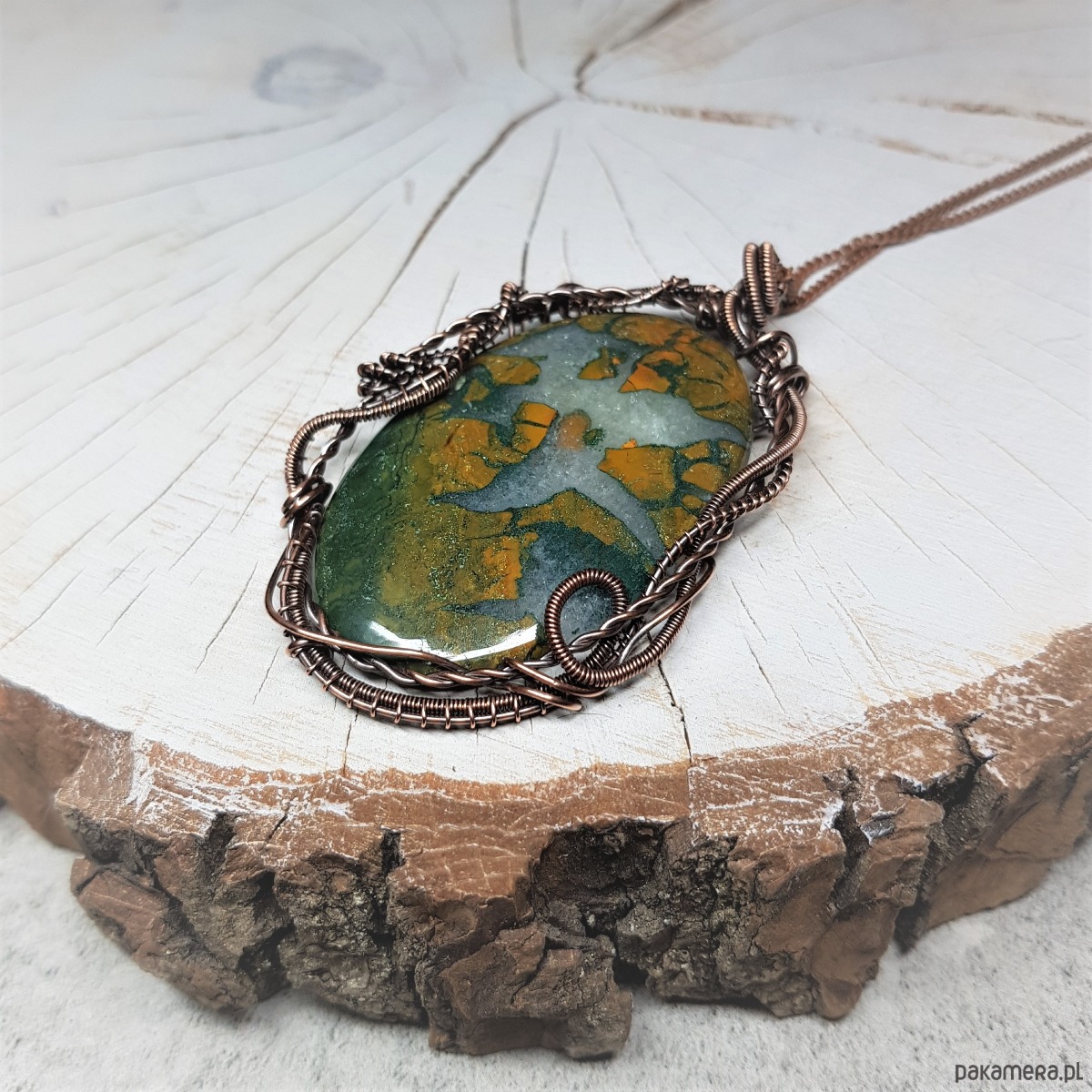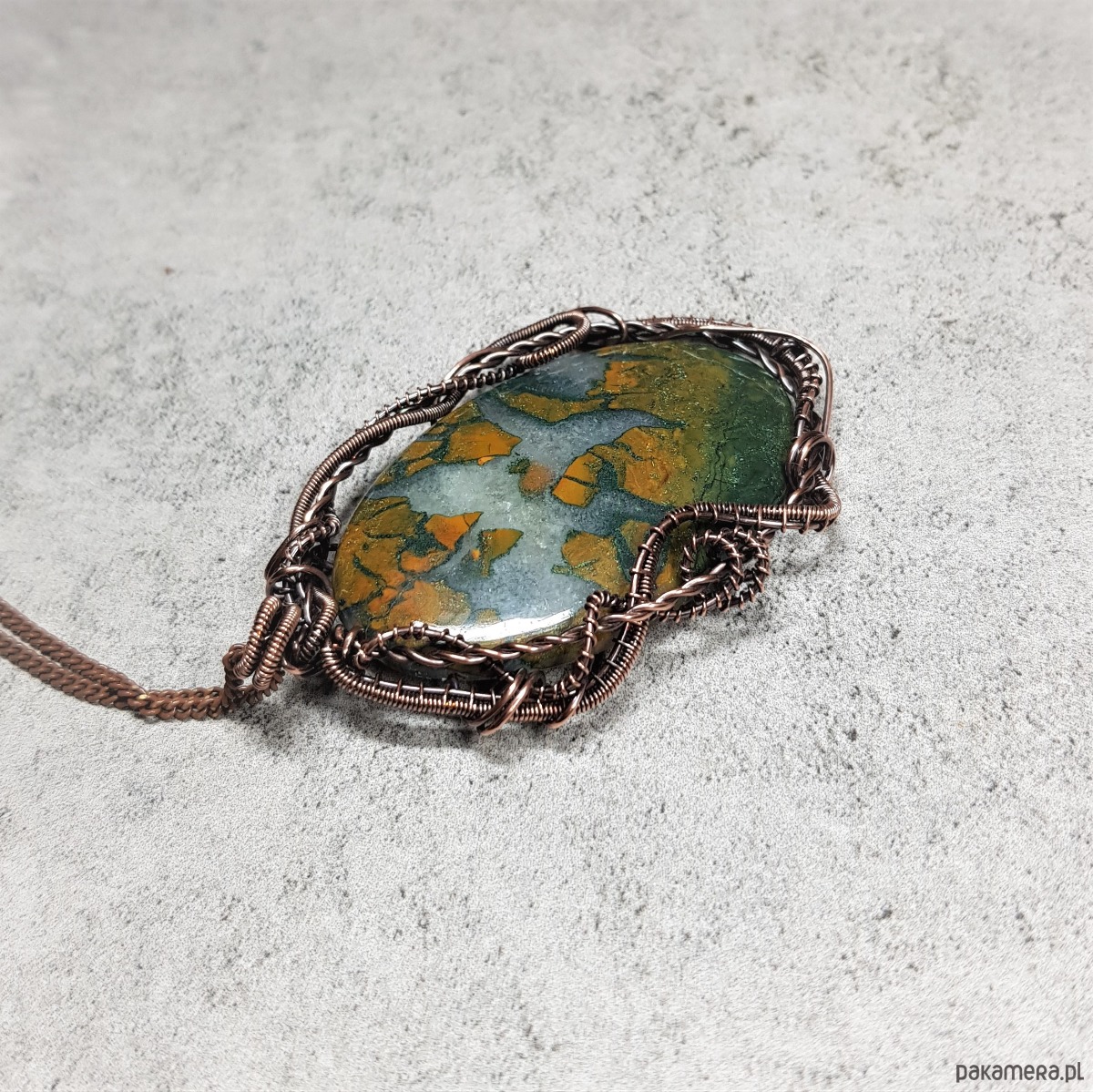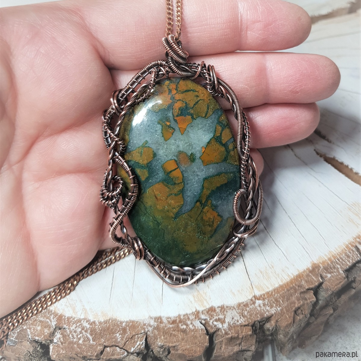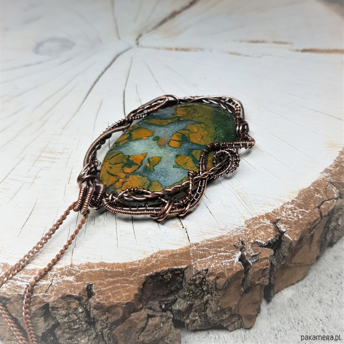 Naszyjnik zrobiony ręcznie w miedzi pracochłonną techniką wire-wrappingu którego głównym elementem jest sporych rozmiarów ciekawy agat z kryształem . Wymiary zawieszki 72x45 mm, zawieszony na łańcuszku standardowej długości około 50cm. Wisiorek jest oksydowany i następnie wypolerowany w celu uzyskania szlachetnego efektu postarzenia.