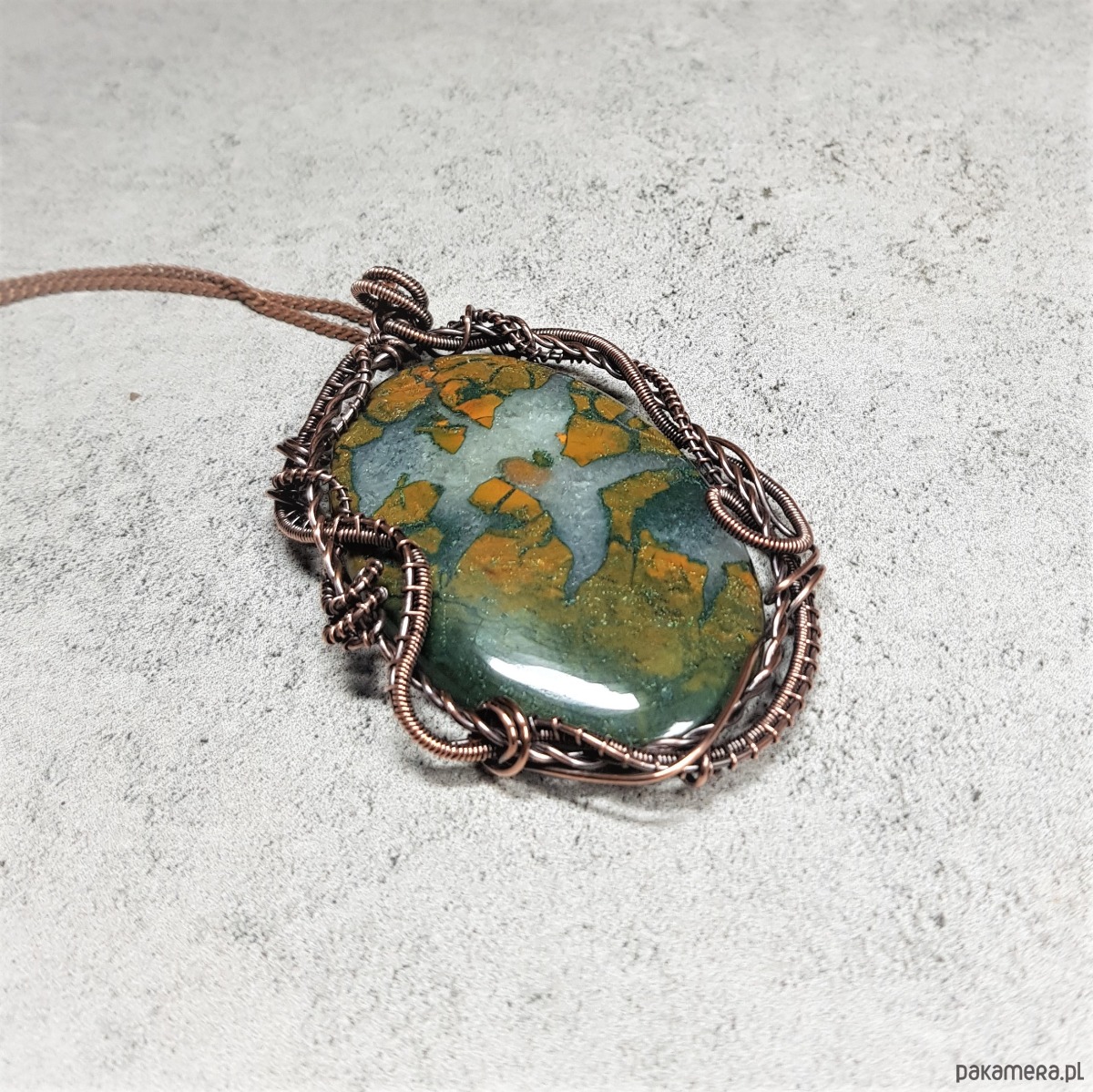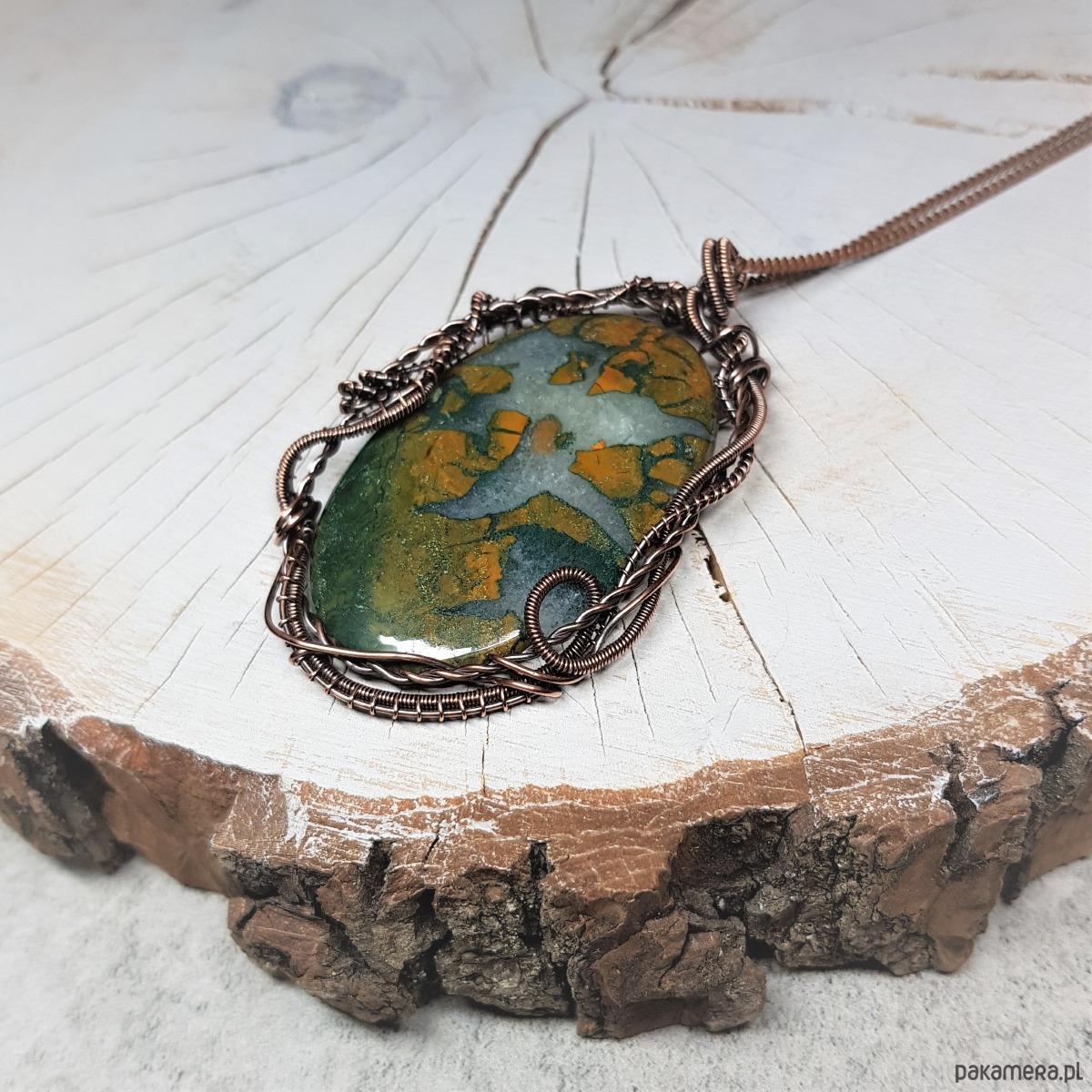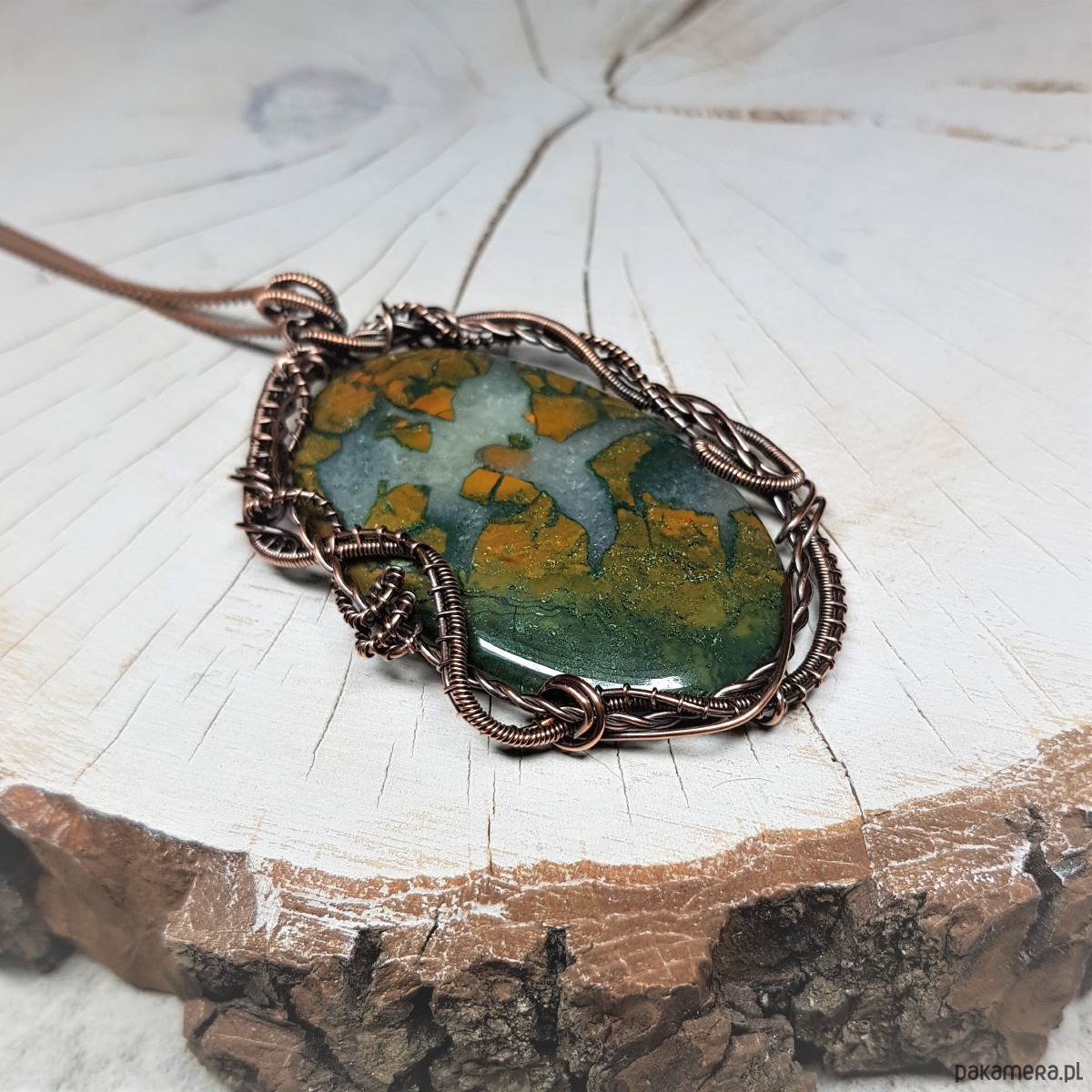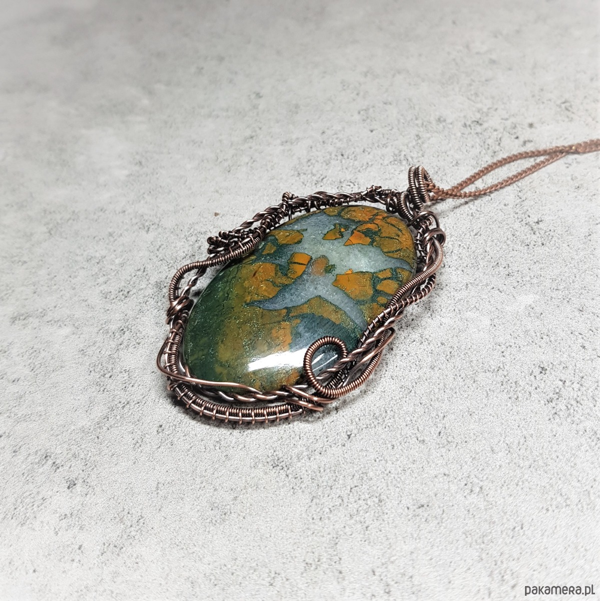 Naszyjnik zrobiony ręcznie w miedzi pracochłonną techniką wire-wrappingu którego głównym elementem jest sporych rozmiarów ciekawy agat z kryształem . Wymiary zawieszki 72x45 mm, zawieszony na łańcuszku standardowej długości około 50cm. Wisiorek jest oksydowany i następnie wypolerowany w celu uzyskania szlachetnego efektu postarzenia.