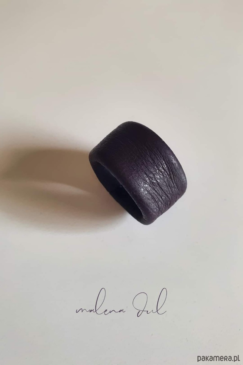 Duży awangardowy fioletowy bakłażanowy pierścionek ze skóry naturalnej