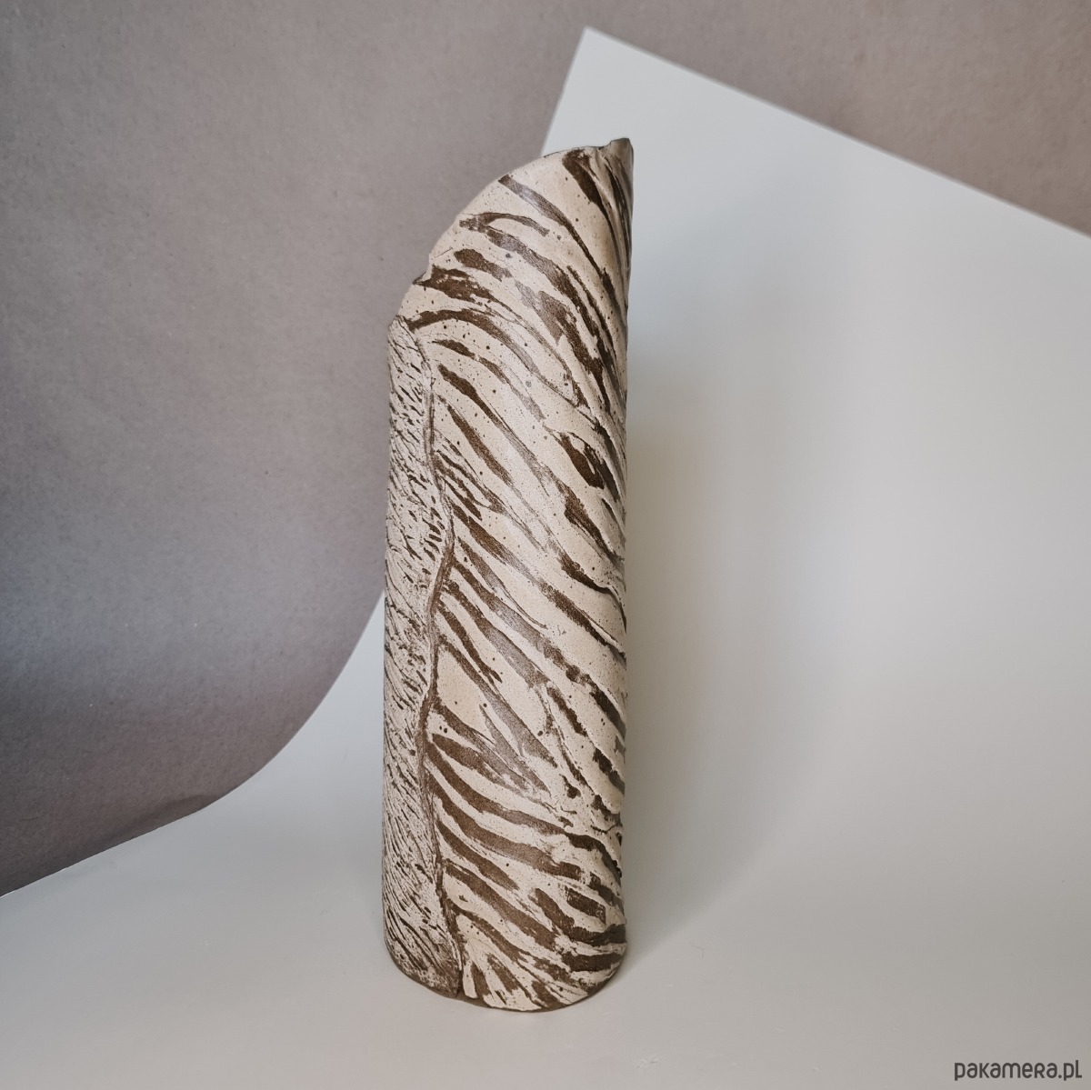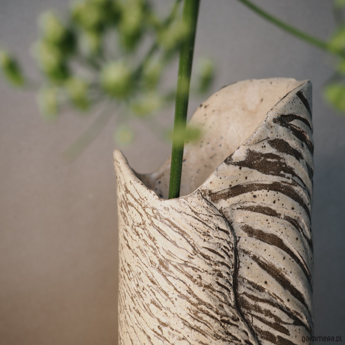 Beżowy wazon, który dzięki swej ciekawej formie może równocześnie służyć jako obiekt ceramiczny, tworząc piękny element aranżacji.