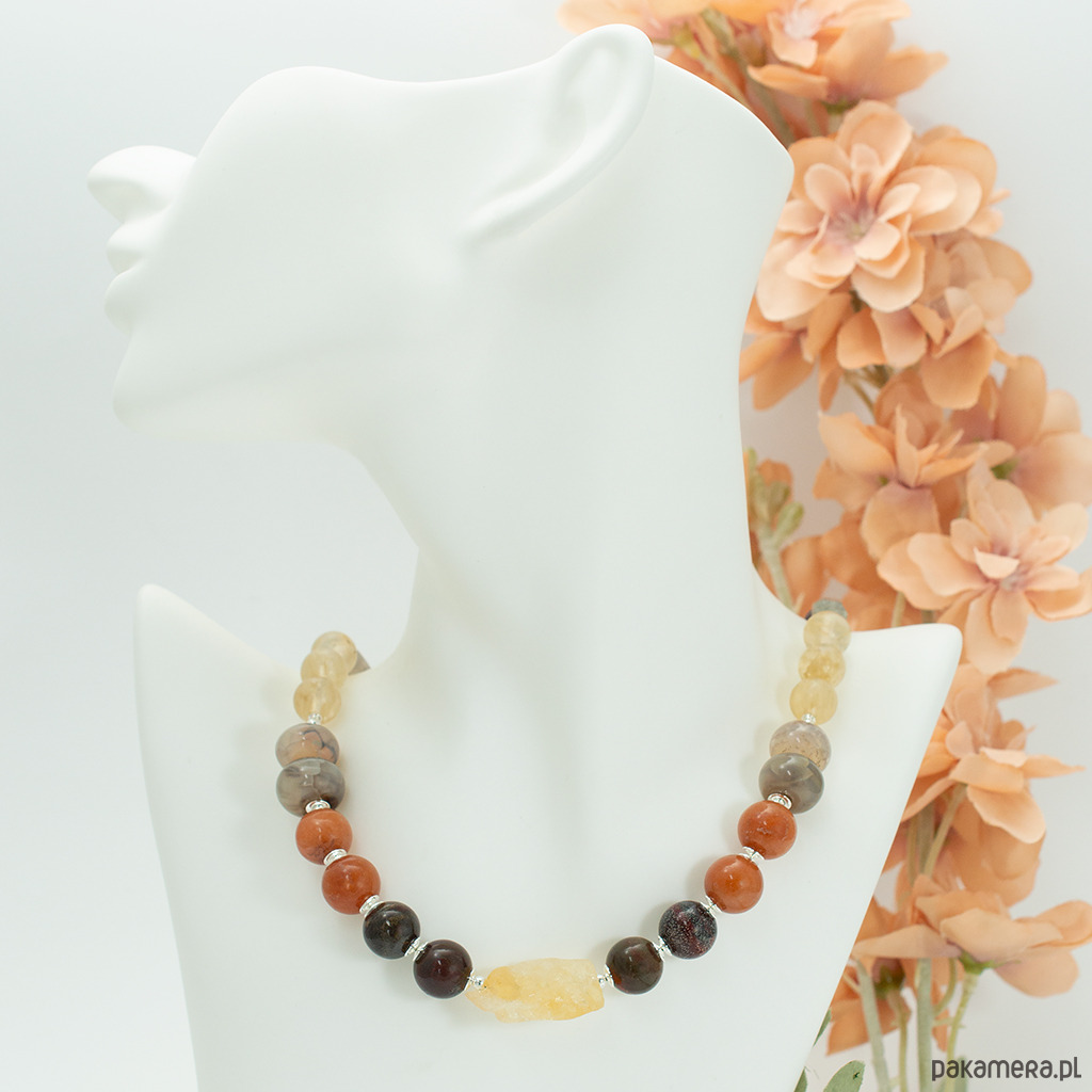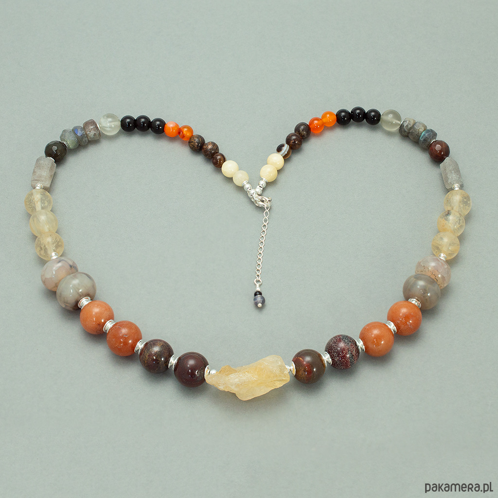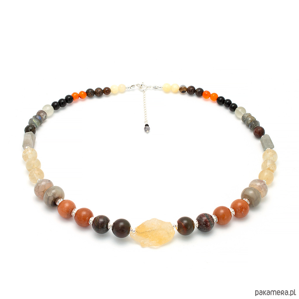 Naszyjnik wykonany ręcznie w naszej pracowni. Piękna, jesienna kolorystyka: brąz, żółty, pomarańcz z dużymi kamieniami półszlachetnymi. Kamienie użyte do jego wykonania to cytryn, jaspis, marmur, agat, jadeit, labradoryt, bronzyt i opal. Jest on wykończony srebrem próby 925.
