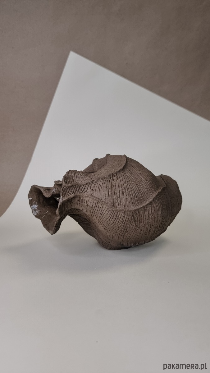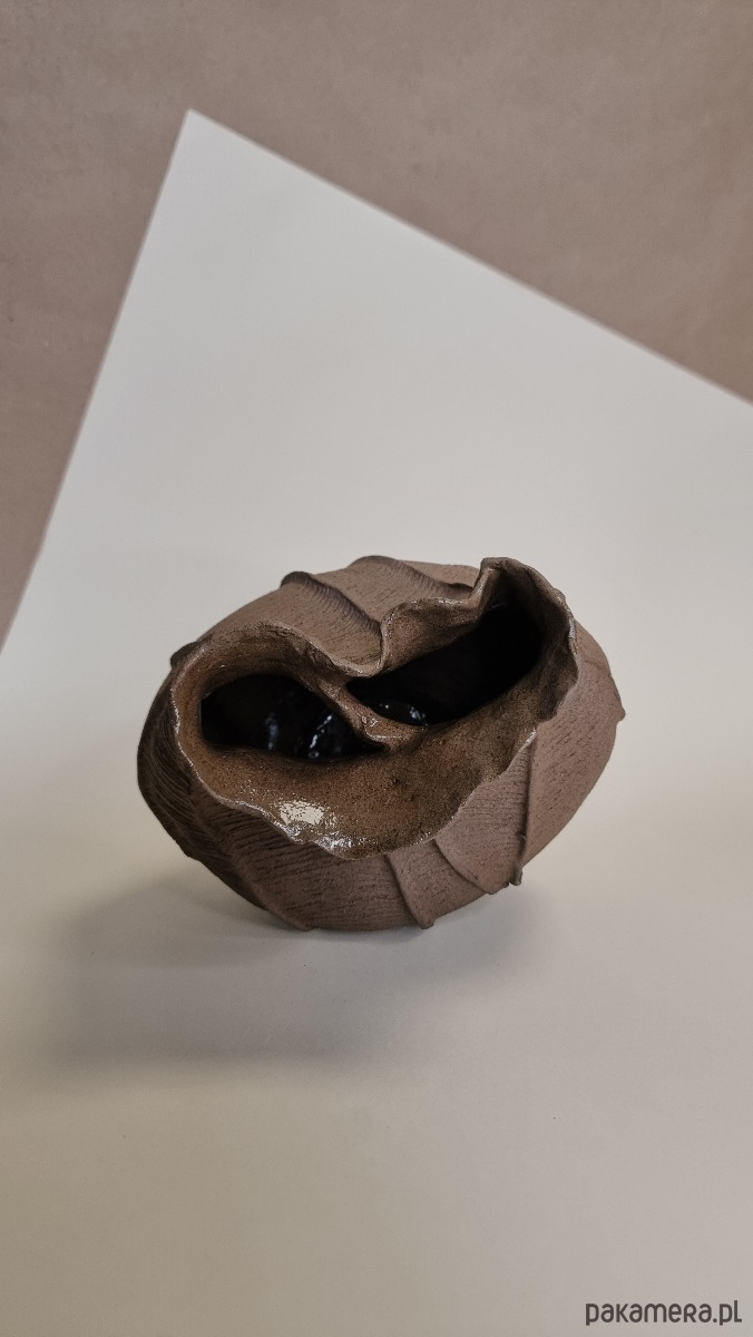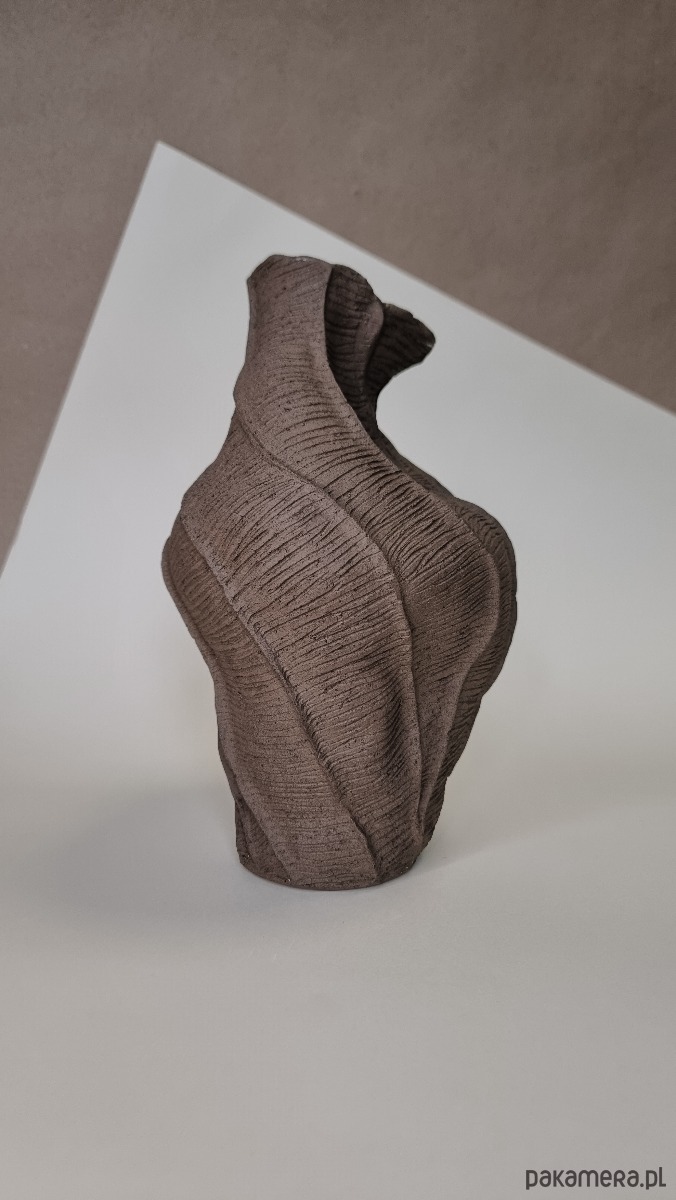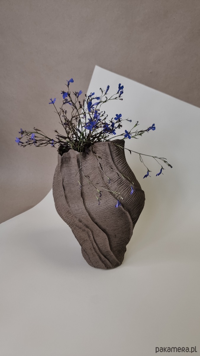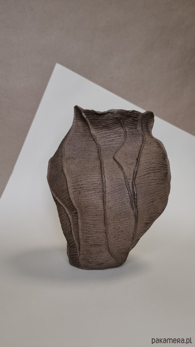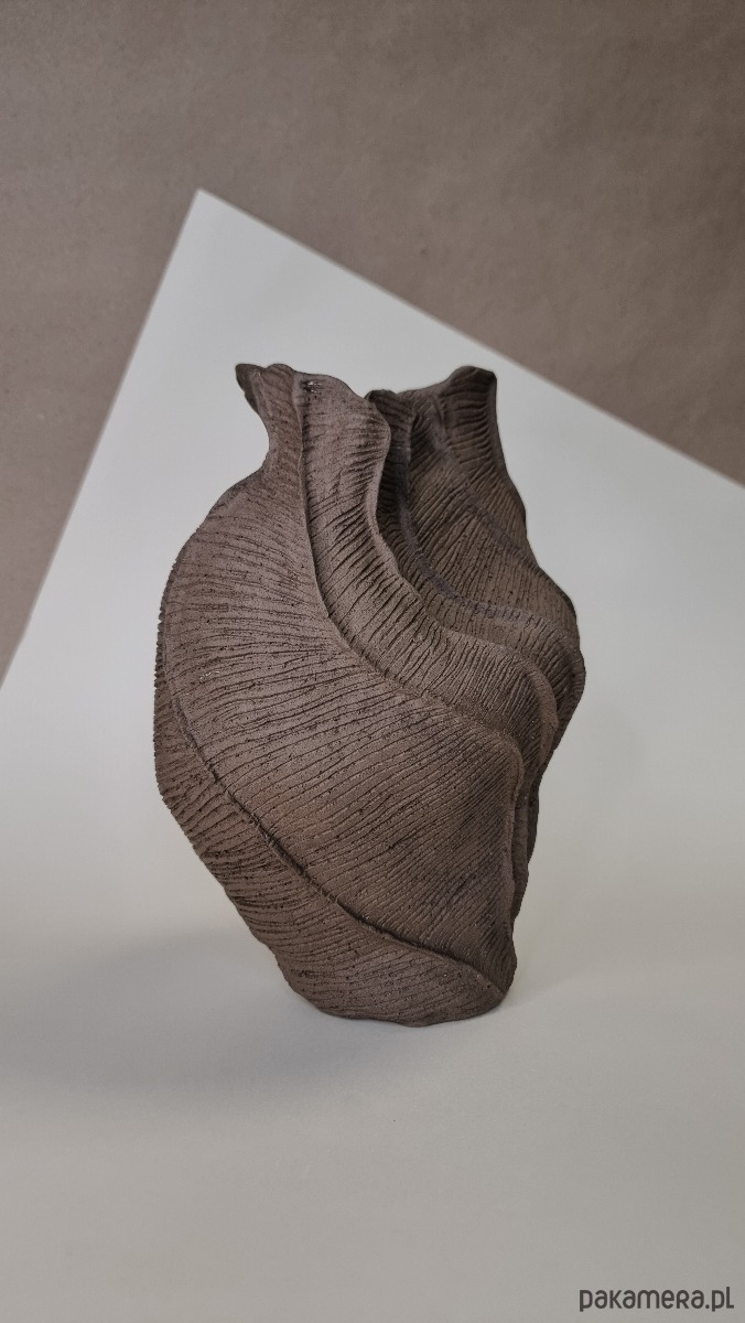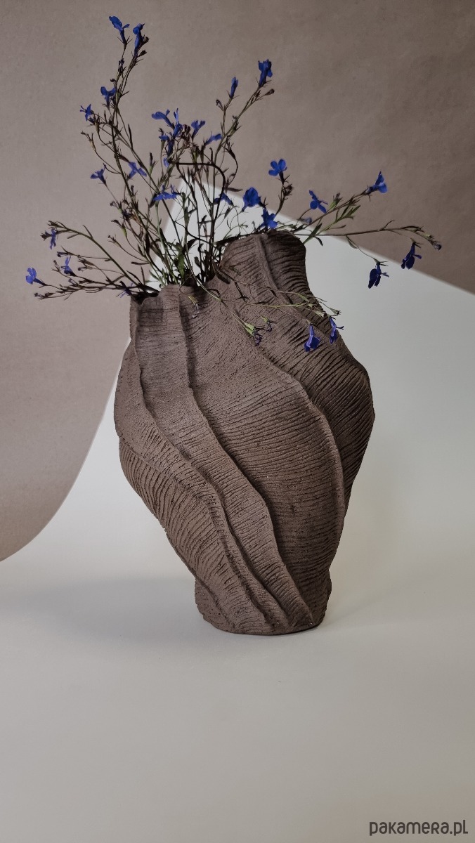 Brązowy wazon, który dzięki swej ciekawej formie może równocześnie służyć jako obiekt ceramiczny, tworząc piękny element aranżacji.