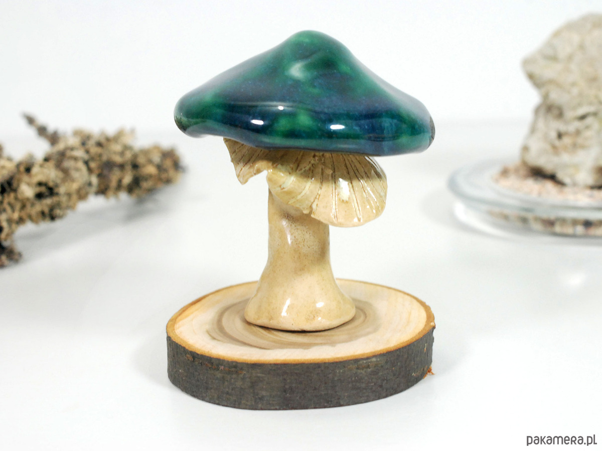 Zestaw zawiera - 1 duży ceramiczny grzybek dekoracyjny + okrągła, drewniana podstawka do jego ustawienia.
