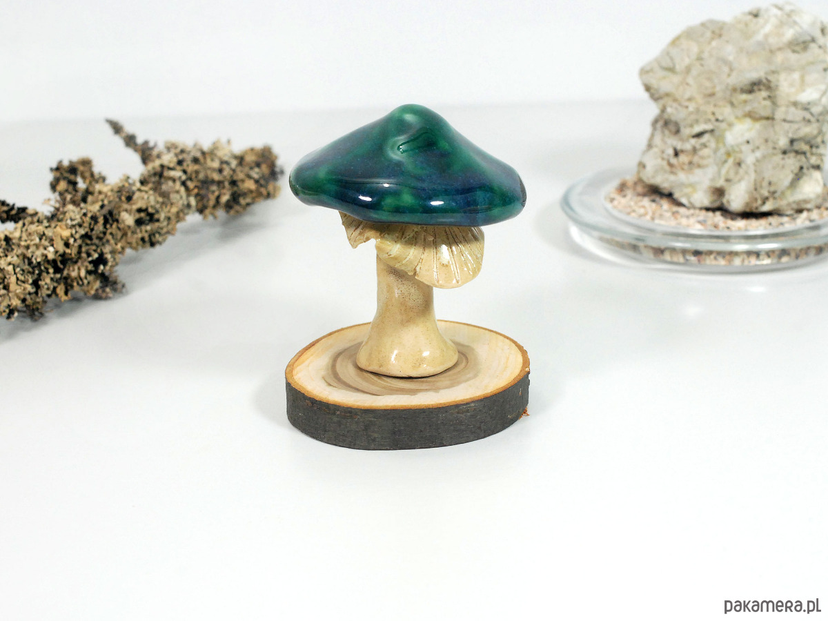Zestaw zawiera - 1 duży ceramiczny grzybek dekoracyjny + okrągła, drewniana podstawka do jego ustawienia.