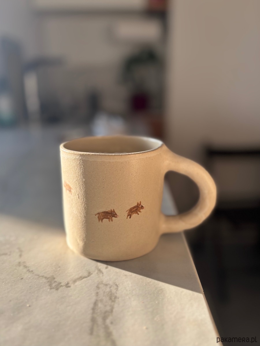 Ręcznie formowany ceramiczny kubek z uchem o unikatowym szkliwieniu ze słodkimi dzikami, idealny dla każdego miłośnika dzików.