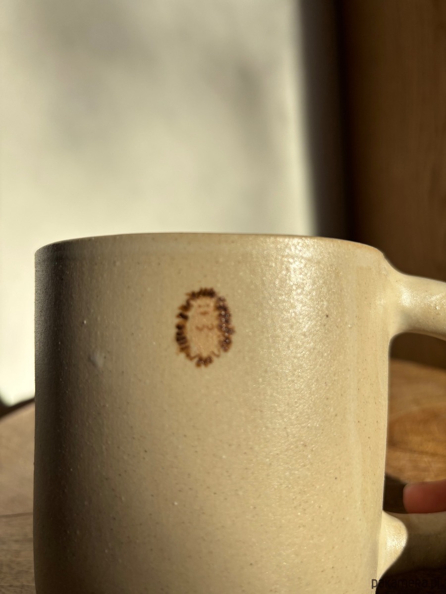 Ręcznie formowany ceramiczny kubek z uchem o unikatowym szkliwieniu ze słodkimi jeżami, idealny dla każdego miłośnika jeży.