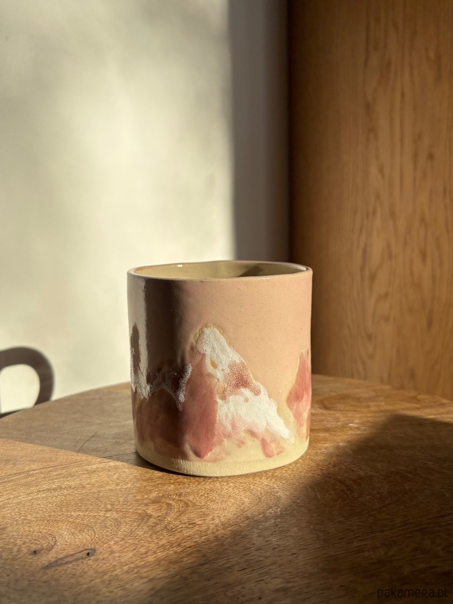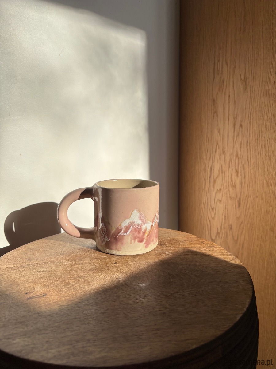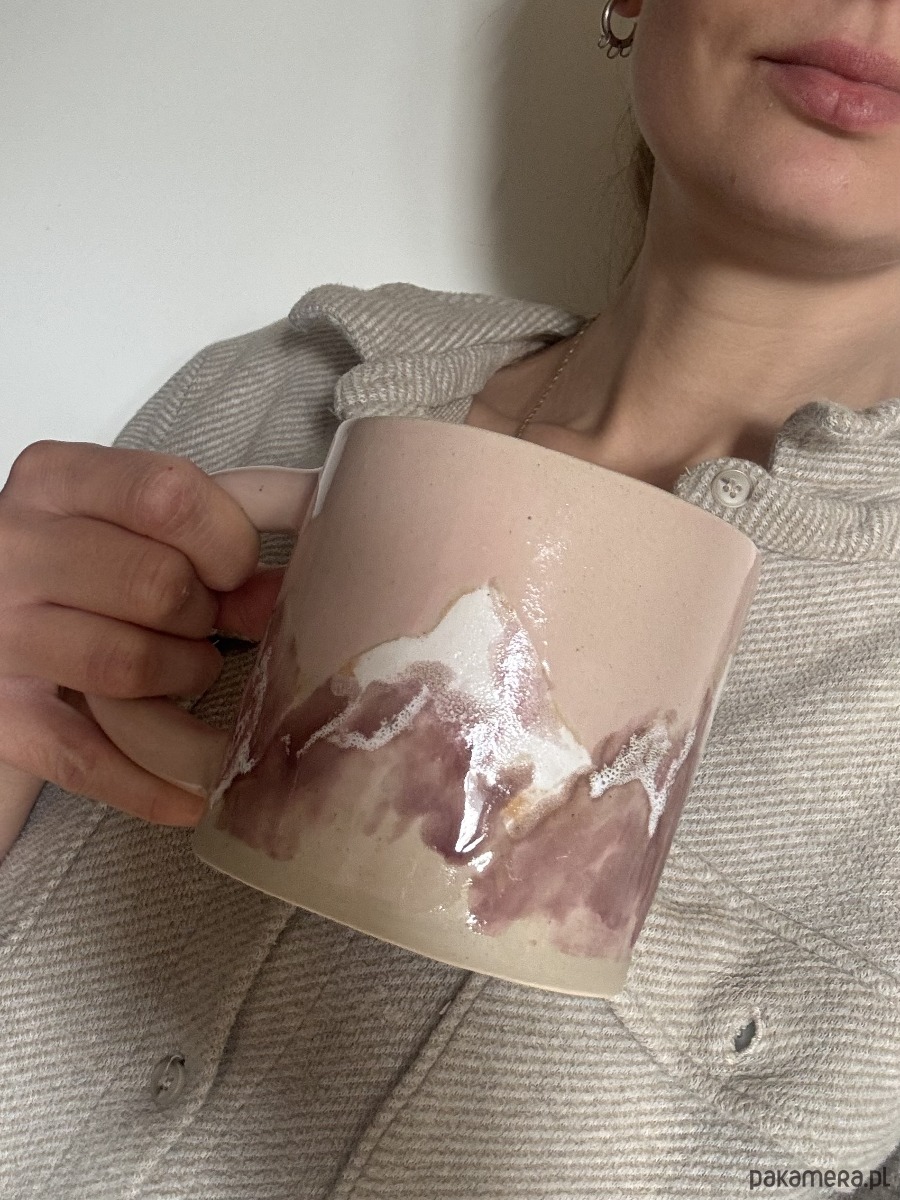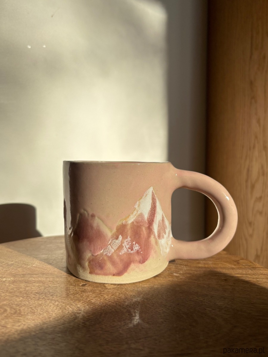 Ręcznie formowany ceramiczny kubek z uchem o unikatowym szkliwieniu inspirowanym polskimi górami.