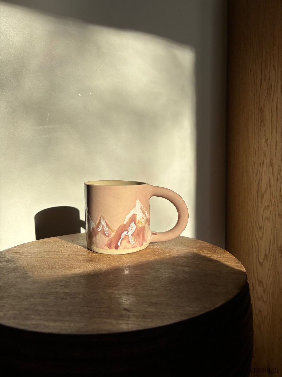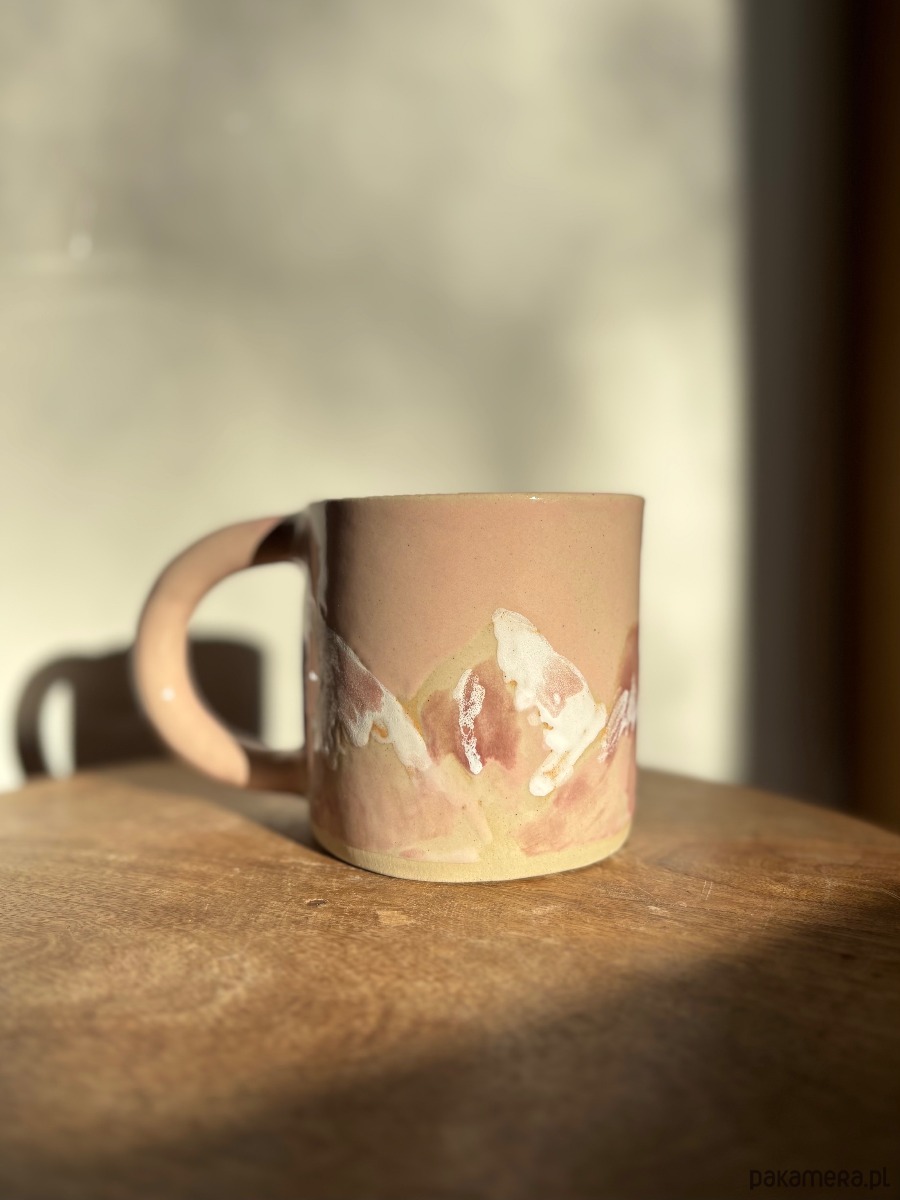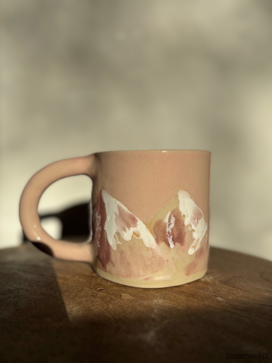 Ręcznie formowany ceramiczny kubek z uchem o unikatowym szkliwieniu inspirowanym polskimi górami.