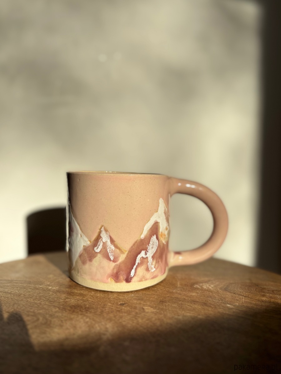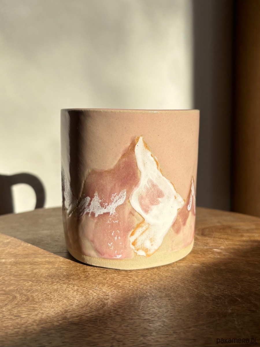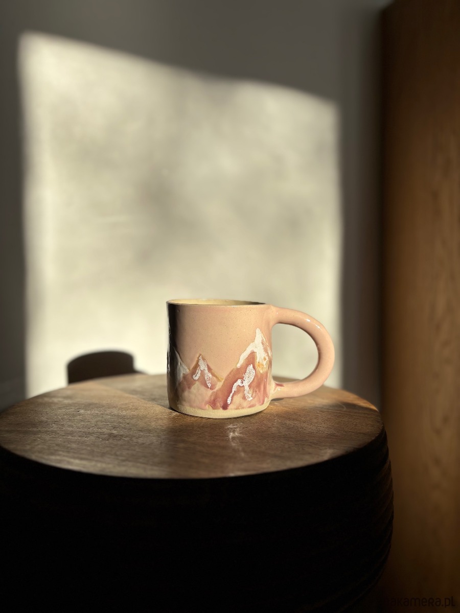 Ręcznie formowany ceramiczny kubek z uchem o unikatowym szkliwieniu inspirowanym polskimi górami.