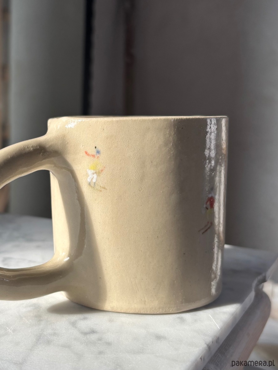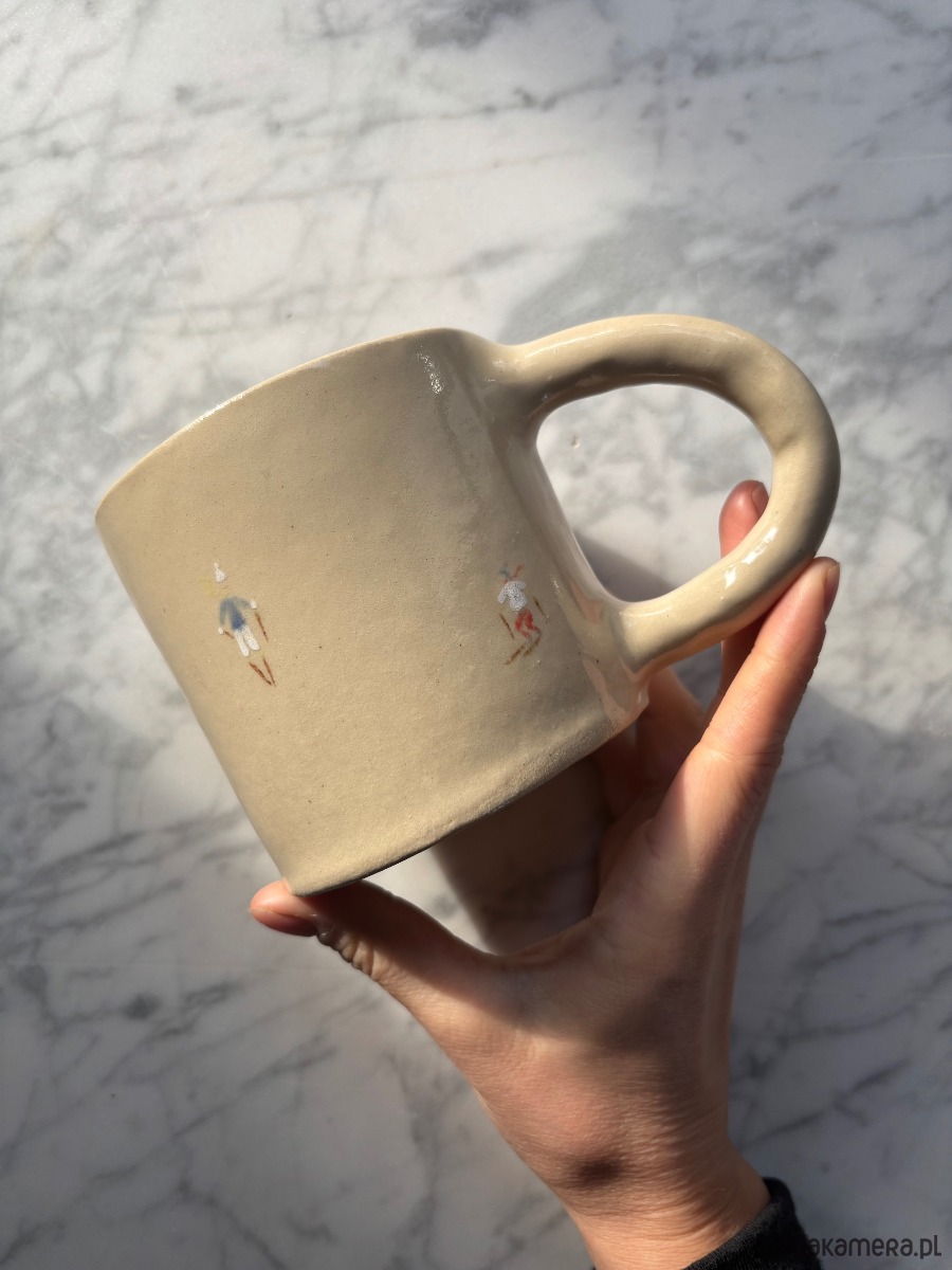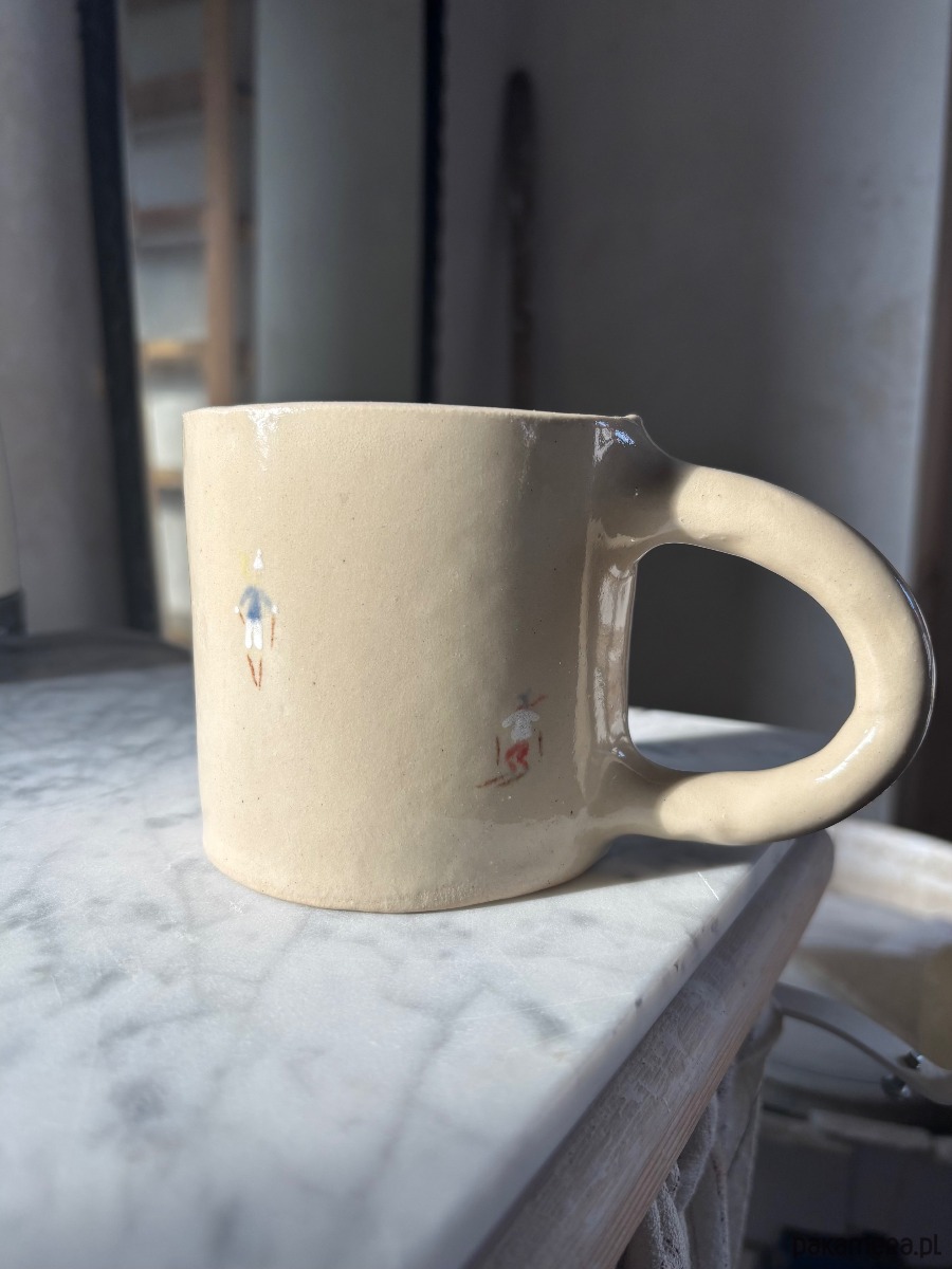 Ręcznie formowany ceramiczny kubek z uchem o unikatowym szkliwieniu inspirowanym górami, z ręcznie malowanymi narciarzami, idealny dla każdego miłośnika gór.