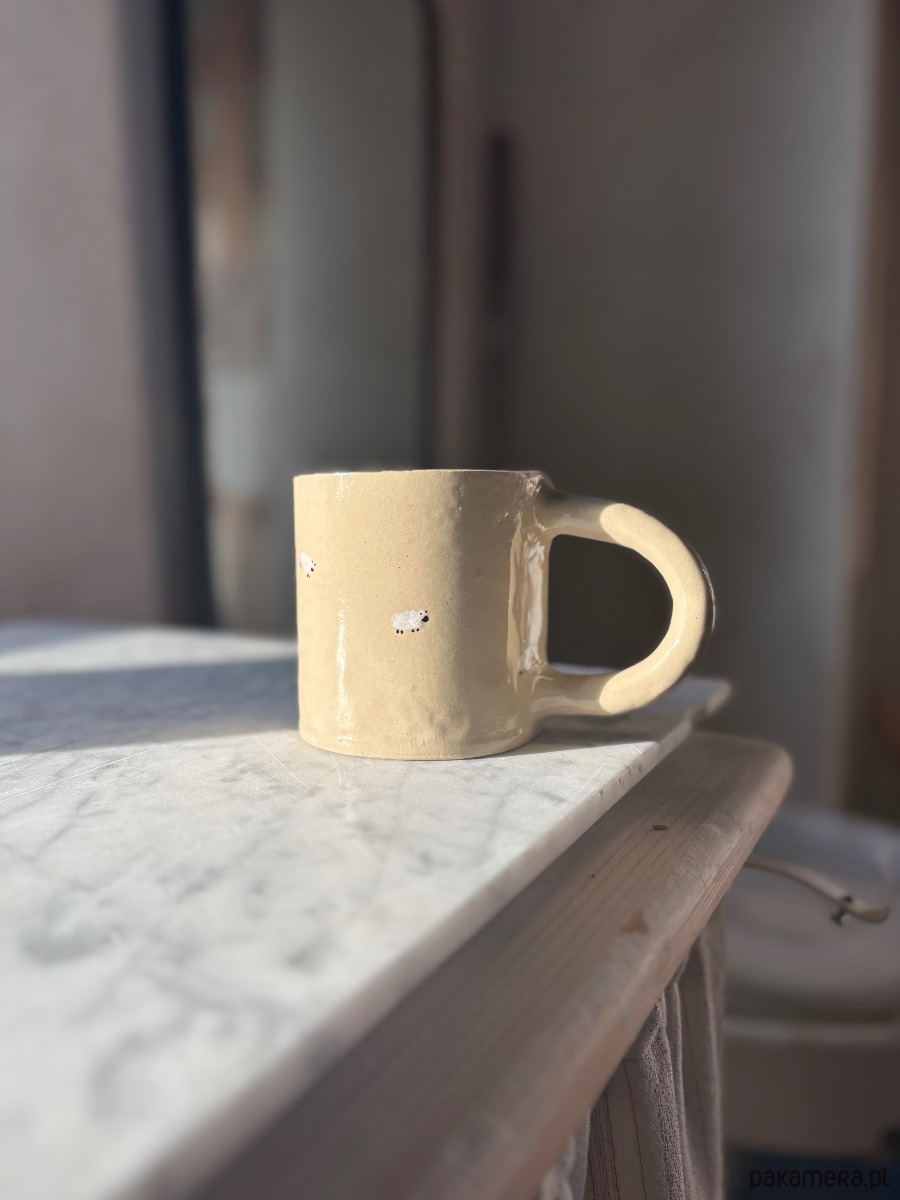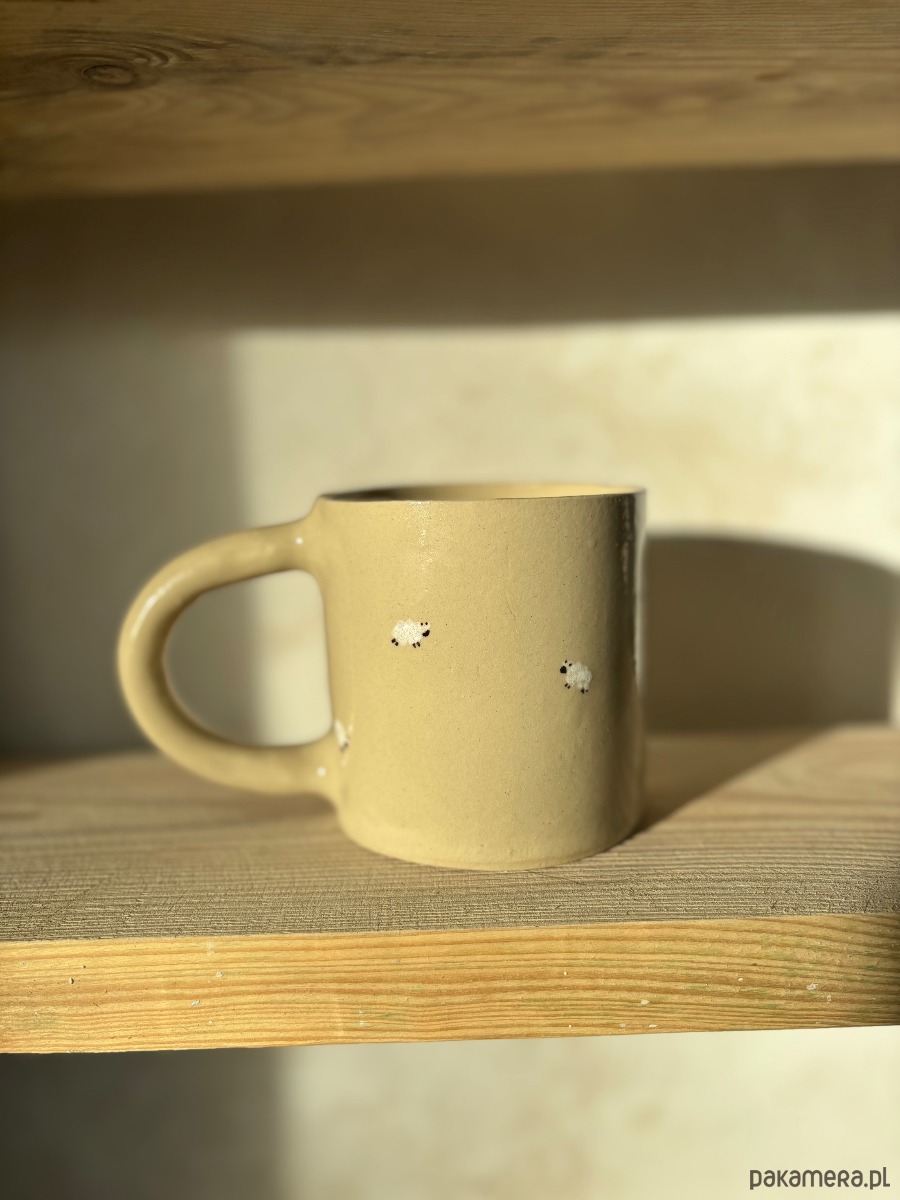 Ręcznie formowany ceramiczny kubek z uchem o unikatowym szkliwieniu inspirowanym górami, z ręcznie malowanymi owcami, idealny dla każdego miłośnika gór.