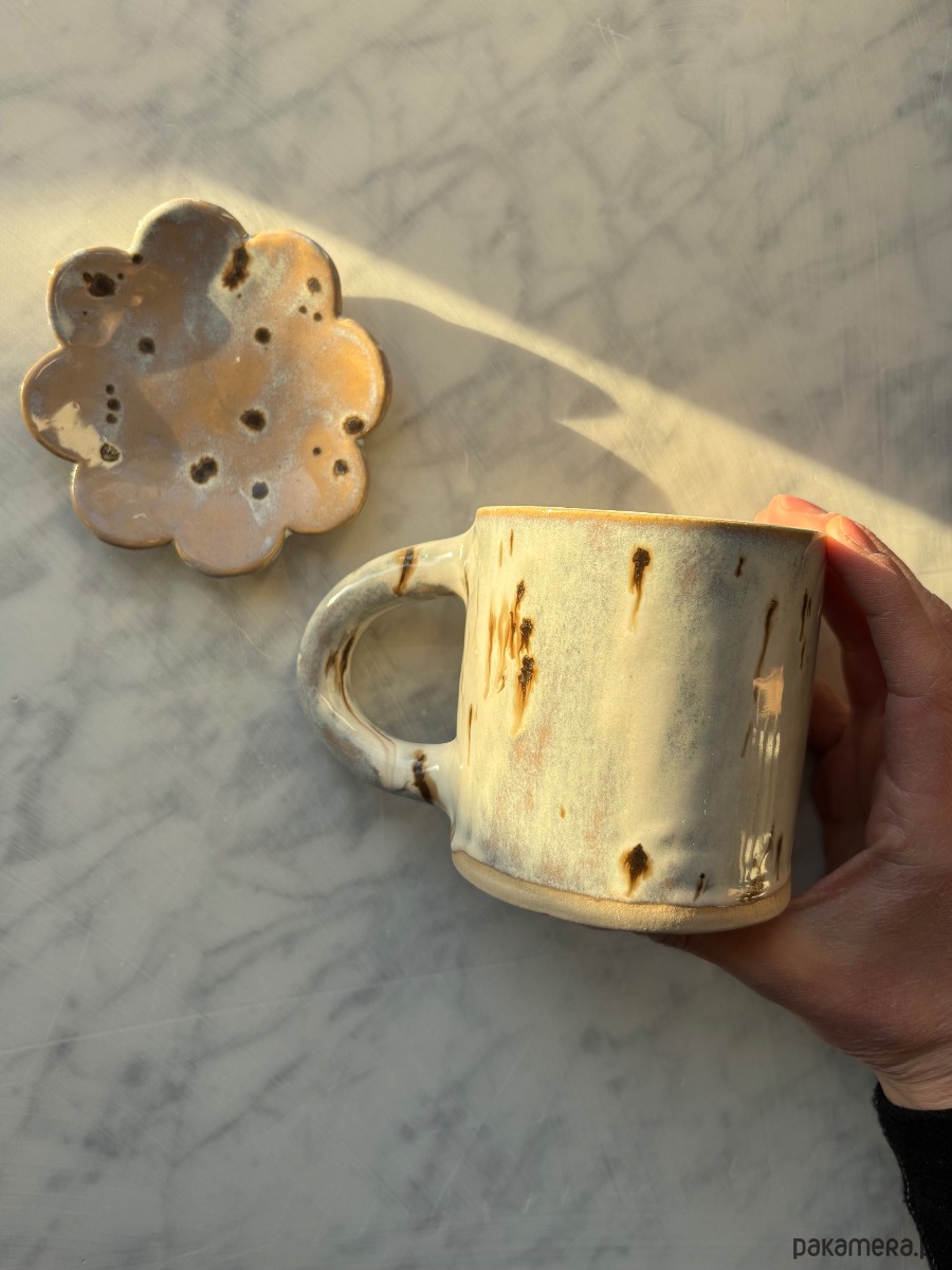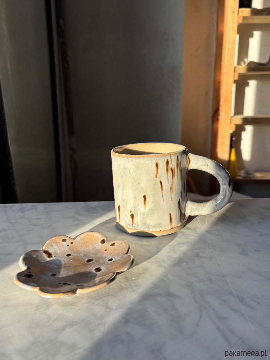 Ręcznie formowany ceramiczny kubek i mini talerzyk z uchem o unikatowym szkliwieniu.