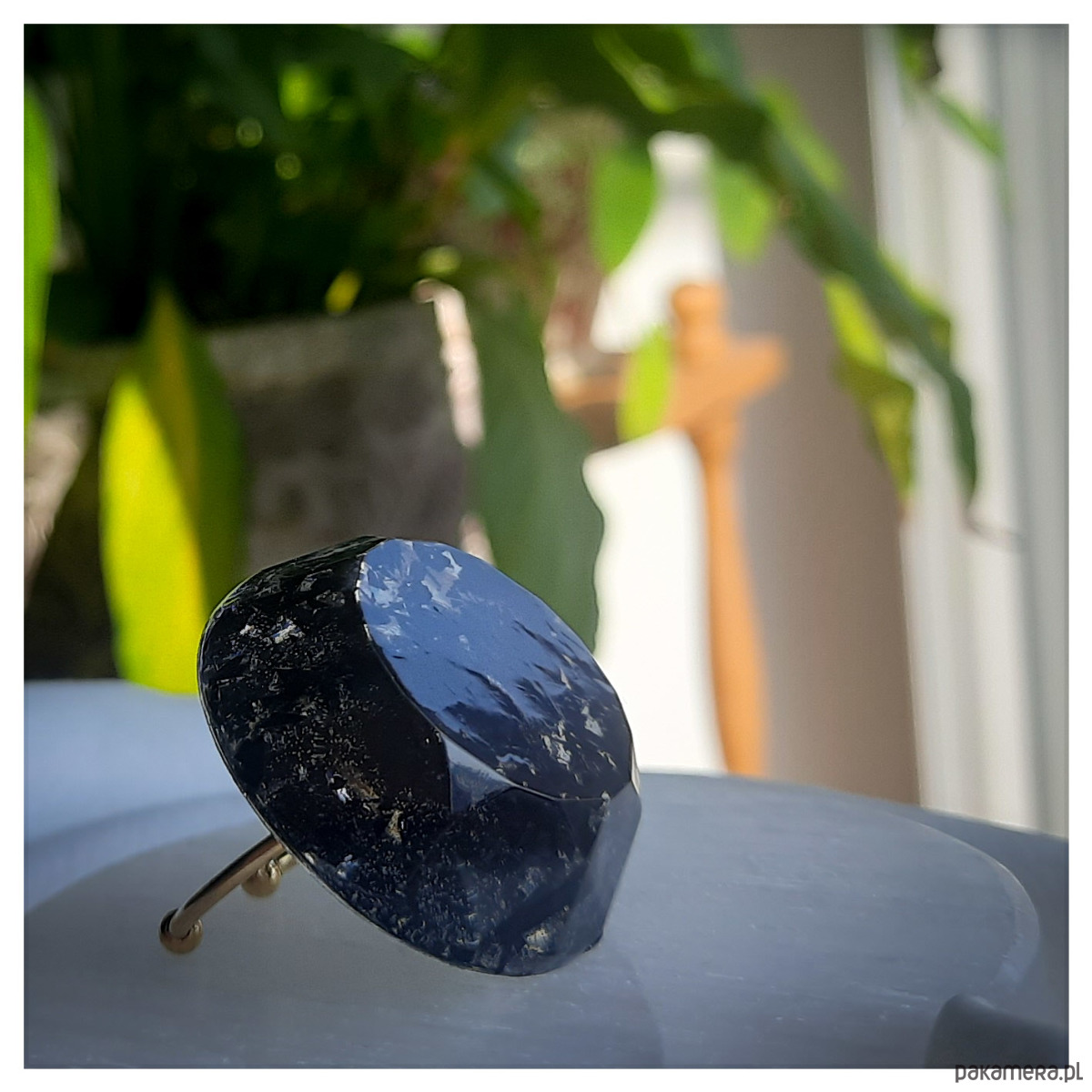 Duży pierścionek z zatopionymi w żywicy epoksydowej drobinkami w kolorze czarnym i na transparentnym tle.